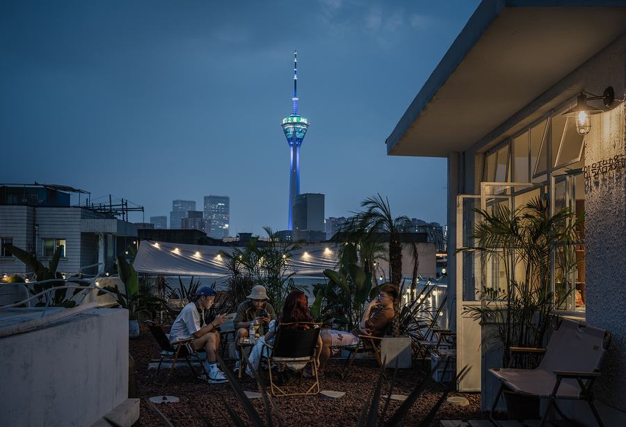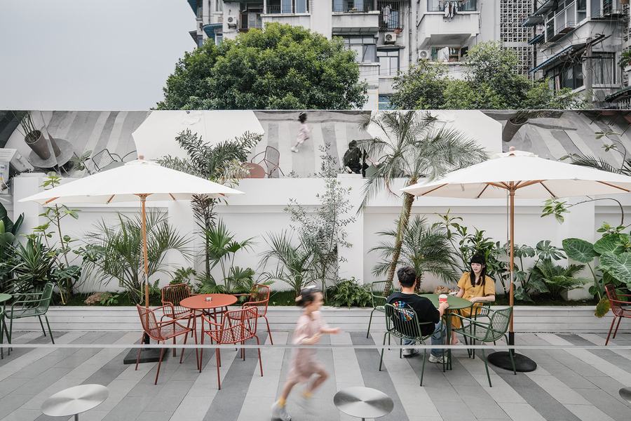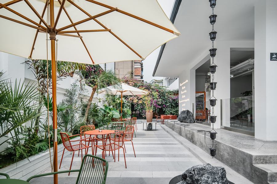 白墙后面是隔壁社区。为了让视觉空间更干净,我在墙上用镜面不锈钢做了一个前倾的形状,既达到了阻隔隔壁邻里环境的效果,又给室外空间的味道增加了一些视觉感。