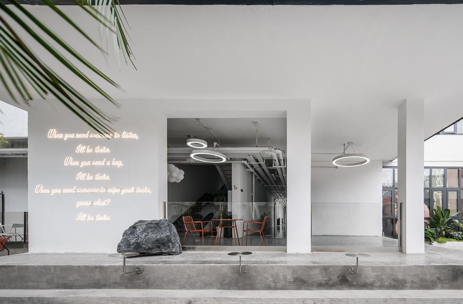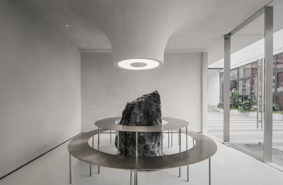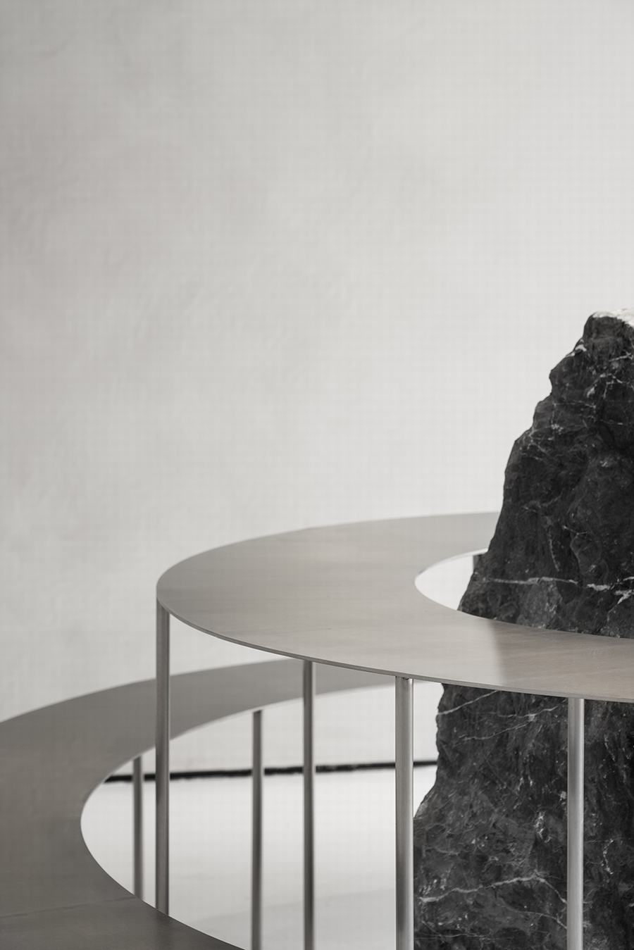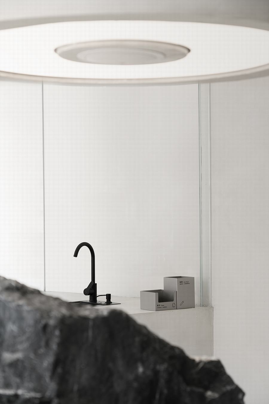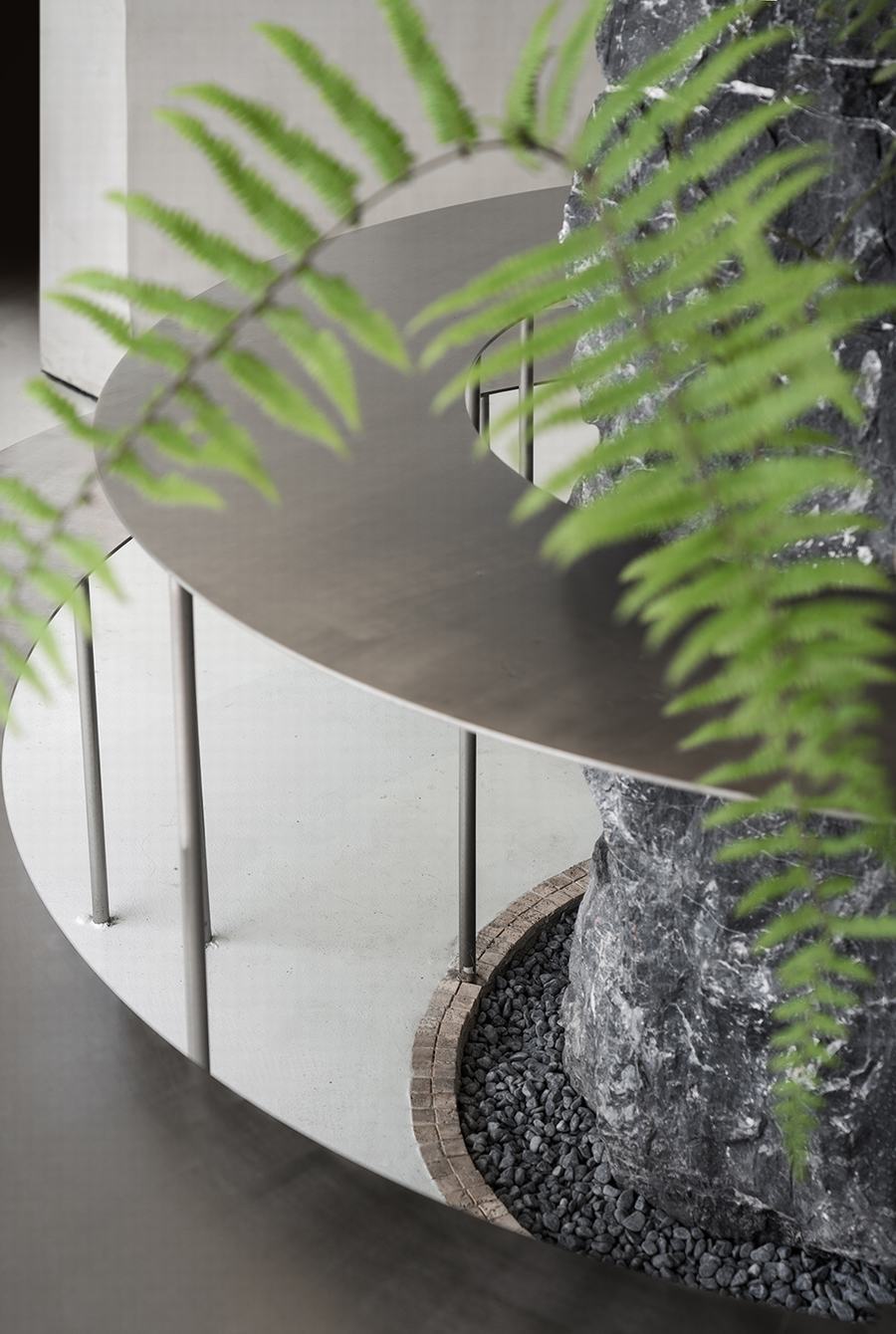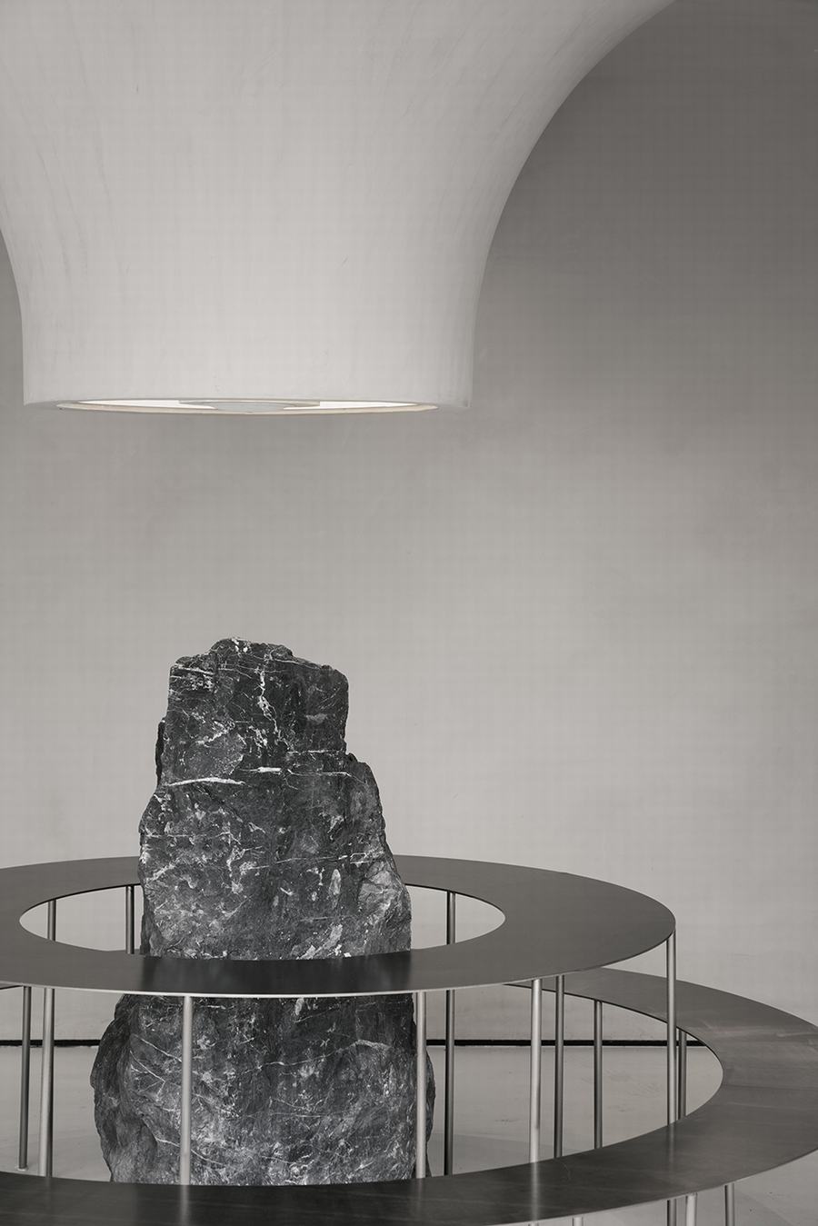 顶部造型是将光源与声音融为一体。音乐和光束从上到下流动,声波和光波击中石头,分散到空间中。唤醒大自然的精神。为了防止面对面坐着的尴尬,黑色山石的高度设计为一米四,刚好可以挡住两个人的视线。