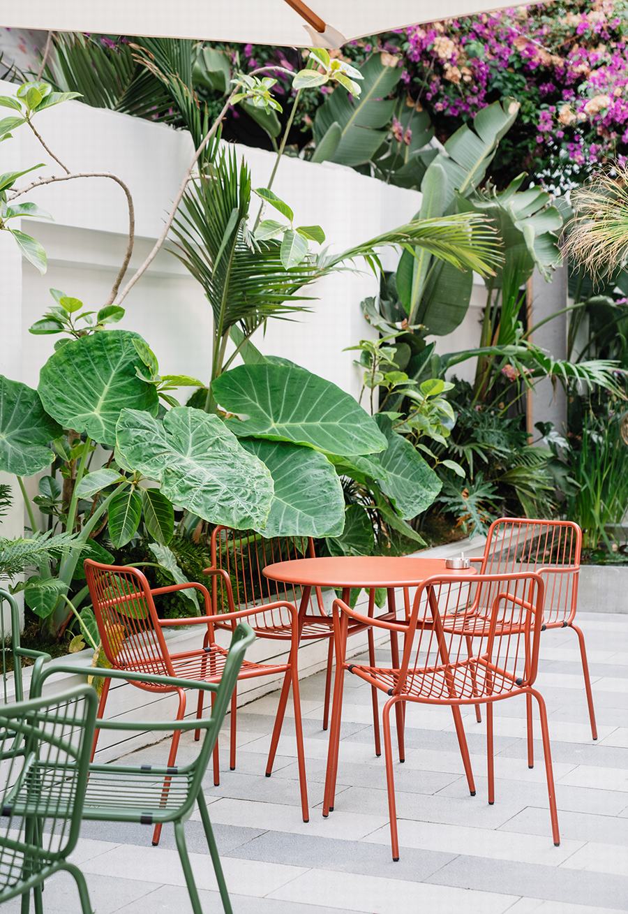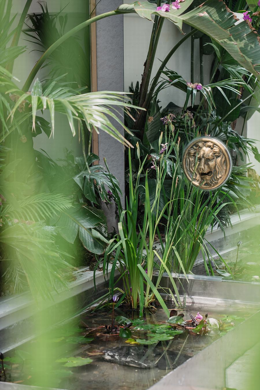 室外花园的睡莲池的灵感来自香奈儿的秘密花园。由不锈钢水池和镜面墙组成的花园体块呈现出清晰活泼的神秘感。镜面墙上的金色狮头喷泉是向独立女性的象征“可可·香奈儿”致敬。因为我觉得每个独立的女性都是一朵值得尊重的花。