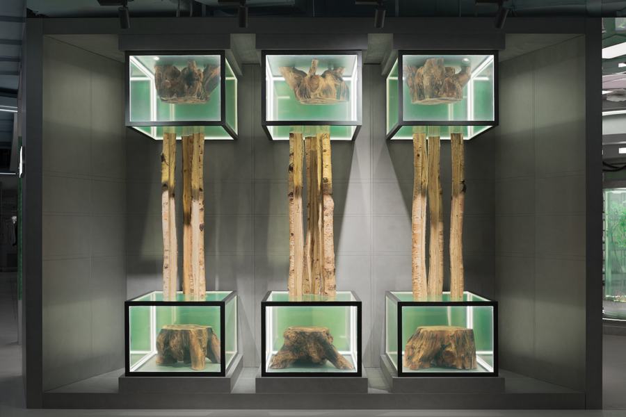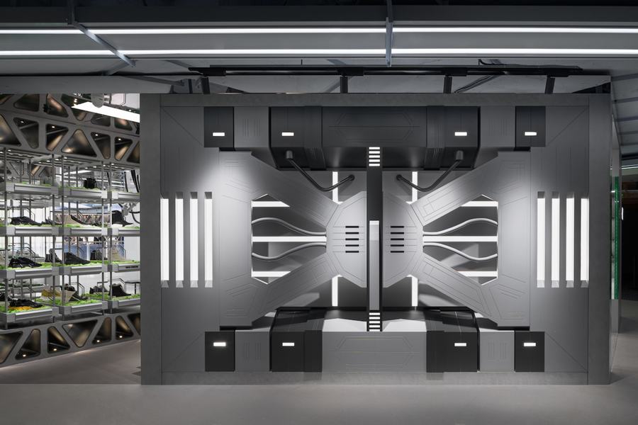 半不透明的绿色网格背光形式装饰了大型灰色金属门。继续往里看,中央的圆柱形装置看起来像一个培养皿,周围是一双被植物包围的鞋子,它通过管子连接到其他展示柜。这种罕见的有限掉落的鞋子混合了置物架和其他类似孵卵器的形式,暗指鞋子是在培养皿中生长的,就像生物物质一样。灰色的金属表面和镜面天花板占据了整个空间,但也点缀着一些植物。