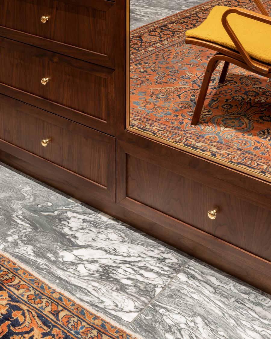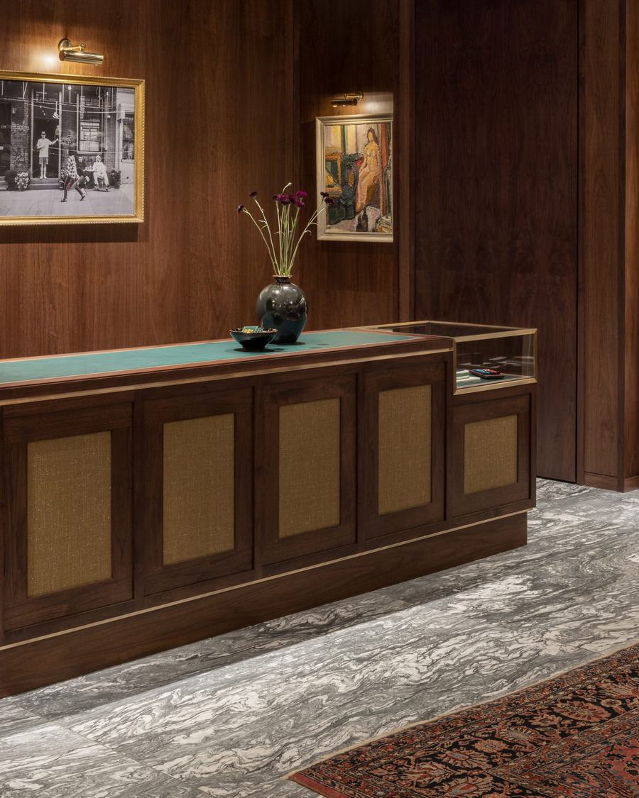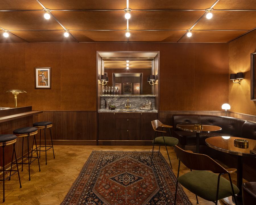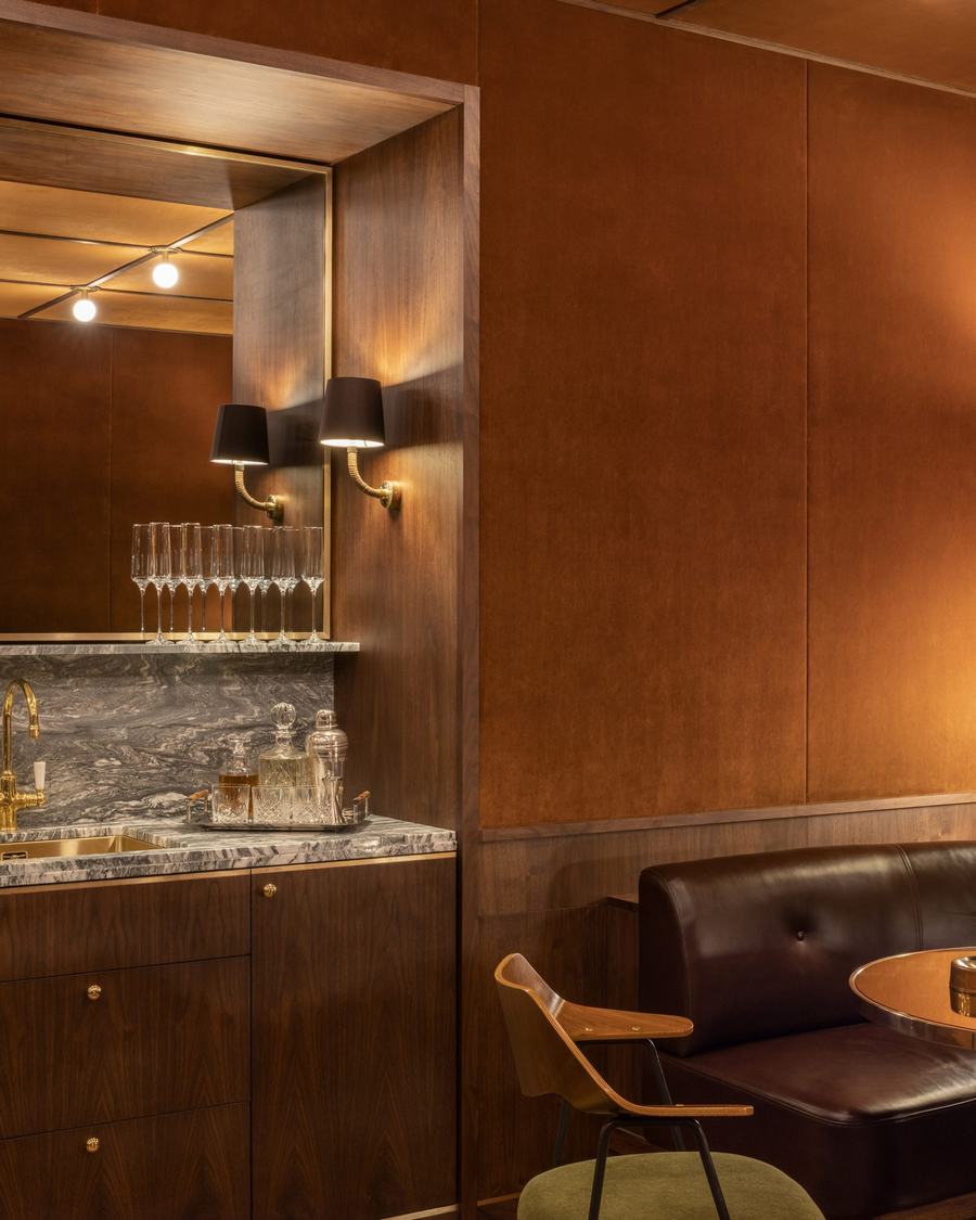 在建筑师富有质感的内饰的启发下,Posada 用深色胡桃木墙板、Cipollino 大理石地板、马赛克瓷砖和黄铜细节填充了空间,以及“居住”的细节,如古董波斯地毯和带有皮革镶嵌的定制家具。