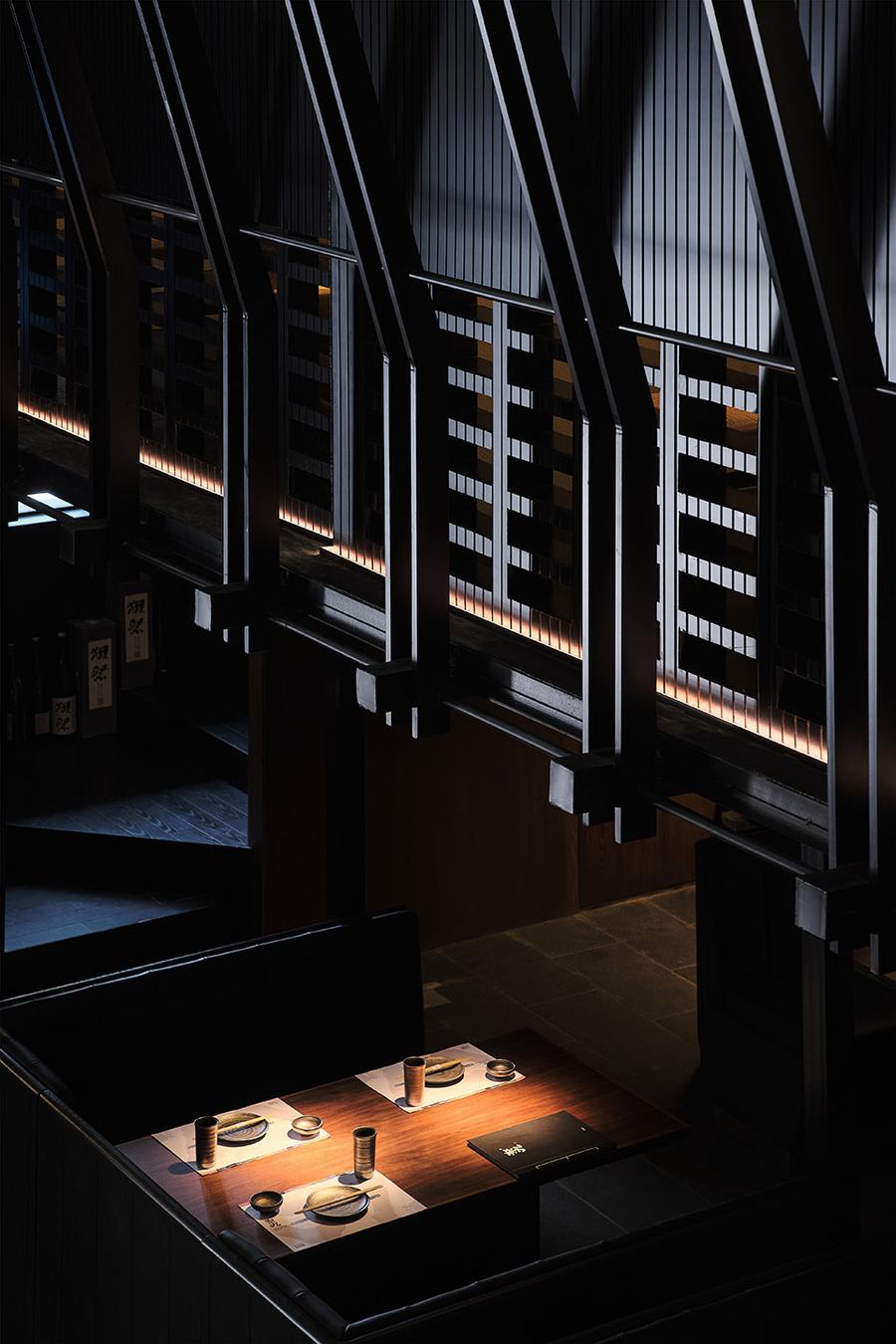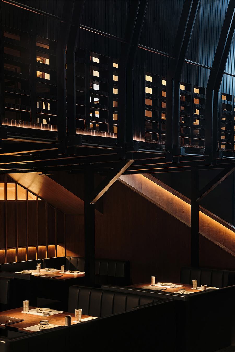 设计团队考虑了空间的高效布局。新建成的钢框架将紧凑的餐厅内部切割成两层空间。二楼包间的设计,围绕中庭的半封闭结构,满足了私人聚会的需要。首层重点还原传统居酒屋料理的开放氛围,以此来区分它,也是商业空间普遍化基础上的地方改造。