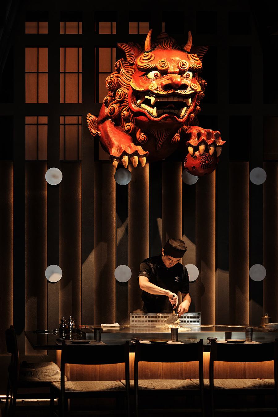 舞台中央的烹饪行为被顶部怪物装置的氛围烘托,灯光的运用强化了空间中央的视觉焦点,让人联想到日本武士葛饰北斋版画中奇形怪状的面具,给观众一种戏剧性的舞台感。