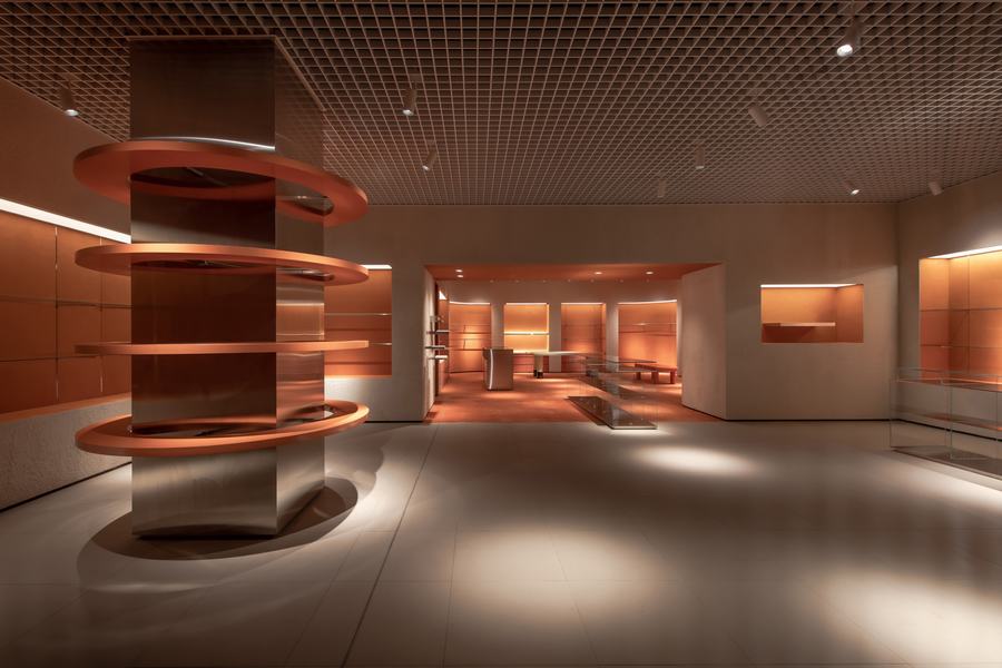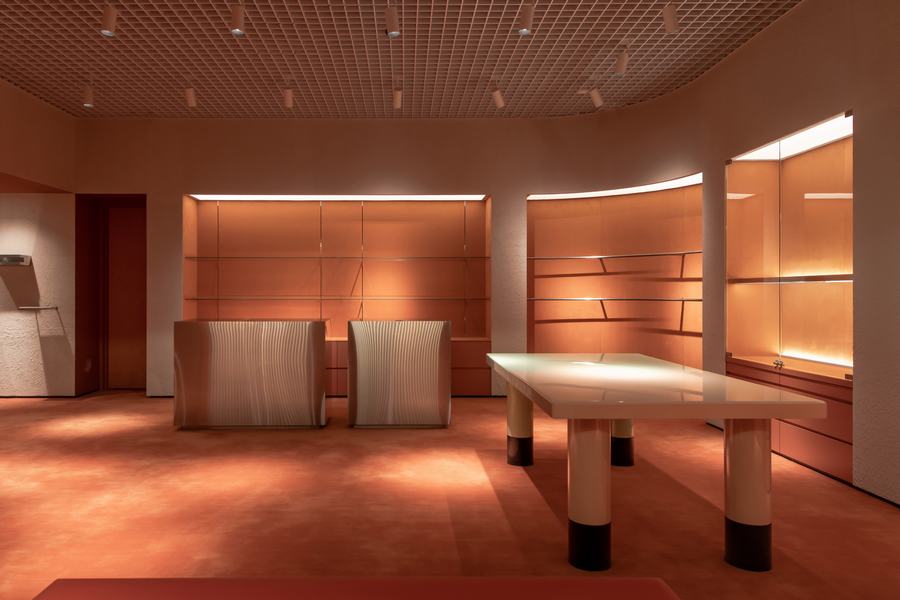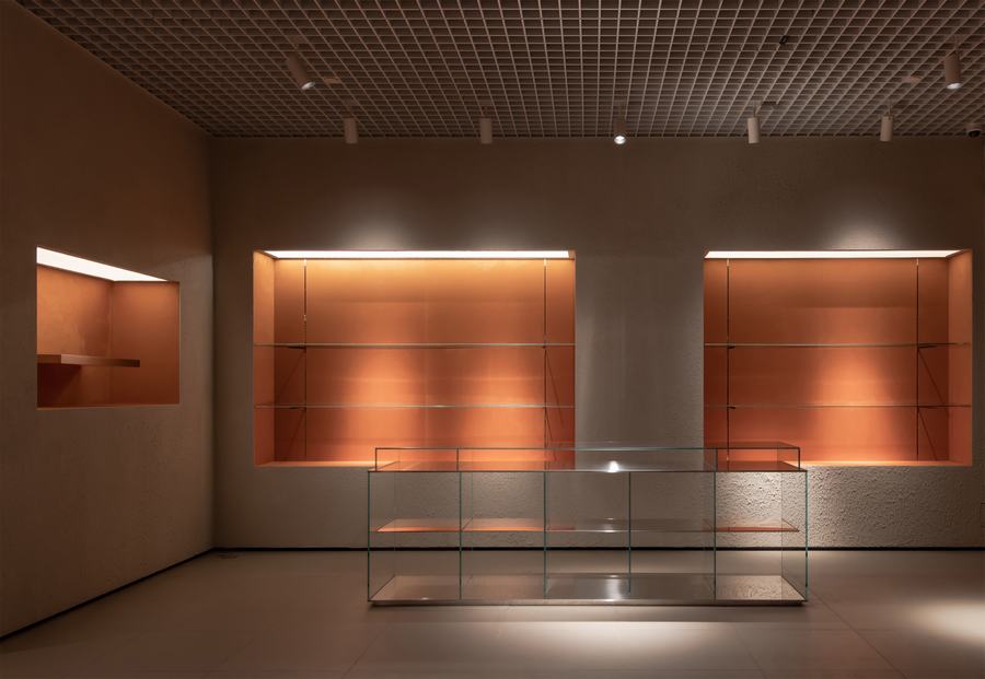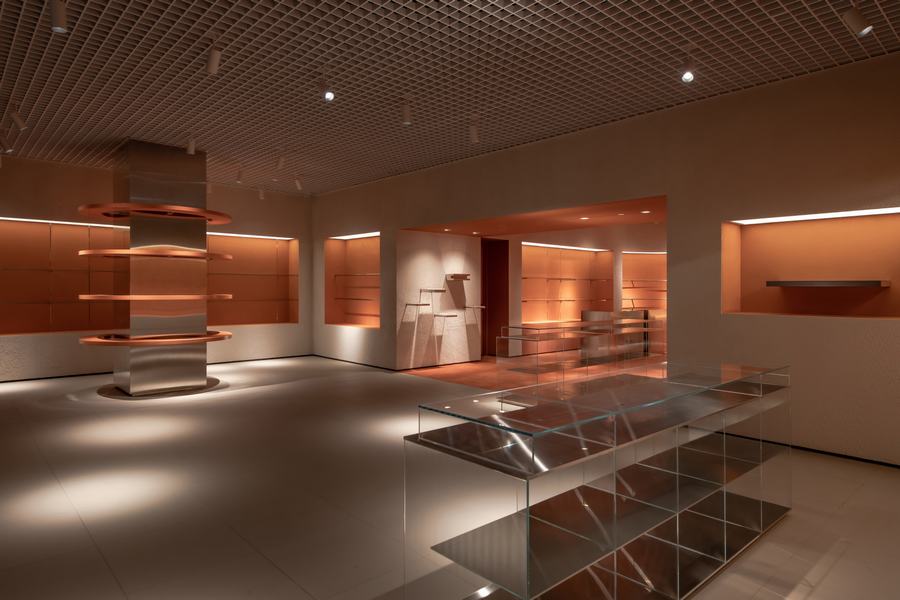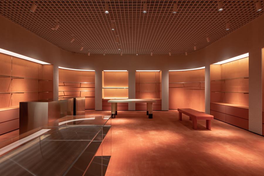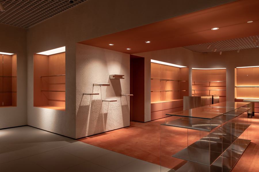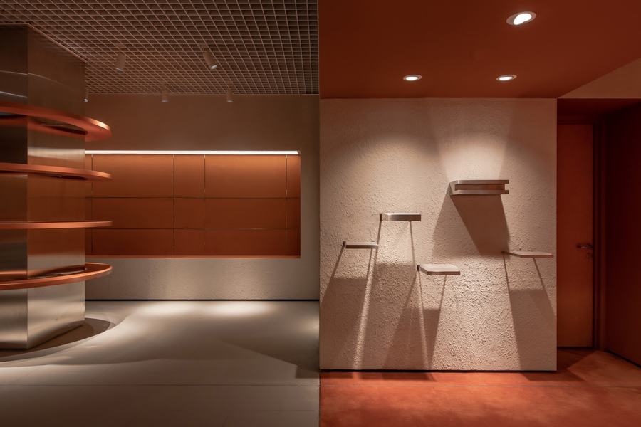 位于伦敦的Oskar Kohnen工作室为皮革配件生产商Bonia设计了马来西亚柔佛州的前哨。网格金属天花板、石膏、玻璃和皮革等普通材料的使用使奢华的环境更加悠闲。在353平方米的商店前面有一个巨大的矩形金属柱,周围是圆形的皮革软垫货架。粗糙的石膏墙与皮革的口音覆盖了空间的前半部分,而后半段以相反的比例的材料为特色。色调的橙棕色,类似于该品牌的字母交织的皮革印花,覆盖了墙壁、地毯和展示空间。金属和玻璃架子提供了材料对比使用的黄油皮革。