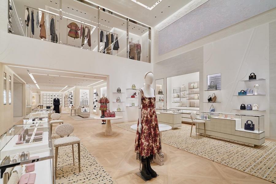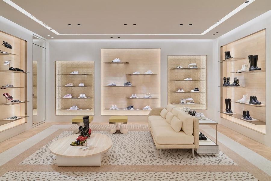 室内设计由著名建筑师彼得·马里诺(Peter Marino)监督,他创造了以白色为主的现代氛围,现代家具与现代家具无缝融合。看到柔和的白色和香槟铜配色方案,由显示器、固定装置和精选家具捕捉。除了家居系列外,这家商店还出售女士和男士服装、配饰、包袋、鞋子、珠宝、眼镜和手表。