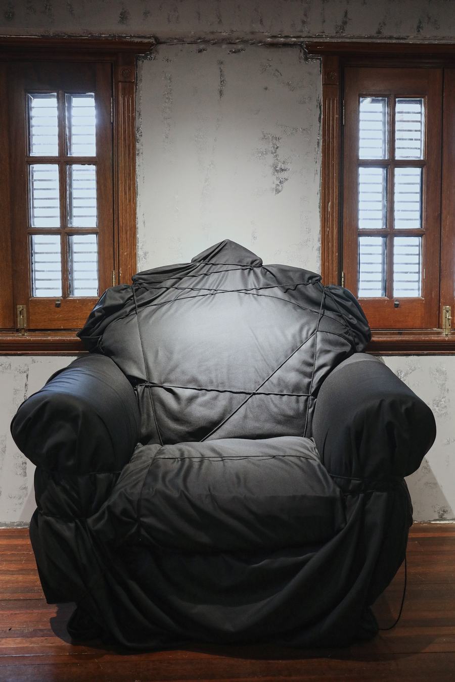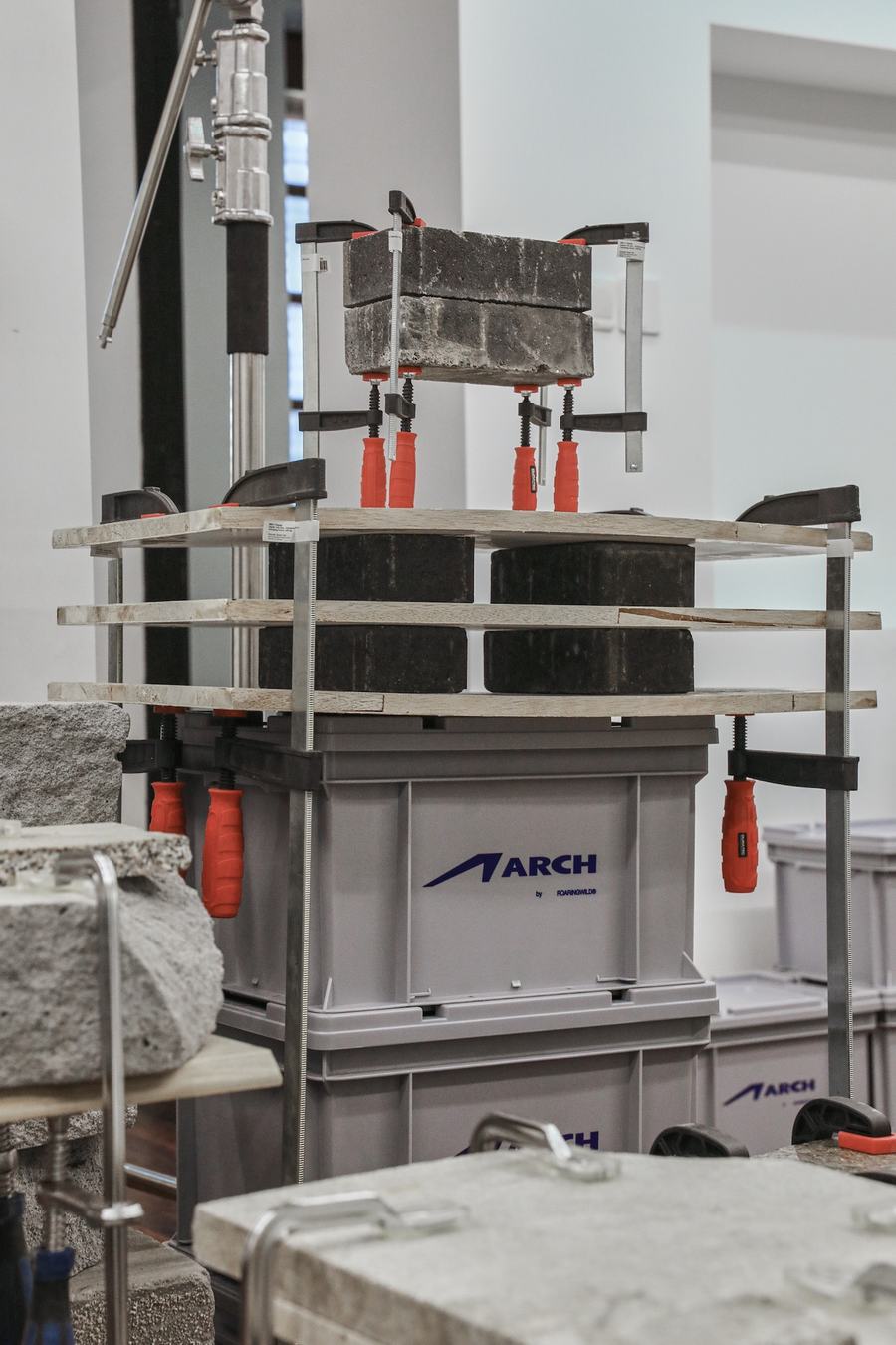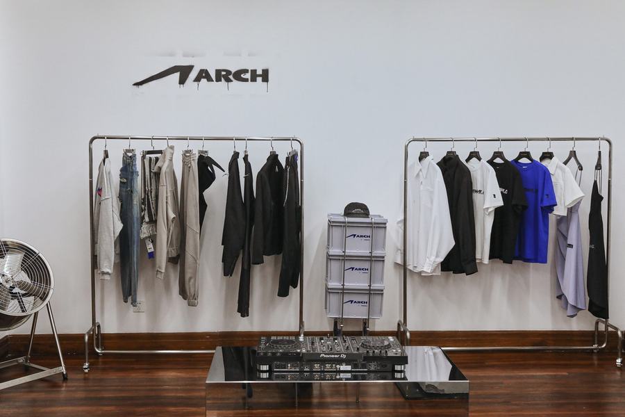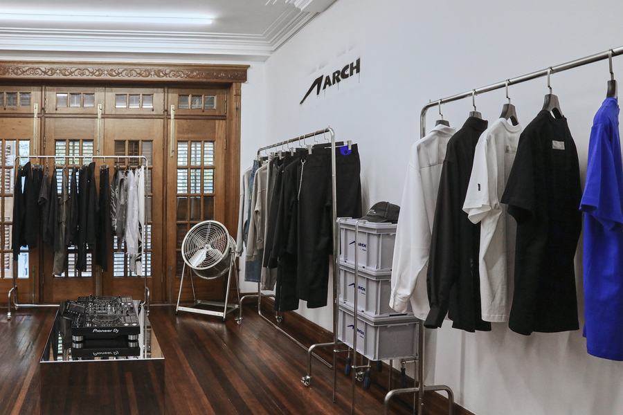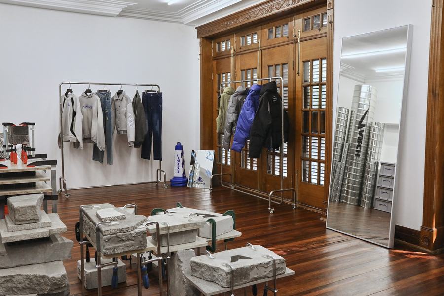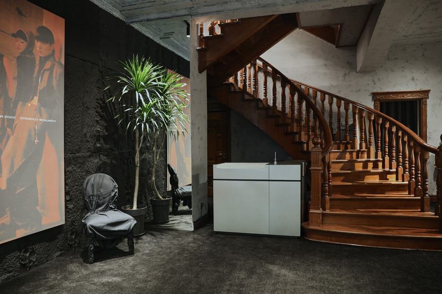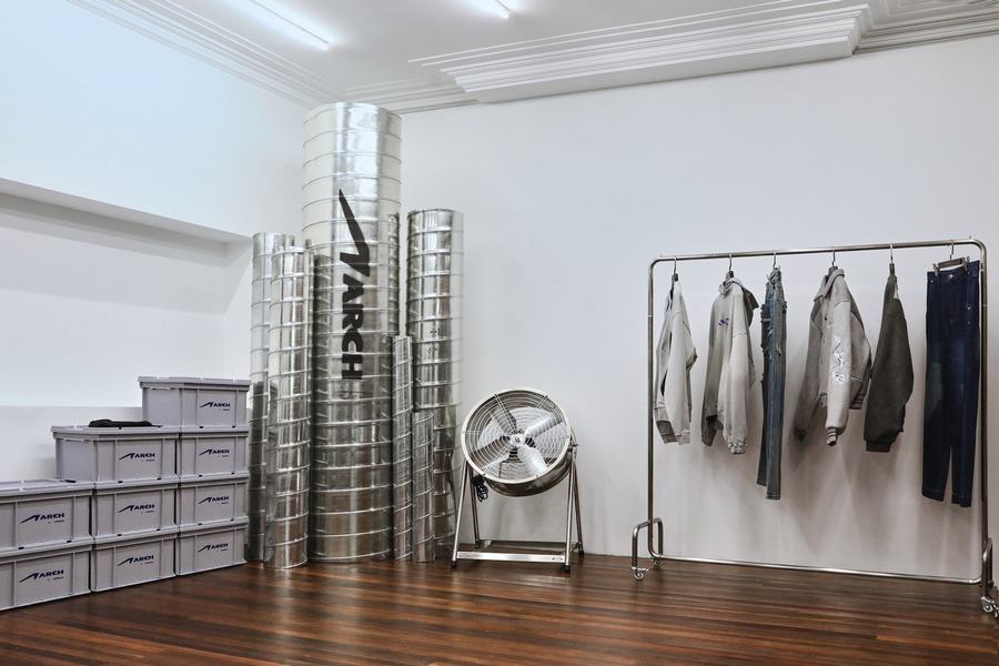 本次限时空间的首层,以斑驳、粗糙质感的水泥灰肌理点缀墙面,室内艺术装置则以黑色布面进行二次包裹,整体概念呈现 2022 秋冬季度概念中的粗旷主义力量感,让下沉的情绪更加强烈。限时店铺二层则是全新支线 ARCH 打造的特别陈列空间,整个概念空间同样围绕 ARCH 本身的新锐性、实验性,采用大量工业金属材质进行二次创作,强调品牌更为显性的概念个性表达。