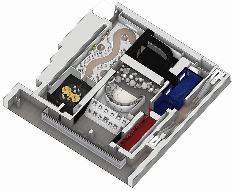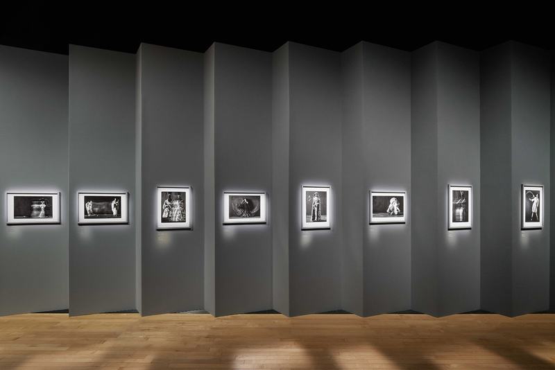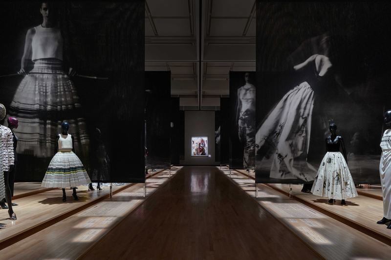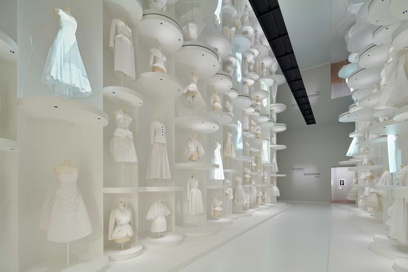 博物馆中庭的“地板”被提升并倾斜,对角线上平分了阁楼空间,创造了一个双面展示。顶部变成了“迪奥舞会”的一个单一的大斜坡,这是展览中最宏伟的布景,穿着礼服的人体模特爬上山坡,观众从下面或从桥上观看他们的“队伍”。斜坡顶部的一面倾斜的镜子无限地延续了几何形状,以一种意想不到的方式反射出服装和透视。