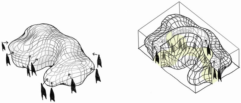 下面插入了一个更亲密的环境,写着“Dior around the World”。游客步入一个由多层同心织物表面组成的圆顶房间,形成一个带有动画投影的场景半球。