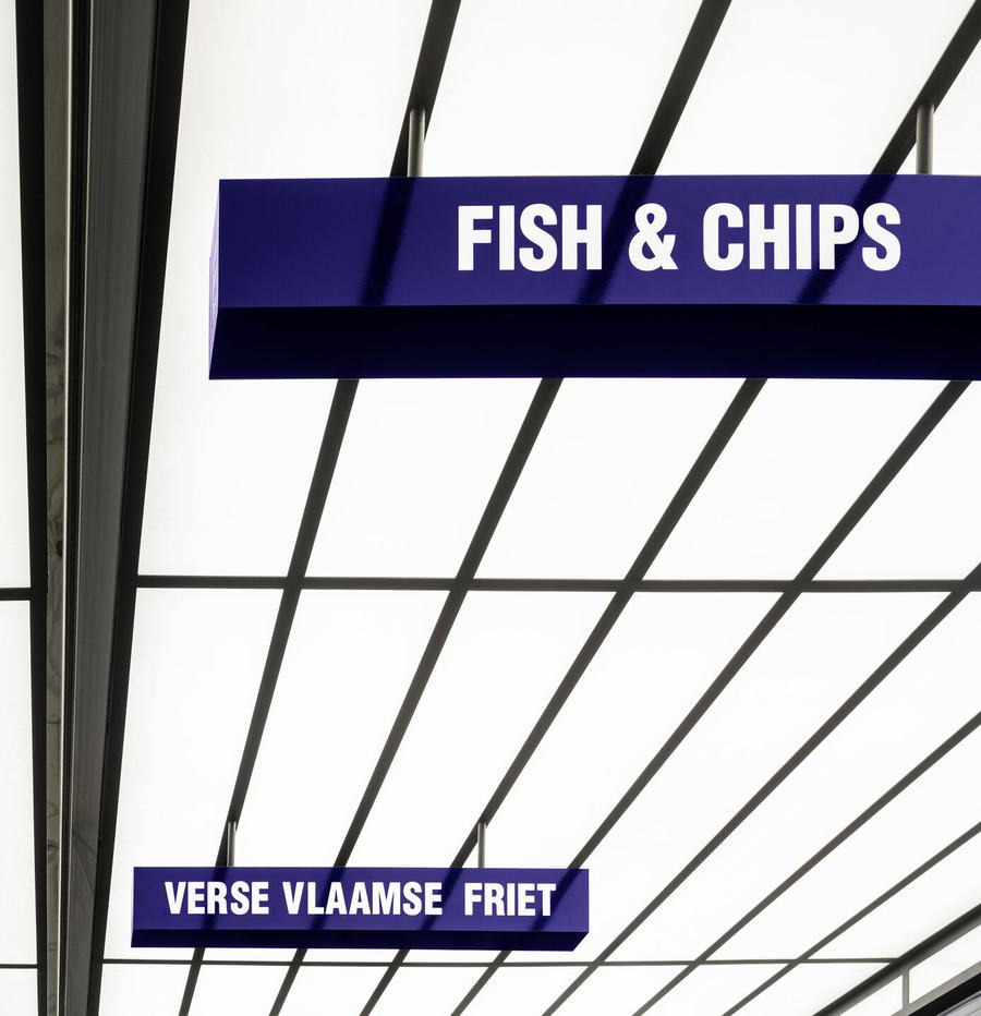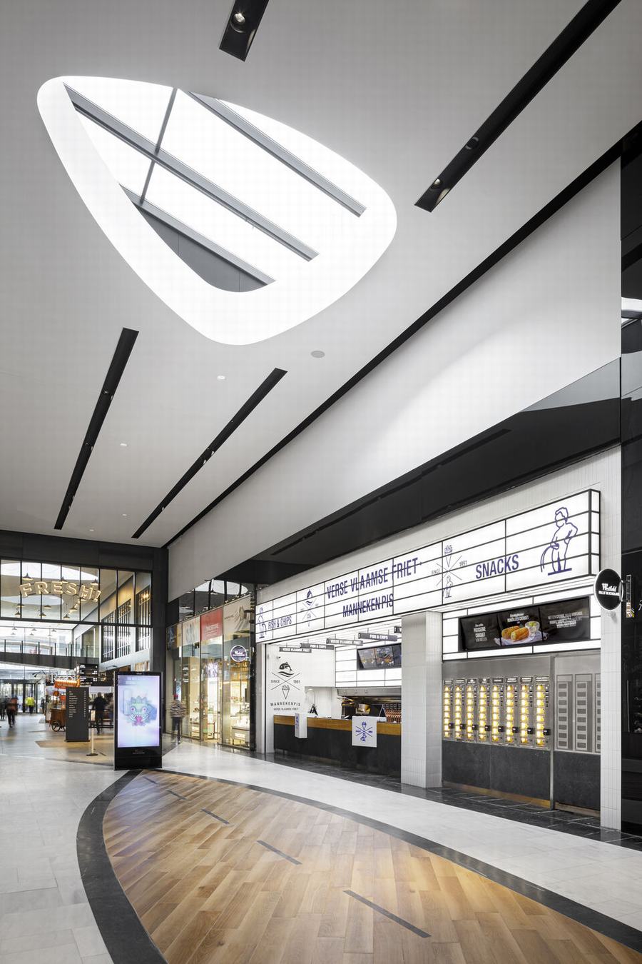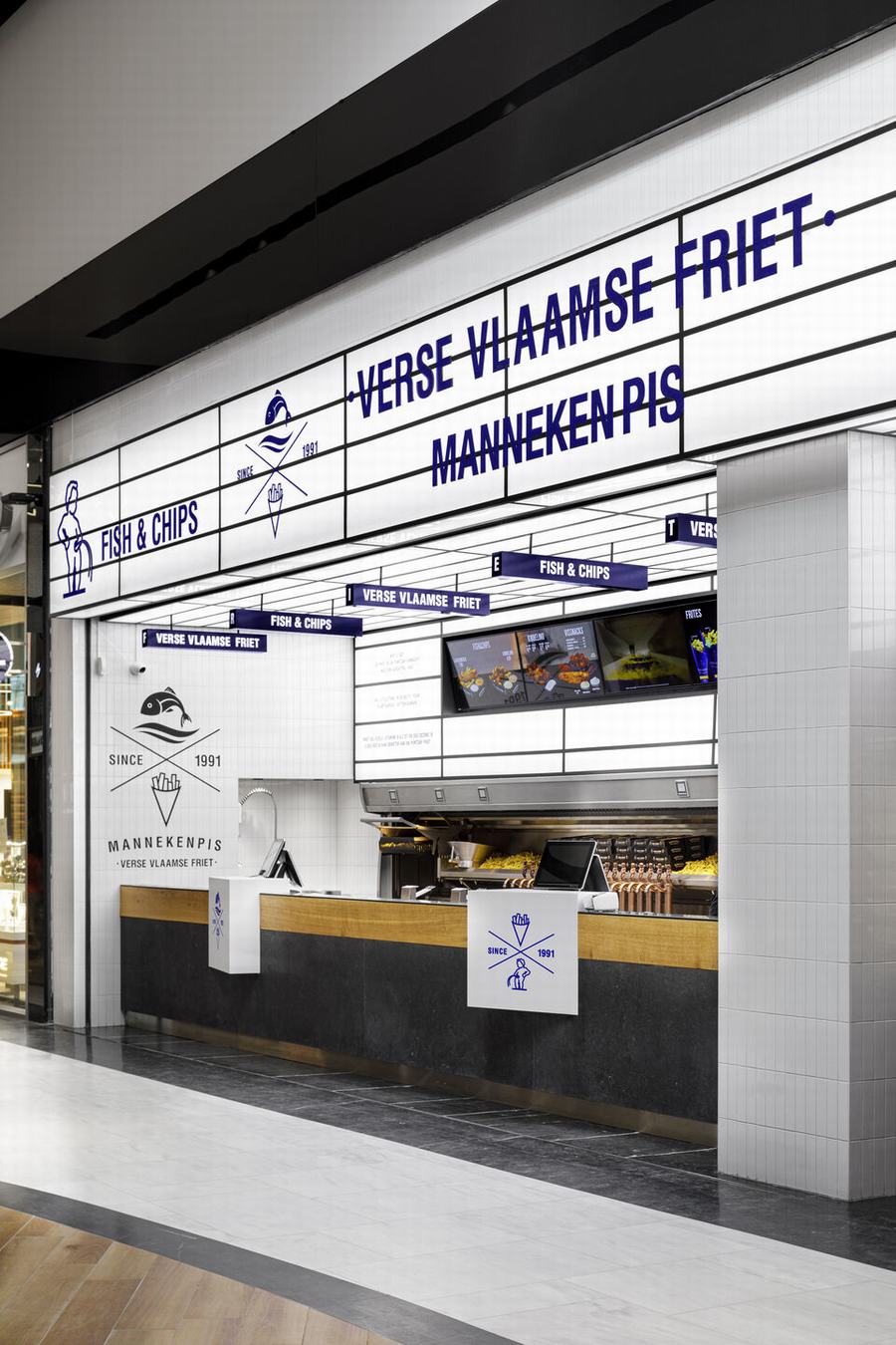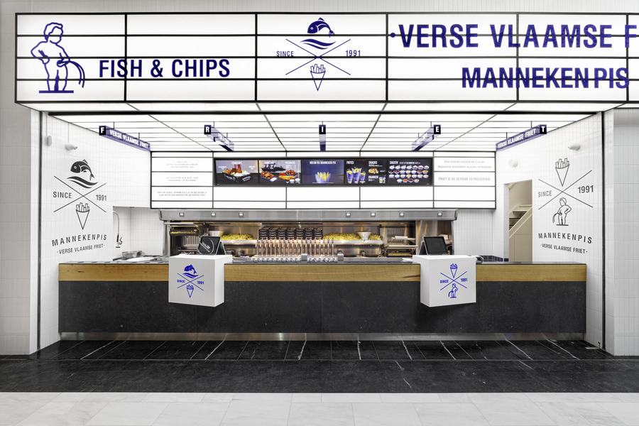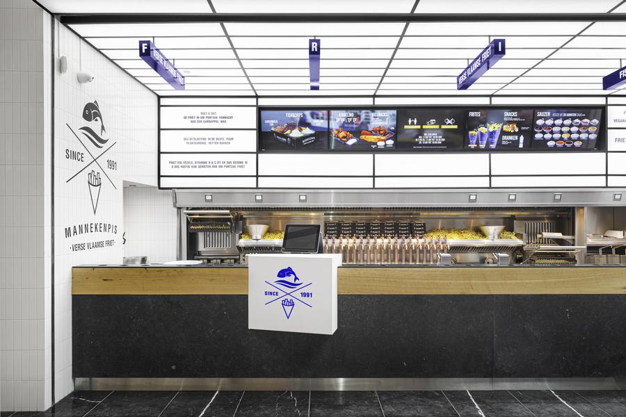 撒尿小童的位置和它在空间中的定位需要一个典型的售货亭布局,直接从位于通道上的柜台销售。这个概念背后的主要思想是一个像电影一样的交流灯箱,从外到内折叠,使柜台后面的整个区域,包括令人印象深刻的油炸墙,成为客户体验的一部分。它没有一个有大窗户的立面,而是在照明天花板下创造了一个有吸引力的室内空间。同时,它允许传播元素,如窄铸造菜单屏幕和品牌,集成到灯箱中,以确保内部和品牌体验之间的无缝流动。