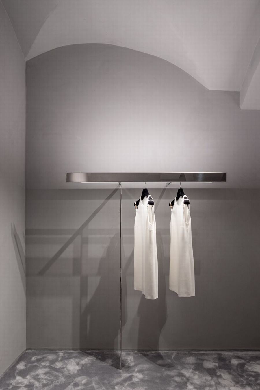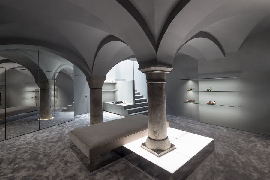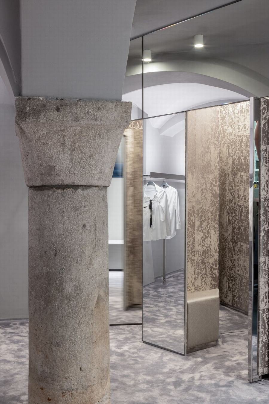 视觉展示项目的所有细节都是为了扩大购物体验,甚至是更衣室的体量,通过增加古老的柱子和历史建筑原始建筑的交叉拱顶,增加了地下室的空间。在室内,金属反射的纺织布瓦框以现代的方式重新诠释了威尼斯锦缎,并将客户置于梦幻般的拥抱中。