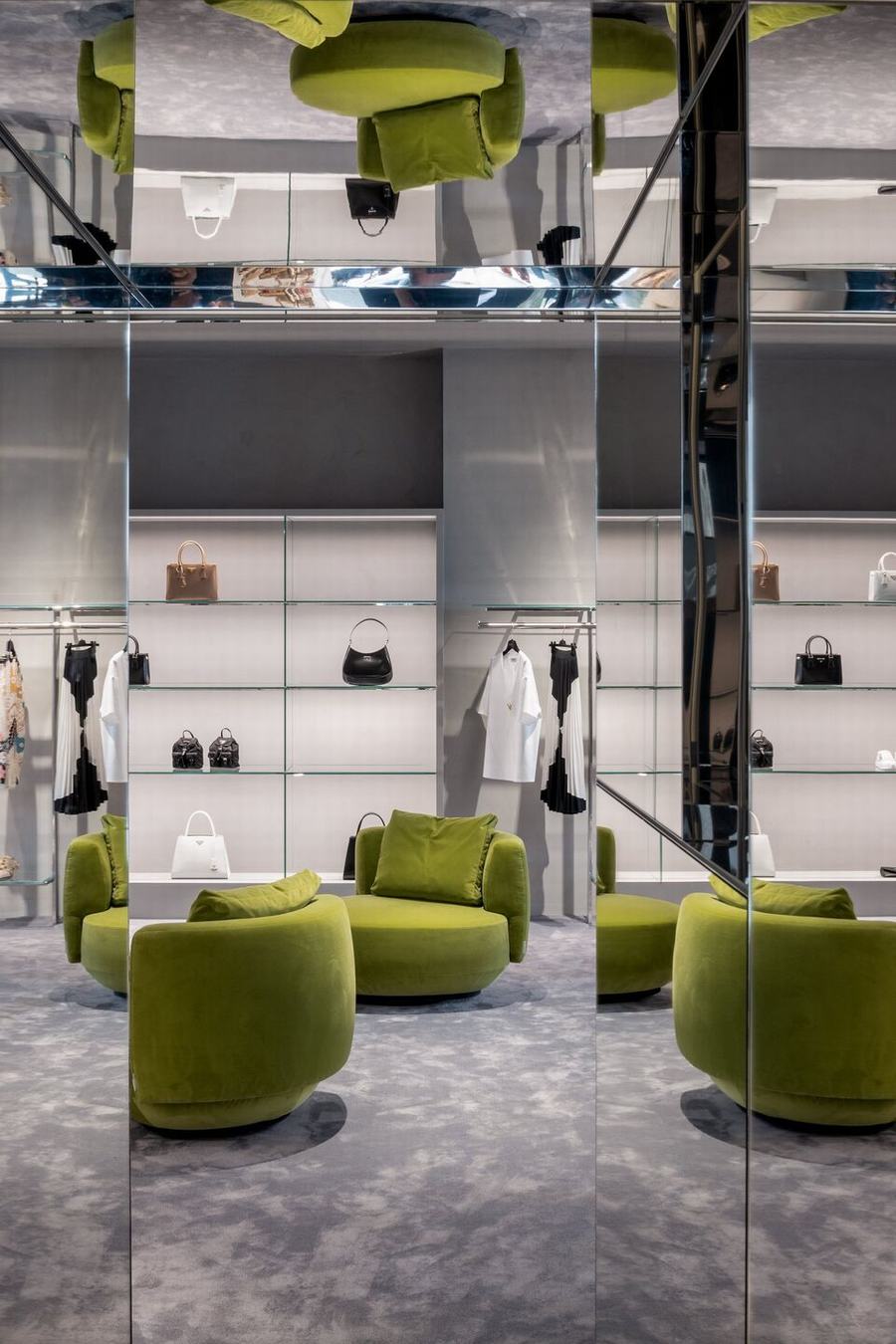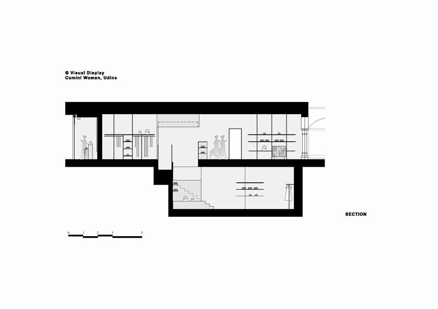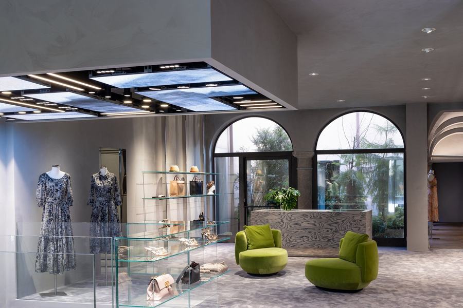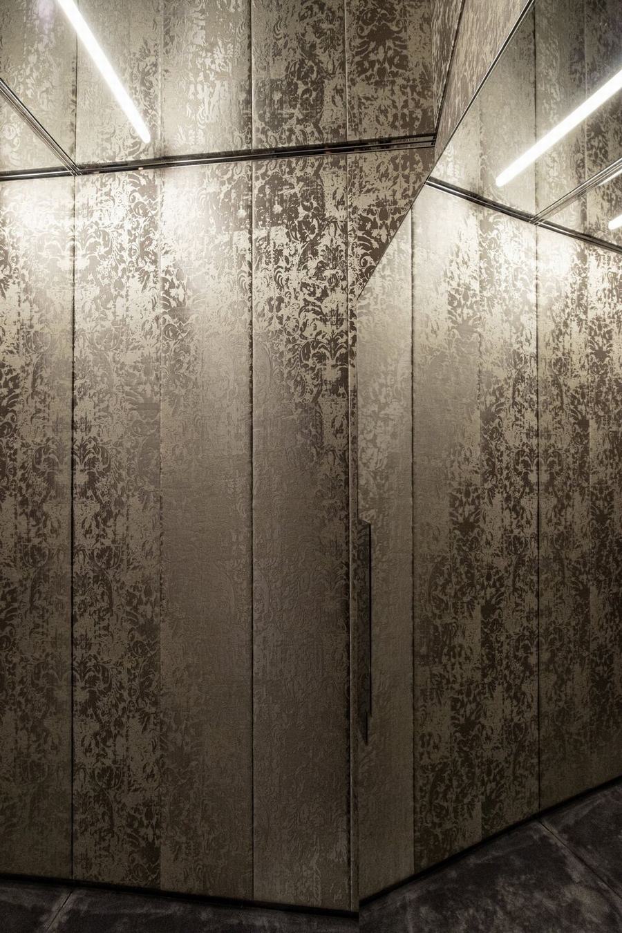视觉展示项目的所有细节都是为了扩大购物体验,甚至是更衣室的体量,通过增加古老的柱子和历史建筑原始建筑的交叉拱顶,增加了地下室的空间。在室内,金属反射的纺织布瓦框以现代的方式重新诠释了威尼斯锦缎,并将客户置于梦幻般的拥抱中。