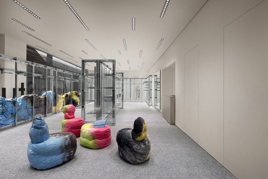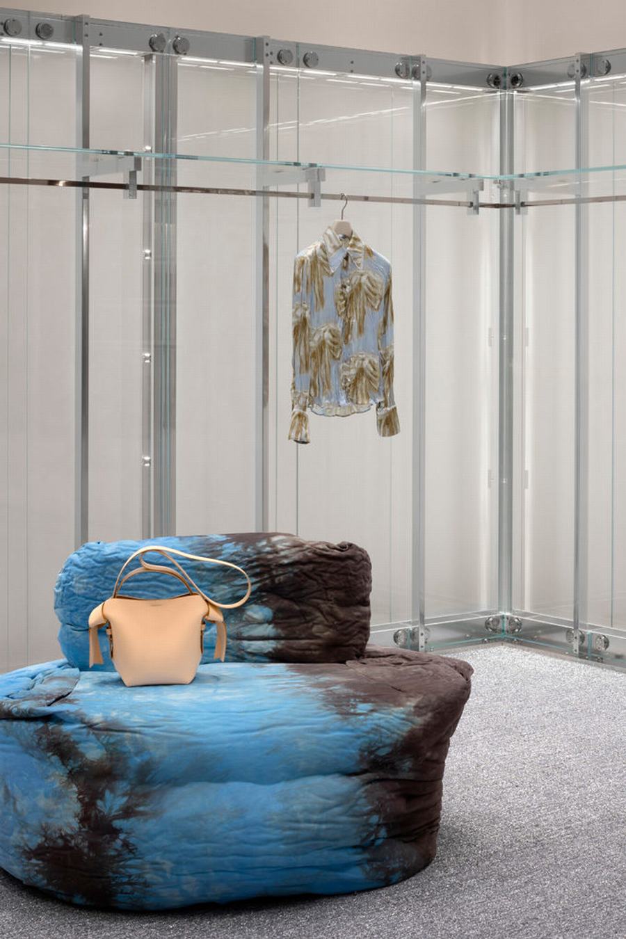 为了填补空间,家具设计师和品牌的长期合作伙伴Max Lamb将鲜明的线条与柔和、不拘一格的风格进行了对比;在这里,一系列渐变的朦胧形状转变为商店内部的元素——从2023年春夏系列的自发性中获得线索。至于商店的橱窗,一面中空的玻璃墙上贴满了一捆捆类似的手工染色蜡染织物。就像向该地区的艺术形式致敬一样,色彩缤纷的纺织品与空间中更酷的工业接触点并置。