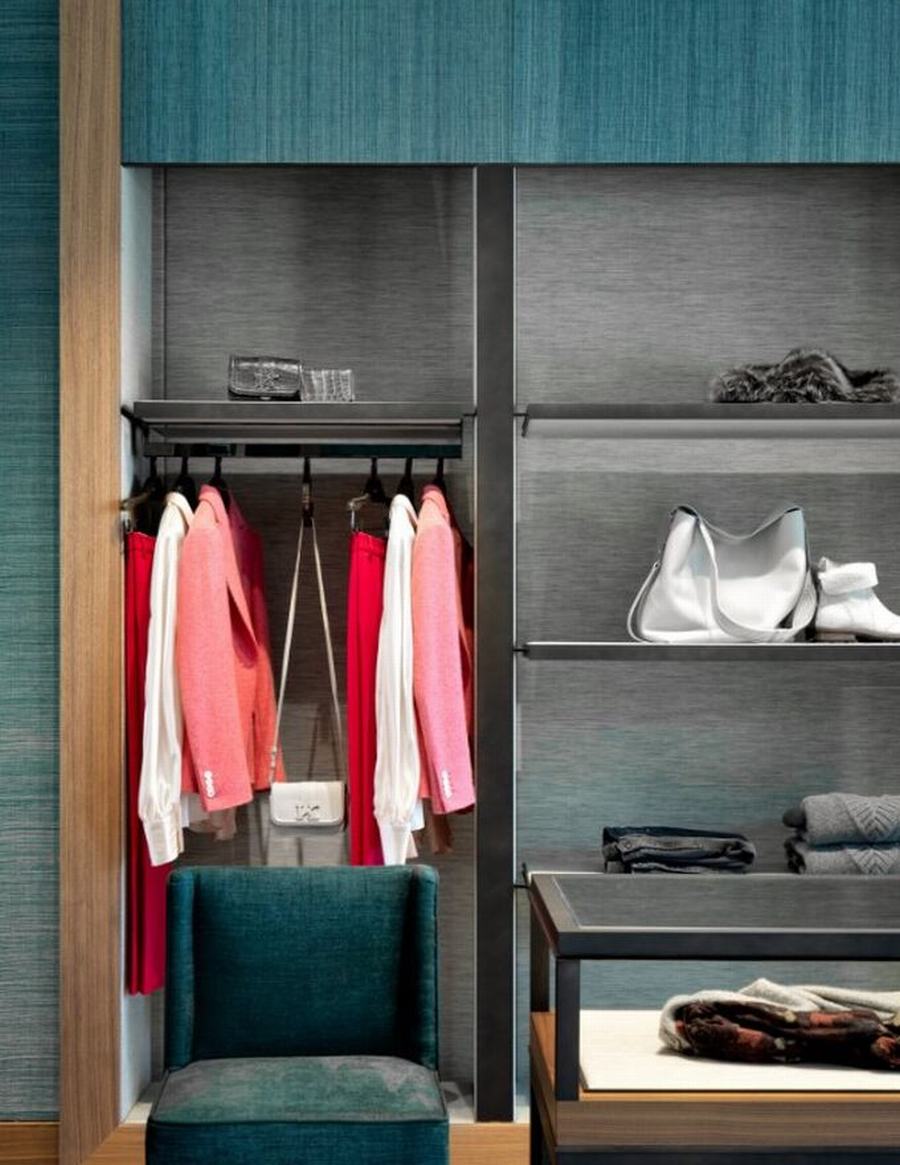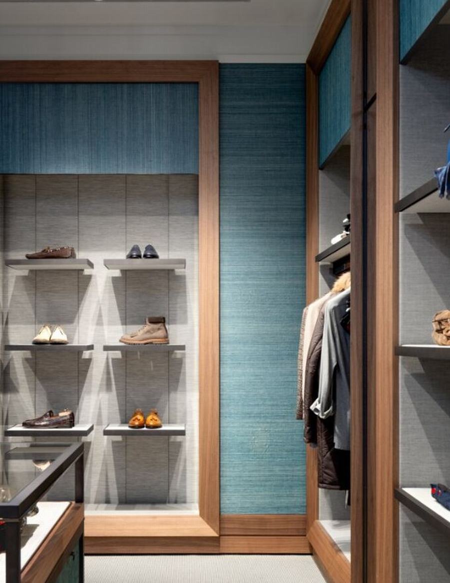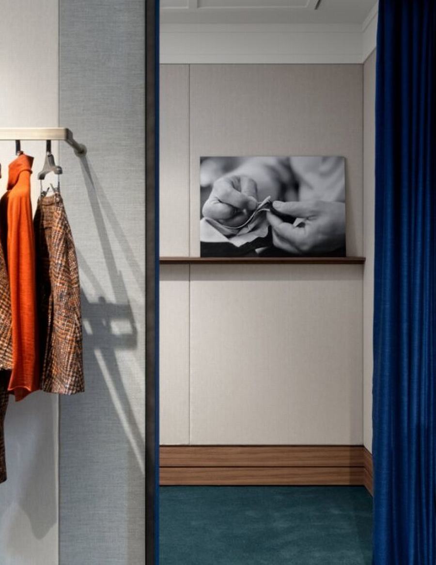 金属网格也是从商场内部直接进入的立面的普遍元素,在一些地方使用,具有透视效果。入口和店面用蓝色织物面板突出,让人想起外立面的大窗帘。鼓舞人心的情绪是线性设计,结合了干净的形状和中性的颜色与软饰。上海精品店通过广泛的材料与家具互动,让人想起Kiton的创意世界。