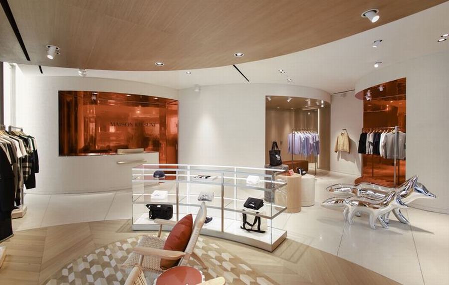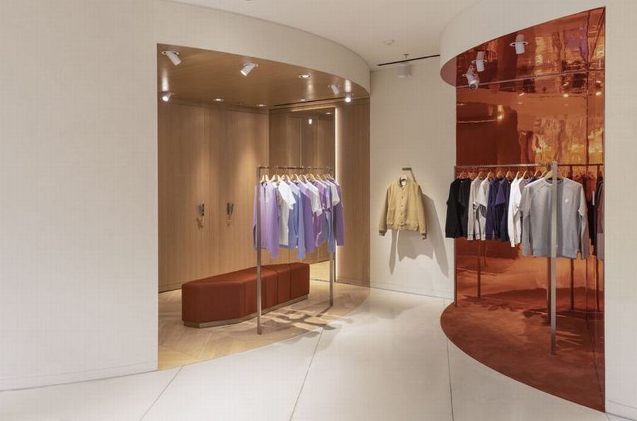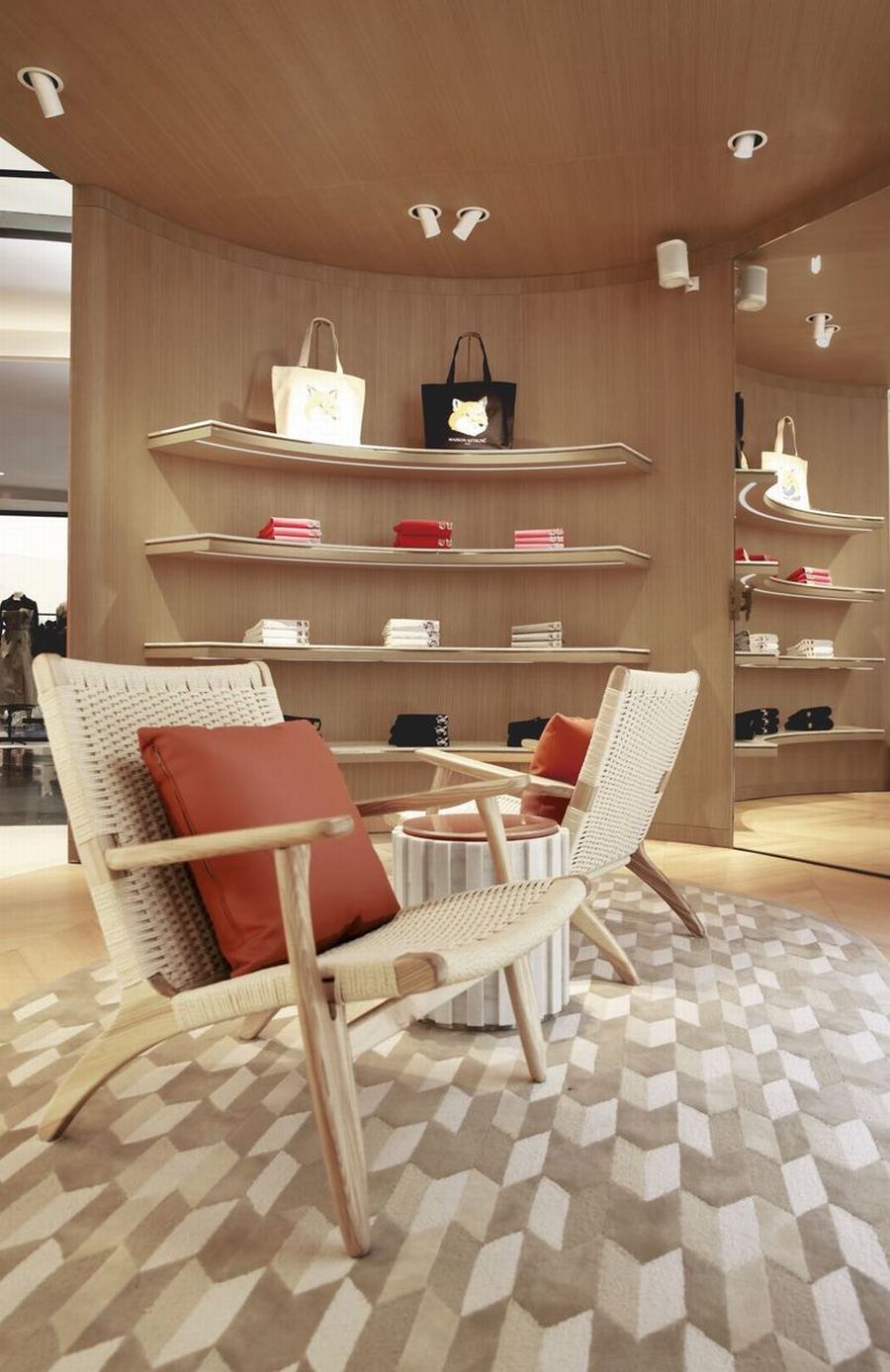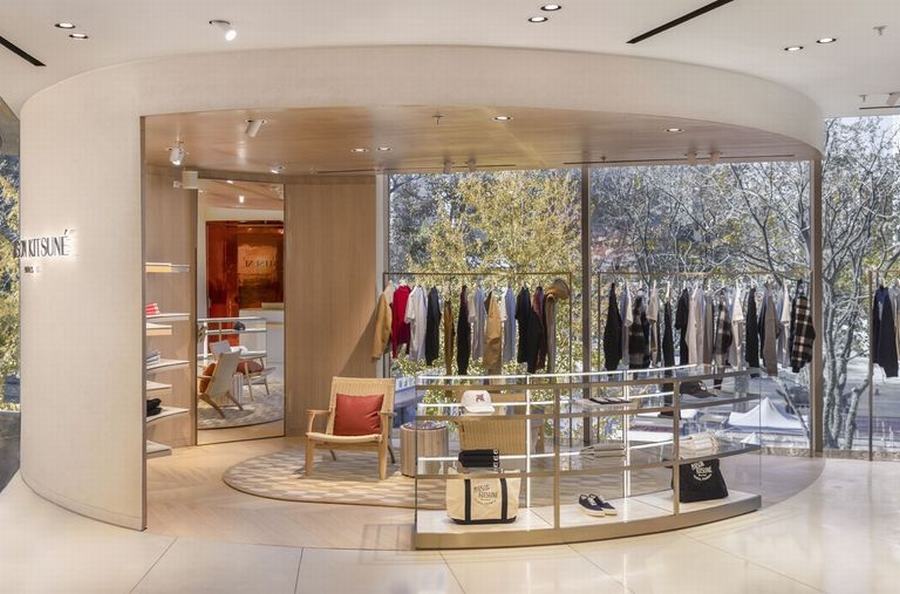 Maison Kitsuné上海芮欧精品店坐落于商场2楼,品牌在此精心打造了一个融合法日风情与当地灵感元素的艺术生活方式空间。全店运用半开放的优雅格局,柔和的边缘设计,圆滑的视觉元素和整体的几何线条,将空间巧妙地分割成流畅且私密的区域,为消费者营造了别具一格的沉浸式体验。