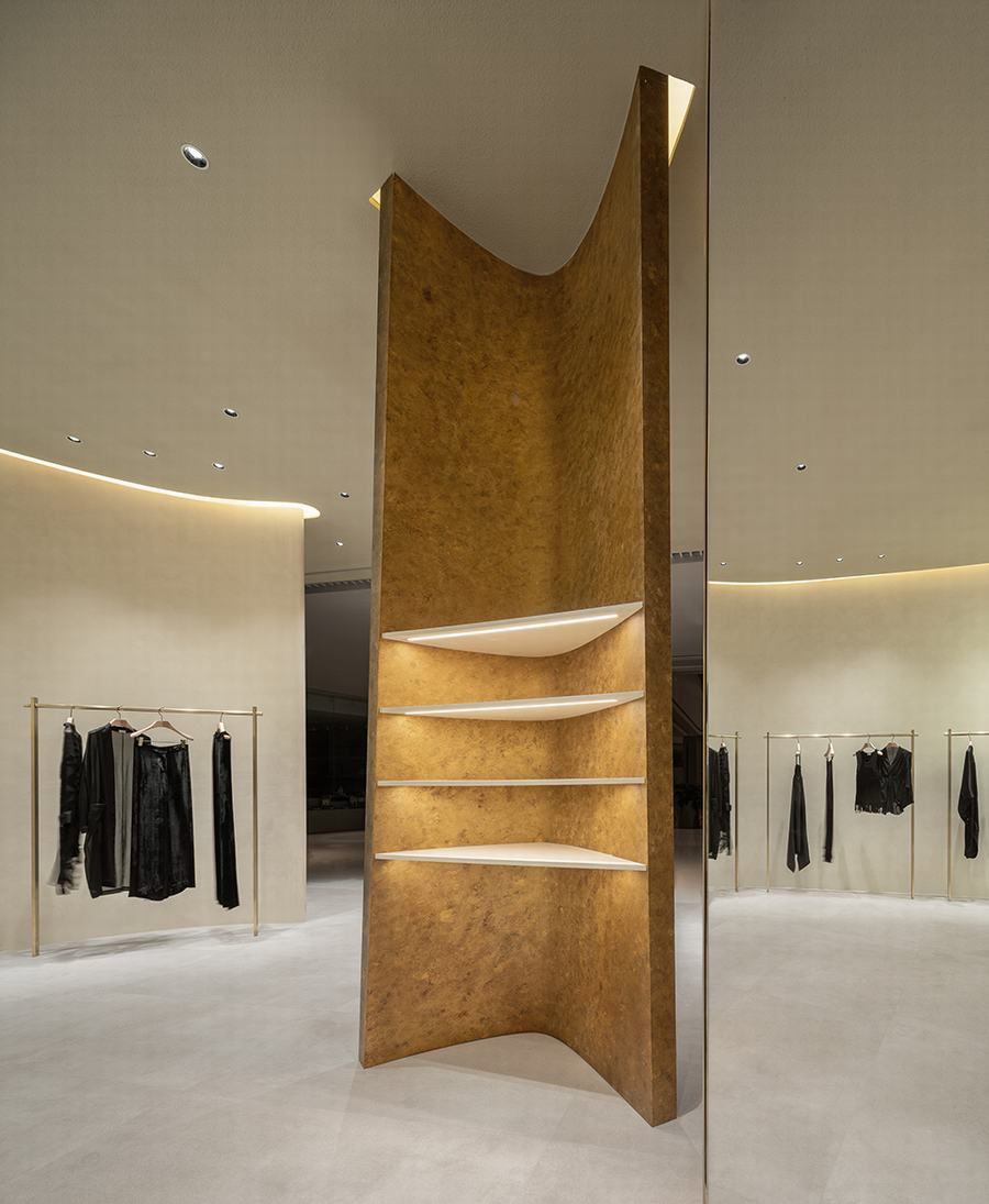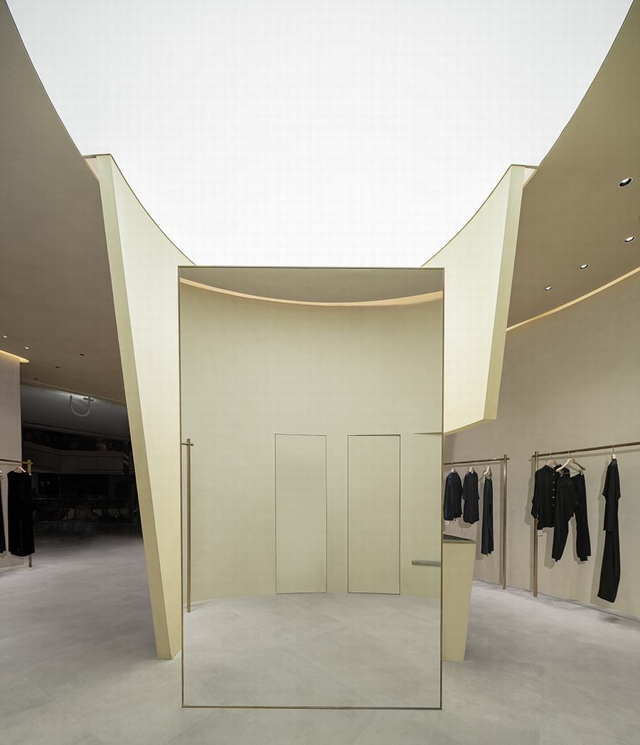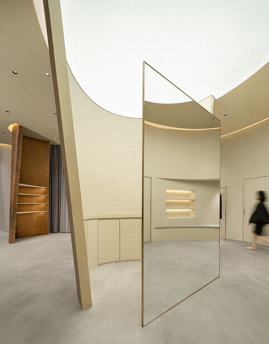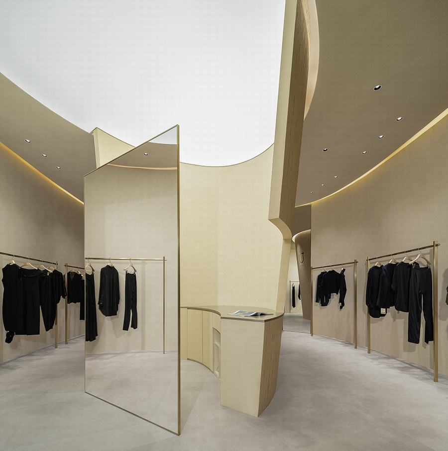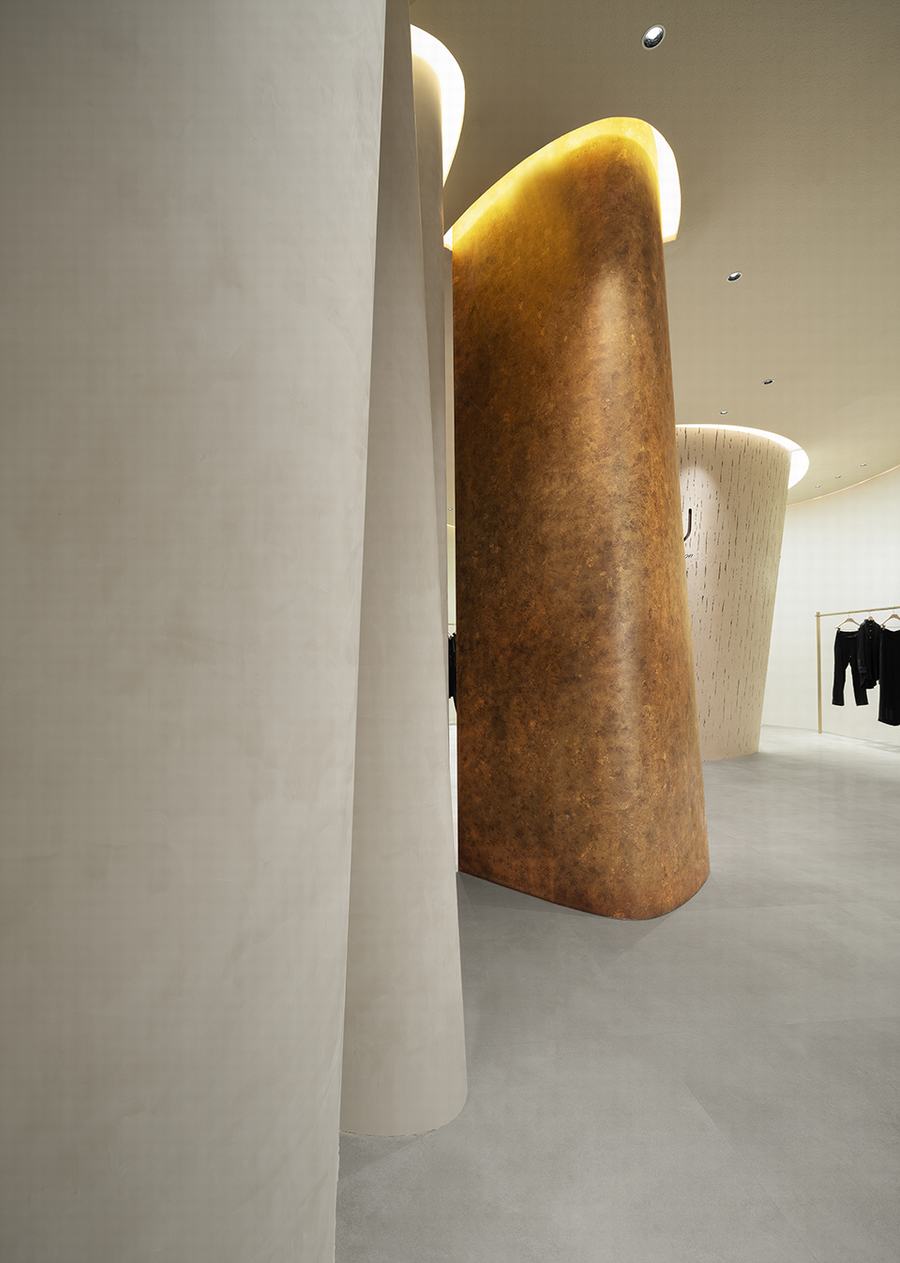 我们继续使用织物的概念,主要结构由一些弯曲的墙壁组成,最终的墙壁形状是通过一些曲率的调整来完成的,以便在单一的曲面上创造一些变化。空间的边界被模糊和相互渗透,创造了一个“流动空间”,流动性以生动和动态的方式融合到空间中。就像折叠的织物将顾客包裹在一个温柔的空间中,它创造了一个既开放又内省的空间形象。