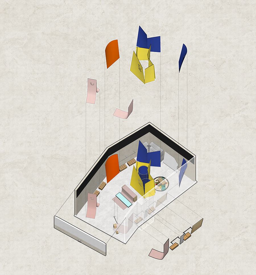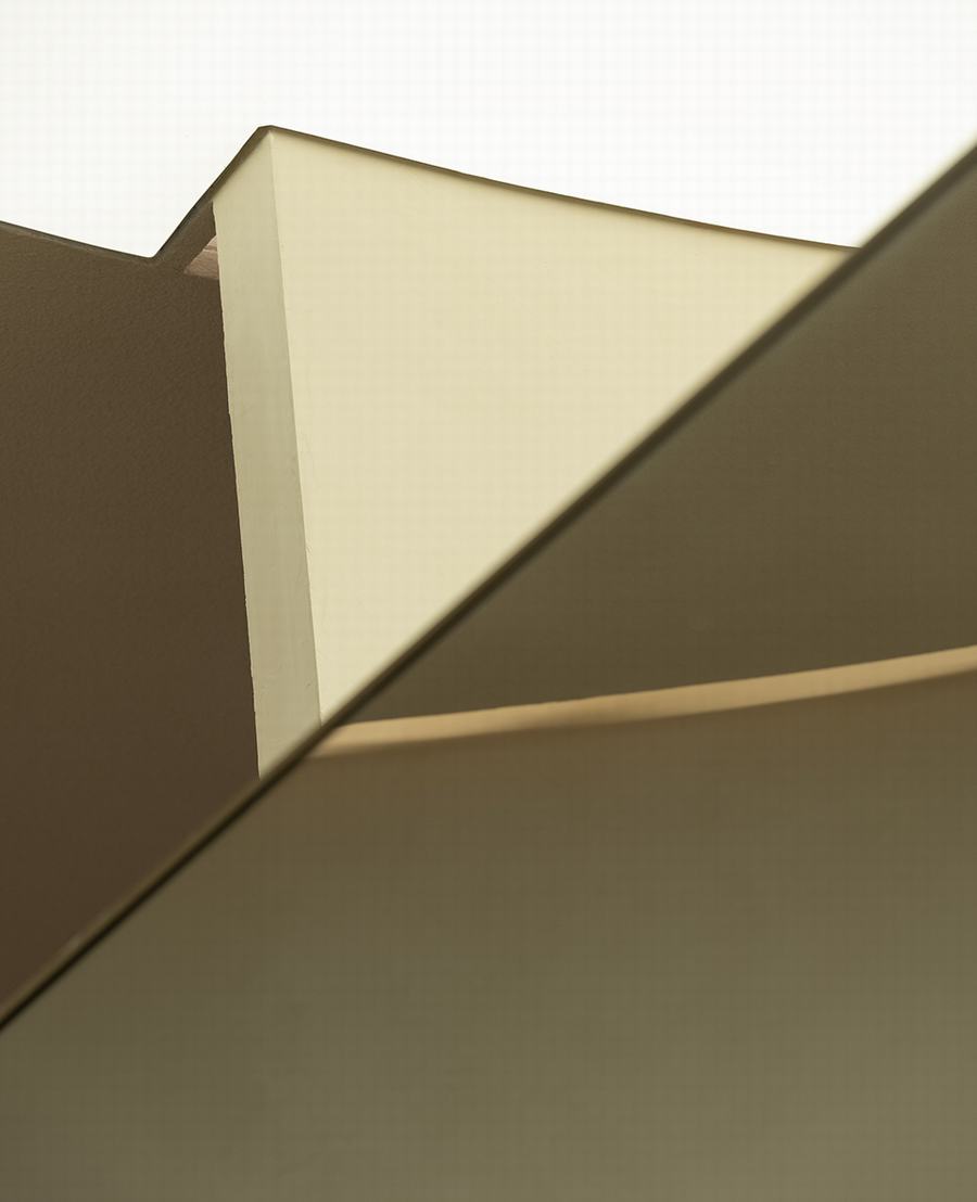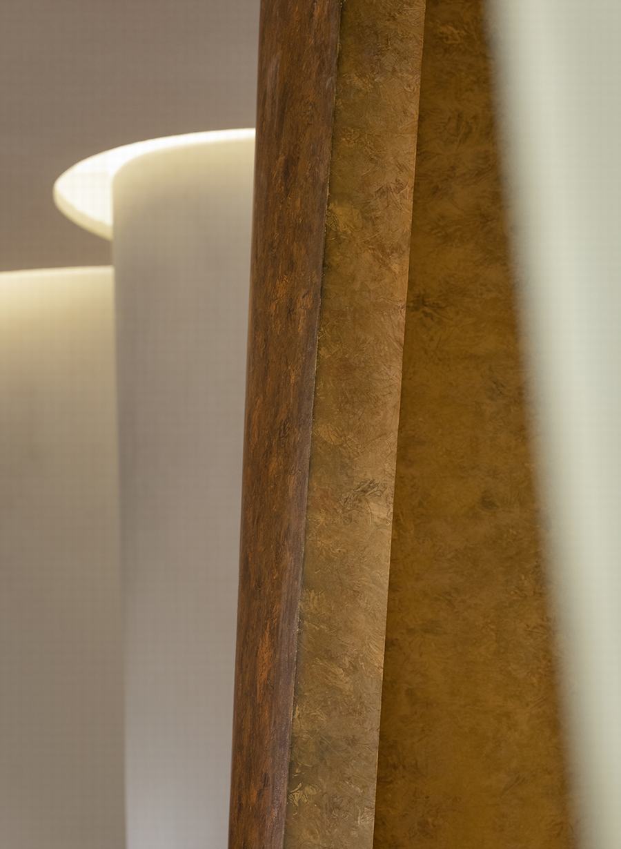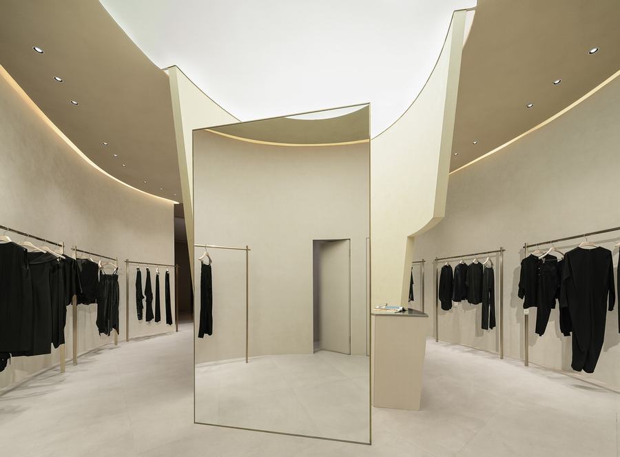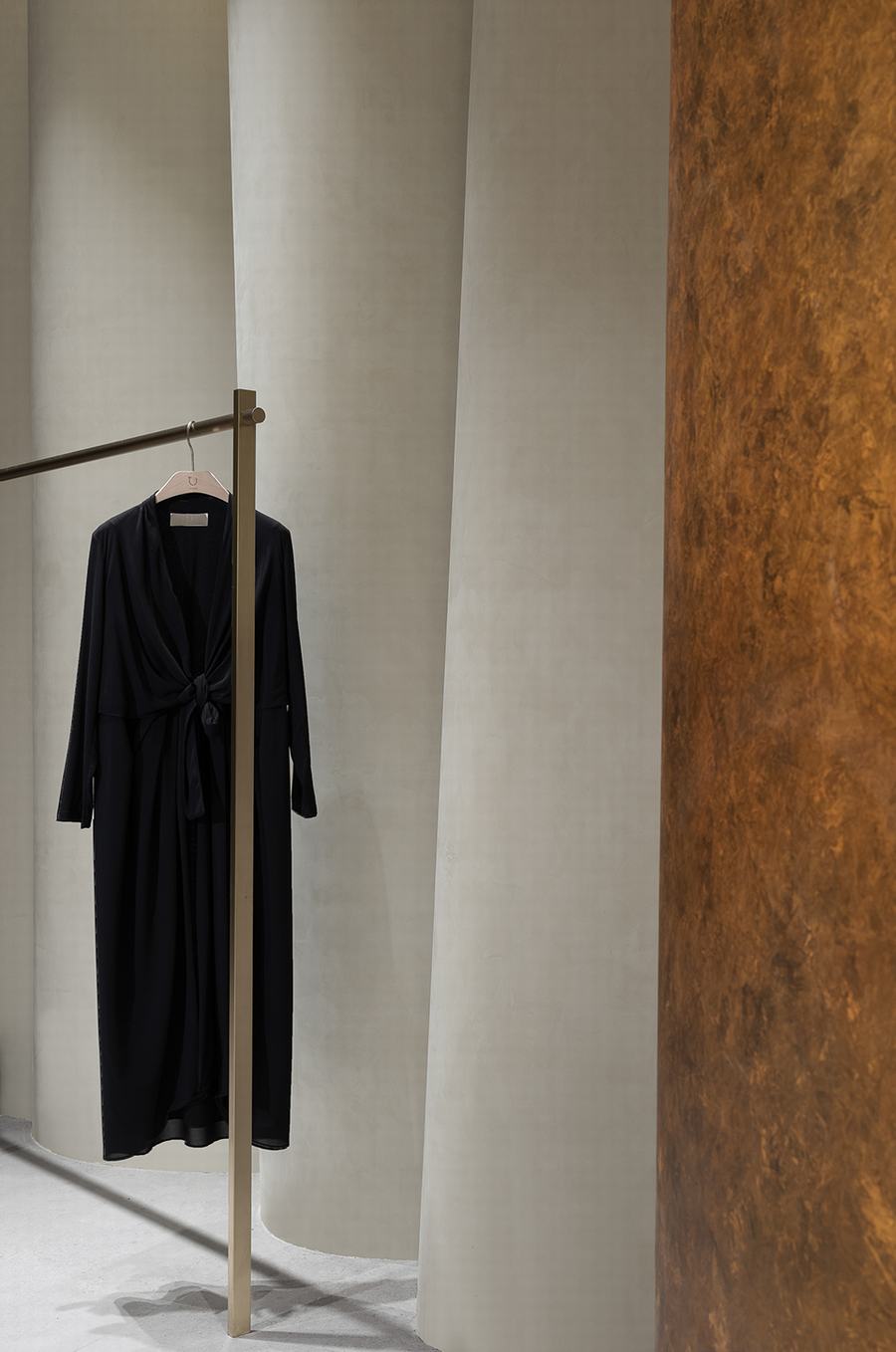 我们继续使用织物的概念,主要结构由一些弯曲的墙壁组成,最终的墙壁形状是通过一些曲率的调整来完成的,以便在单一的曲面上创造一些变化。空间的边界被模糊和相互渗透,创造了一个“流动空间”,流动性以生动和动态的方式融合到空间中。就像折叠的织物将顾客包裹在一个温柔的空间中,它创造了一个既开放又内省的空间形象。
