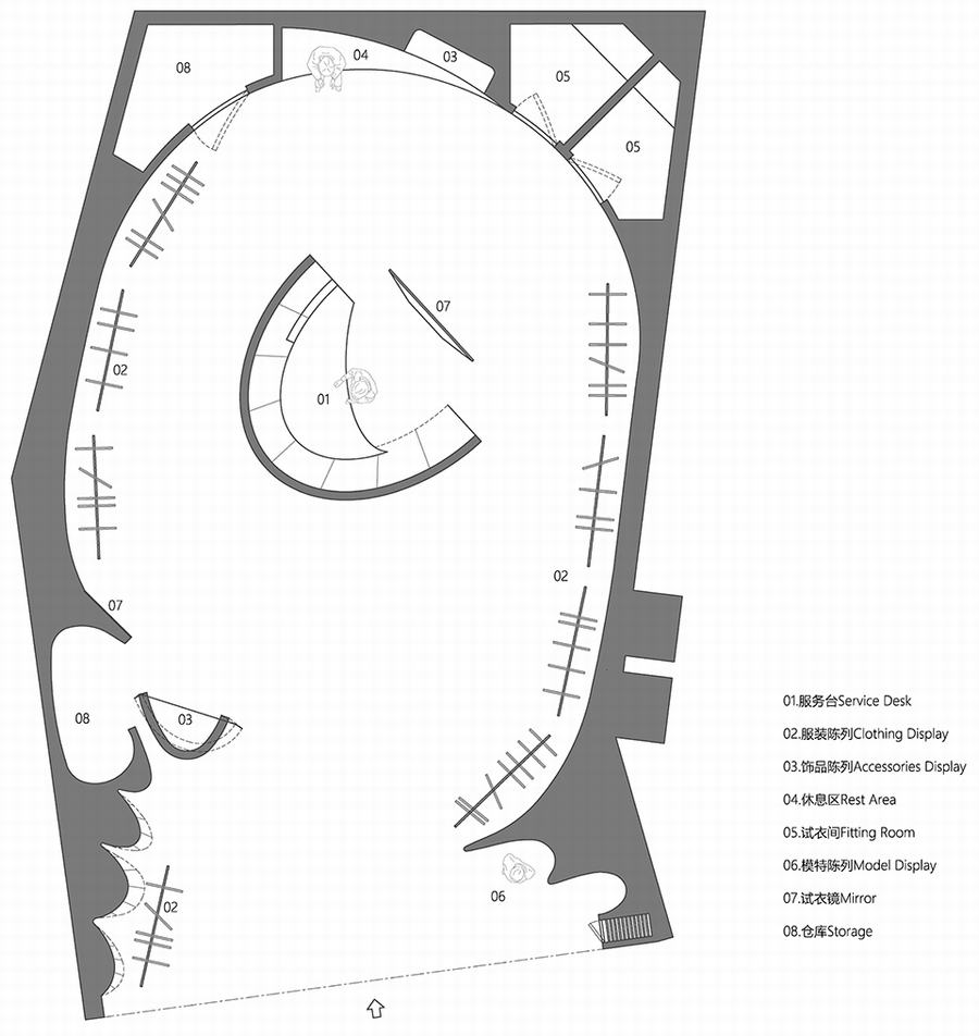 在开放的平面布局中,一个漏斗形的体块被放置在空间中,以定义空间的功能。漏斗的顶部模仿了一个天窗,使光线柔和地充斥着房间,而漏斗的内部容纳了收银台区域,试衣间和存储空间被漏斗空间隔开。