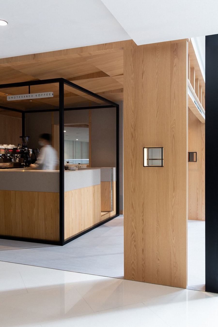 Wilson Lee:我们想在喧嚣中创造一个平静、精致、充满阳光的空间,人们可以在这里慢下来,享受一杯咖啡。一个线条干净、大胆的黑框咖啡亭坐落在空间的中心,向东京表参道的第一家表参道咖啡致敬。