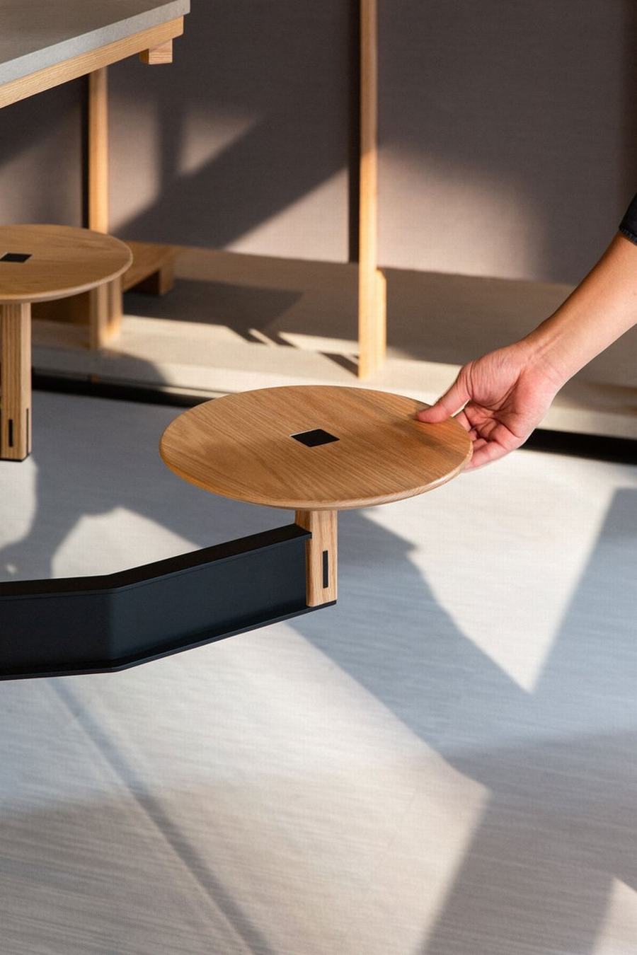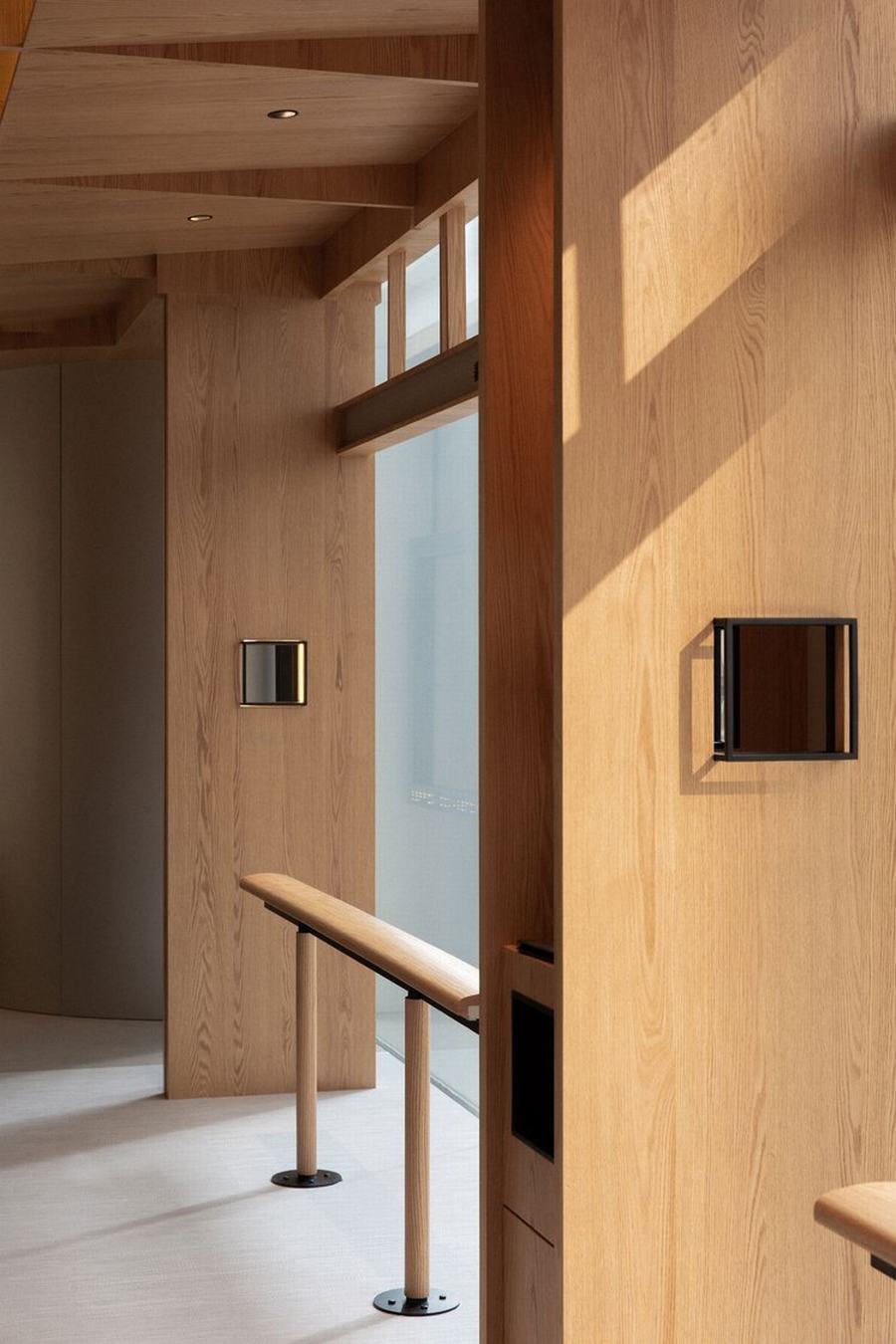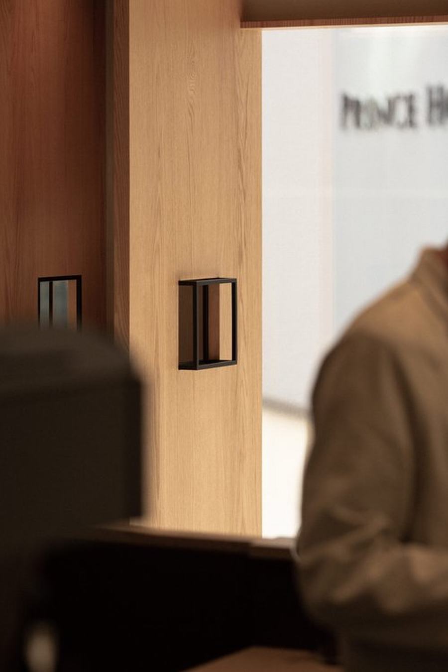 Wilson Lee:咖啡馆从墙壁到天花板都覆盖着温暖的橡木。对于咖啡吧,我们使用了橡木、灰色石头和结合了黑色涂层钢和一层黑色染色橡木的框架。来自Kvadrat的织物覆盖了低矮的隔墙和躺椅。地板上覆盖着编织的乙烯基,以增强空间的音响效果。
