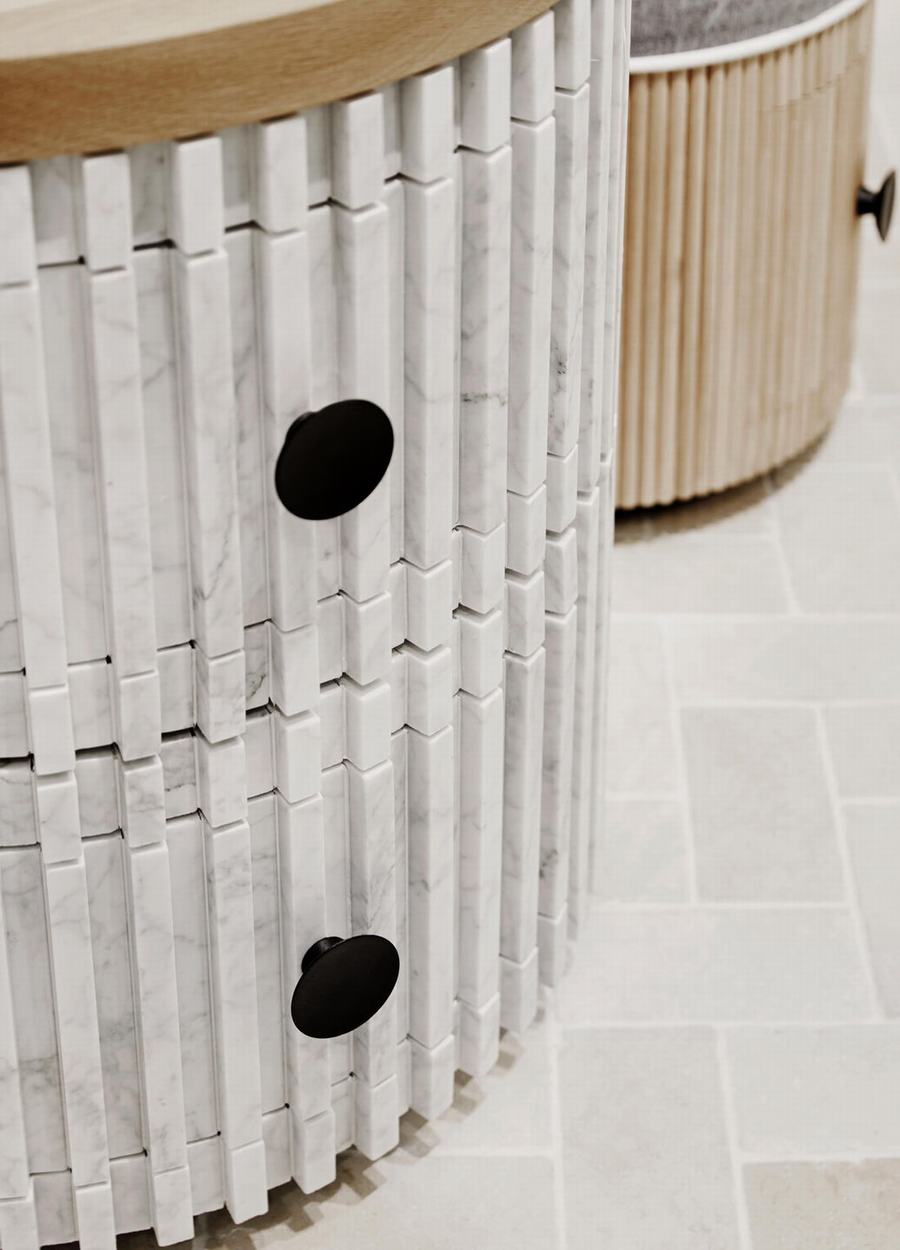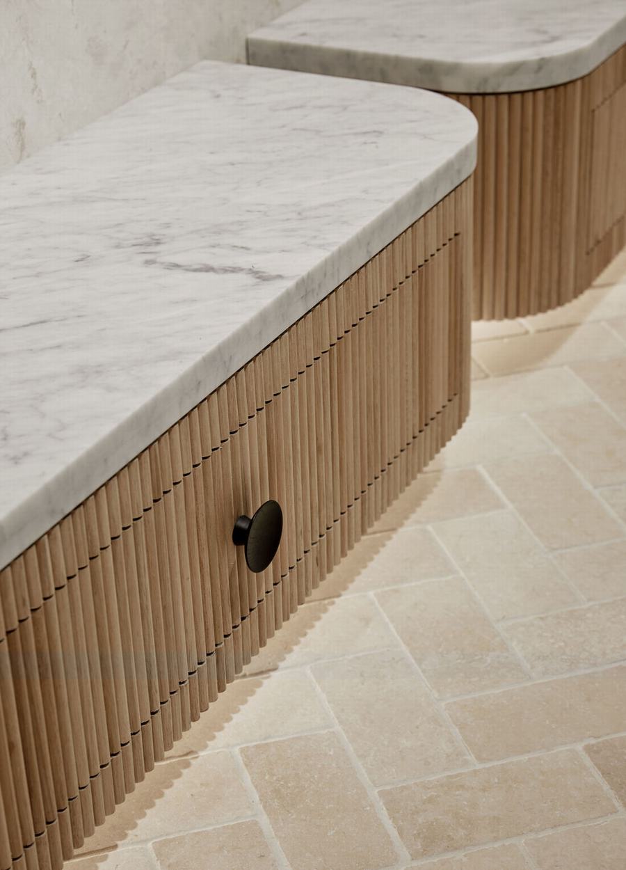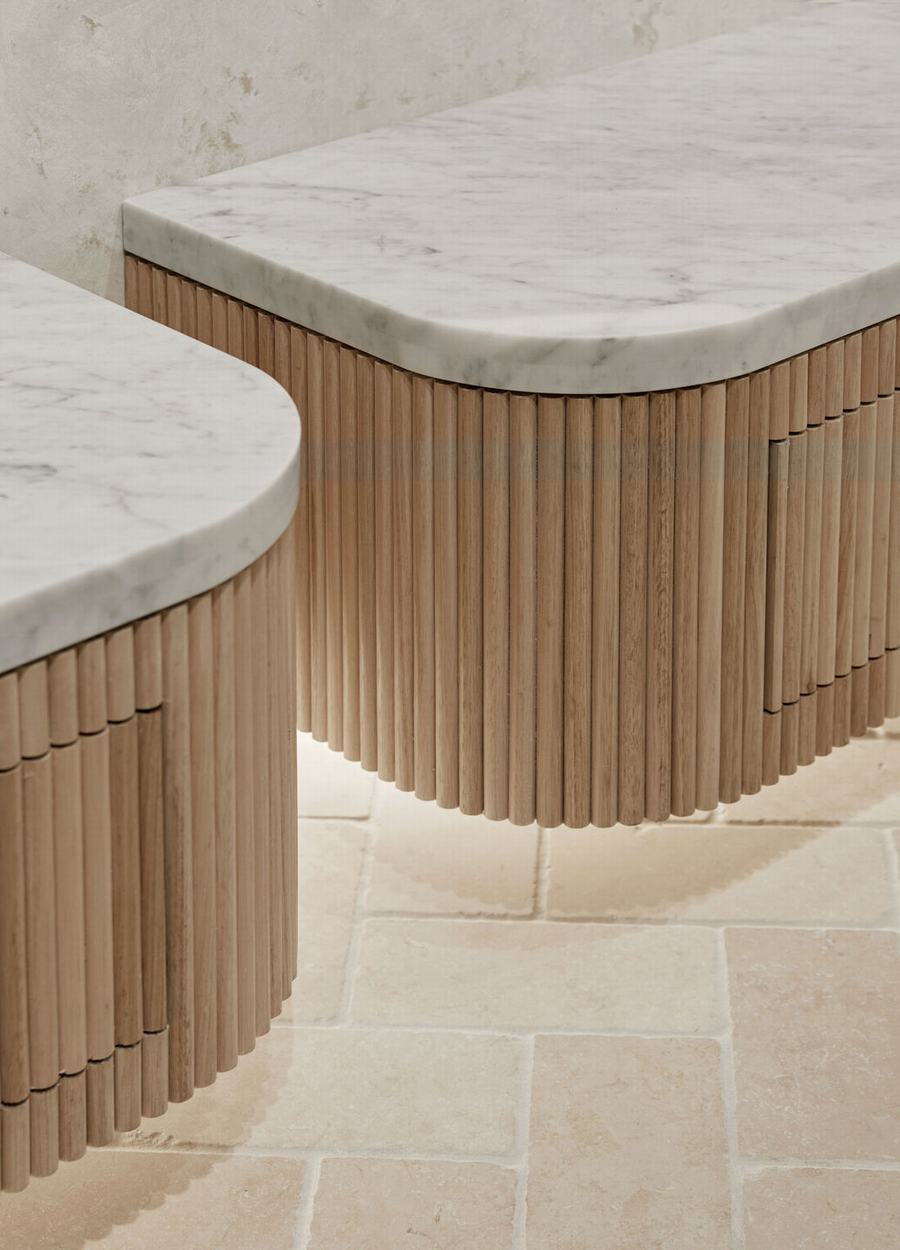 Our design for Jag (APG & Co) is an expression of opposing elements: distressed but clean, modern but energetic, raw but polished. Fluted Carrara marble counter and a curved steel shopfront gave purpose to this corner site. Curved tambour cabinets and oversized ebonised door knobs gave a nod to the brand’s 1970s heritage, whilst looking to the future.