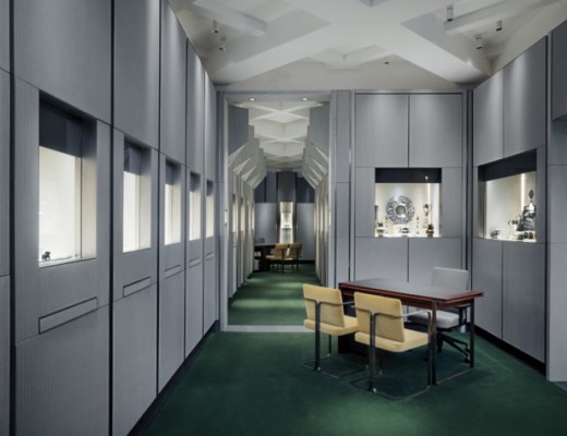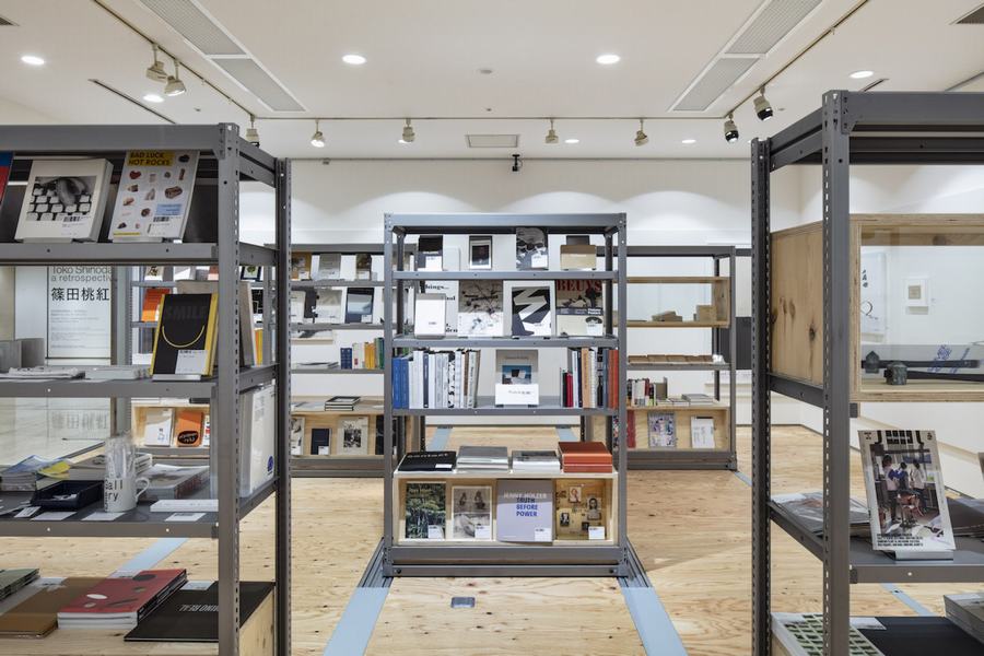 由Schemata Architects设计的东京艺术画廊零售空间中,展示柜安装在地板栏杆系统上,是一个适应性强的设置。