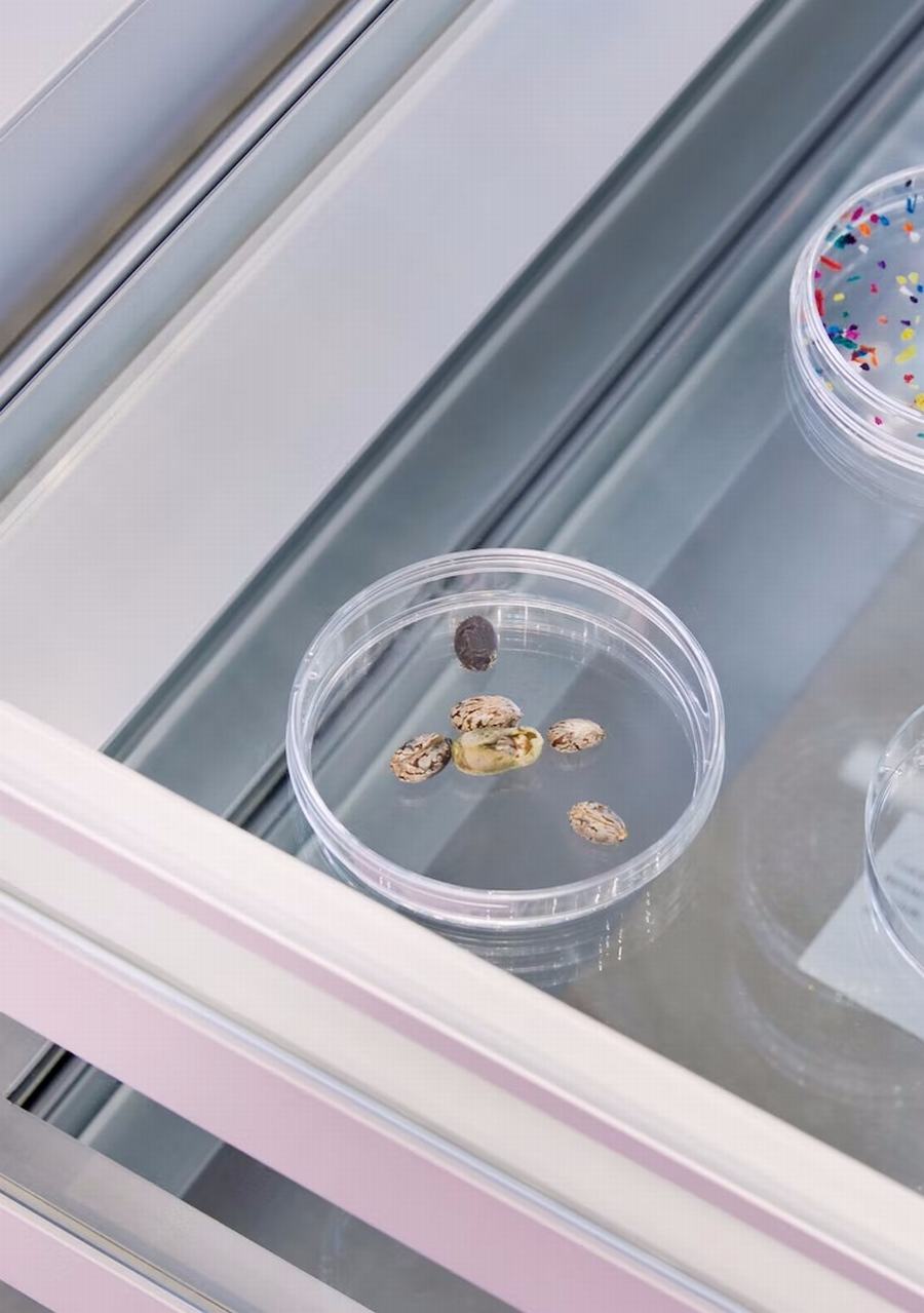 每个设计特性都是为承载不断变化的内容而构建的。两侧的玻璃架子上放置着色块产品,中心是创新桌。作为一件具有教育意义的家具,橱柜有几层透明的材料,展示了用于展示收藏品的任何技术的内部工作原理。这个空间被一块绿色的生活植物所封闭:一个装满了当地专家选择的植物的玻璃容器——每个地方的选择都是不同的。