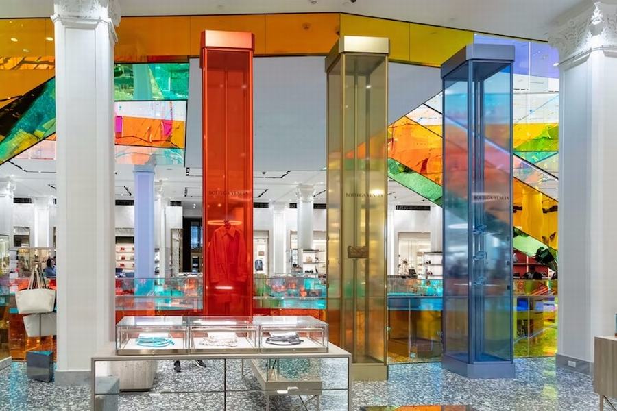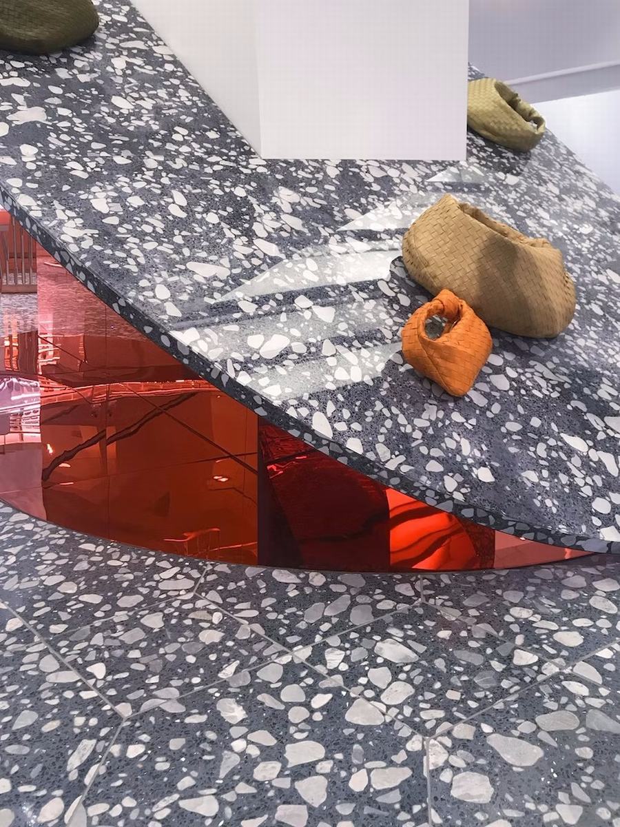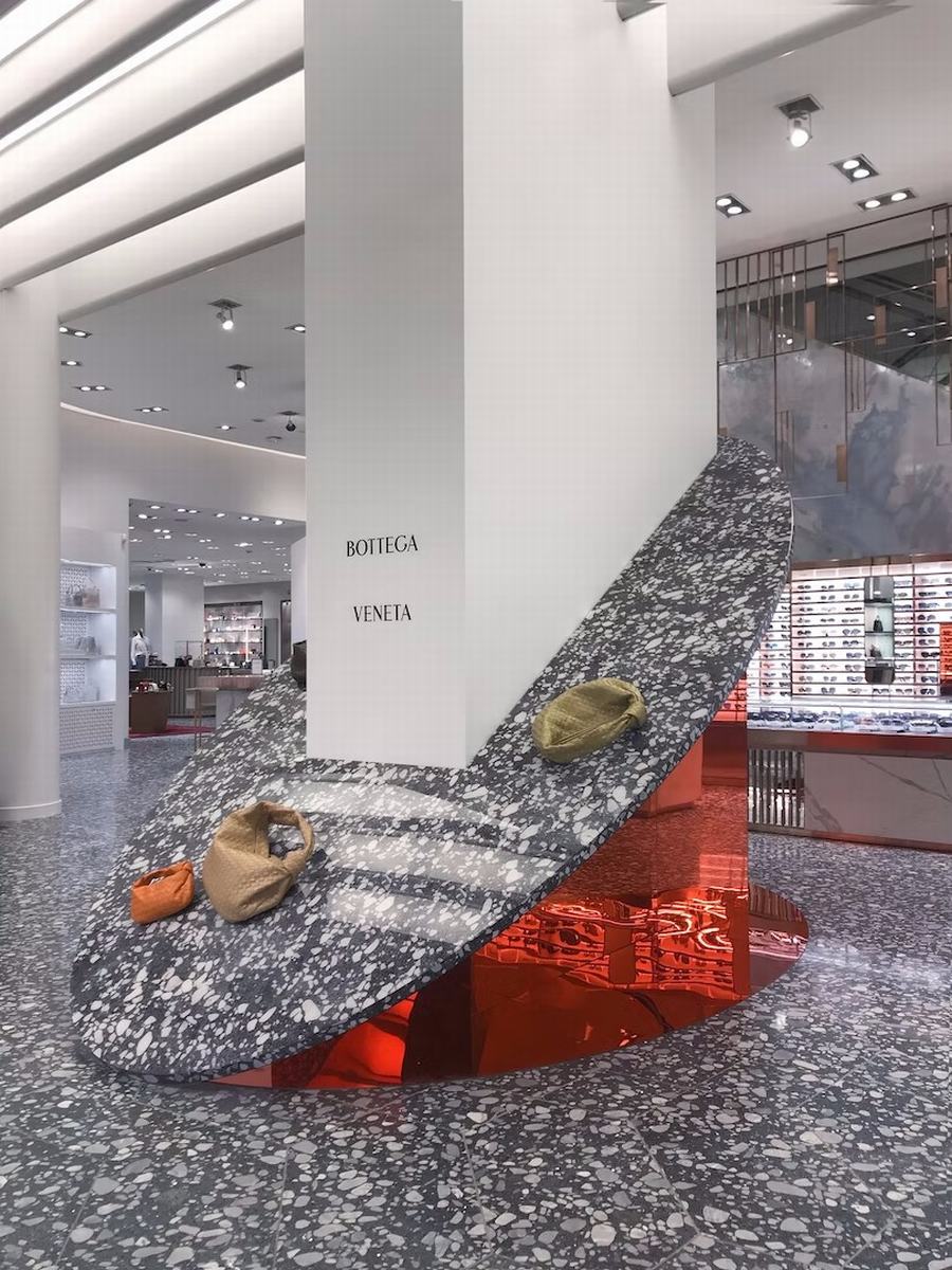 转型是我们收购的根源,萨克斯大楼的形状和形式成为我们的原材料。我们重新创造了各种建筑元素,允许它们根据Bottega产品的形状、重量和形式进行变形和变化,就好像这些物体可以重新调整它们接触到的任何表面一样。萨克斯第五大道百货和葆蝶家(Bottega Veneta)的灵感来自于3D的自由形态、液体世界——环境可以被复制,现实可以被扭曲——它们相遇并融合,创造了混合的、反重力的空间设计。