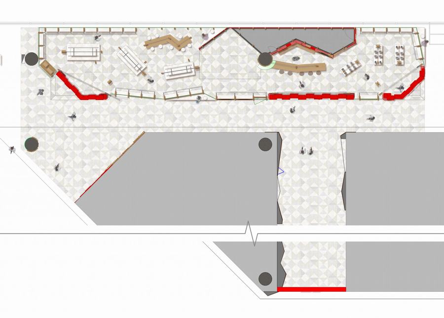 在室内,在随机的木柱之间安装了一系列固定装置,木梁连接了覆盖高达5米的柱子。随机配置的布局将创造额外的空间,其中长凳和桌子的组装,人们自然地聚集和利用各种原因,如阅读、休息、工作等。