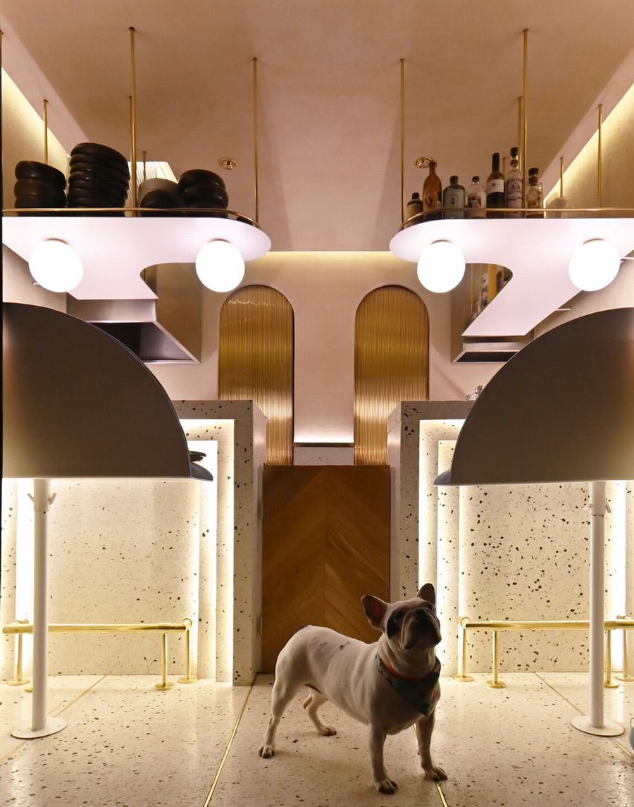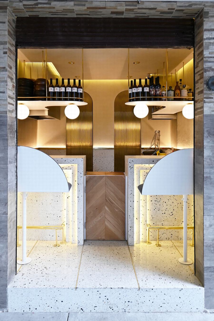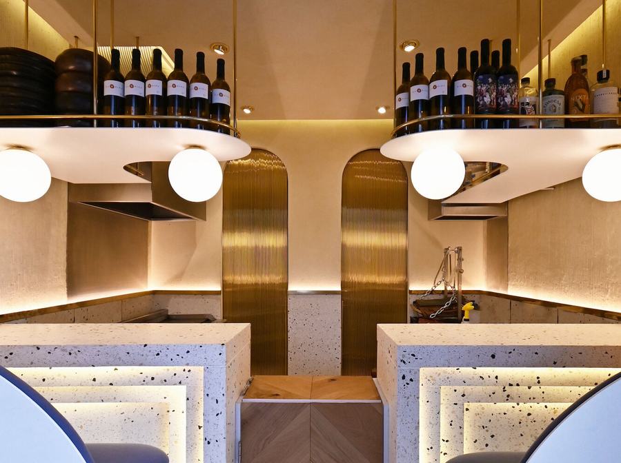 在吧台后面,有一个小的工业厨房,由两个拱门和两个滑动黄铜门组成的墙划分出冷热区,当打开时,气氛发生了变化,从金色过渡到深蓝色,激发一种感觉,让我们更接近大海。