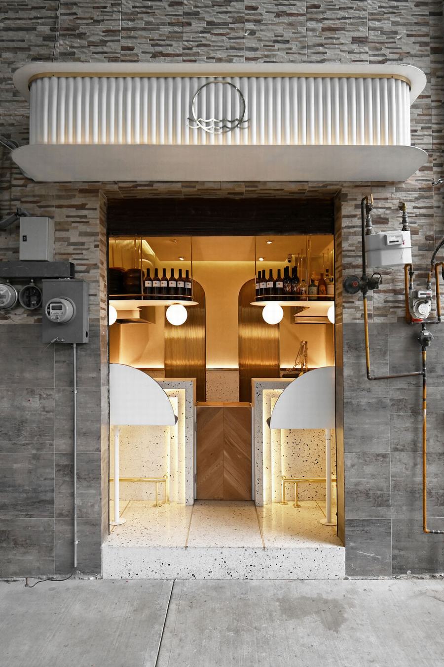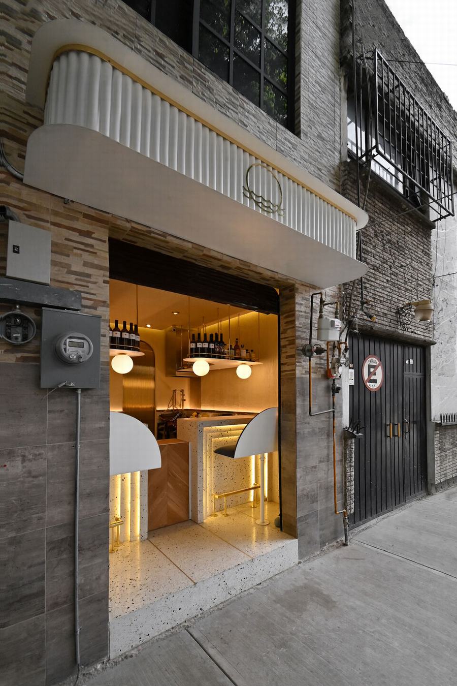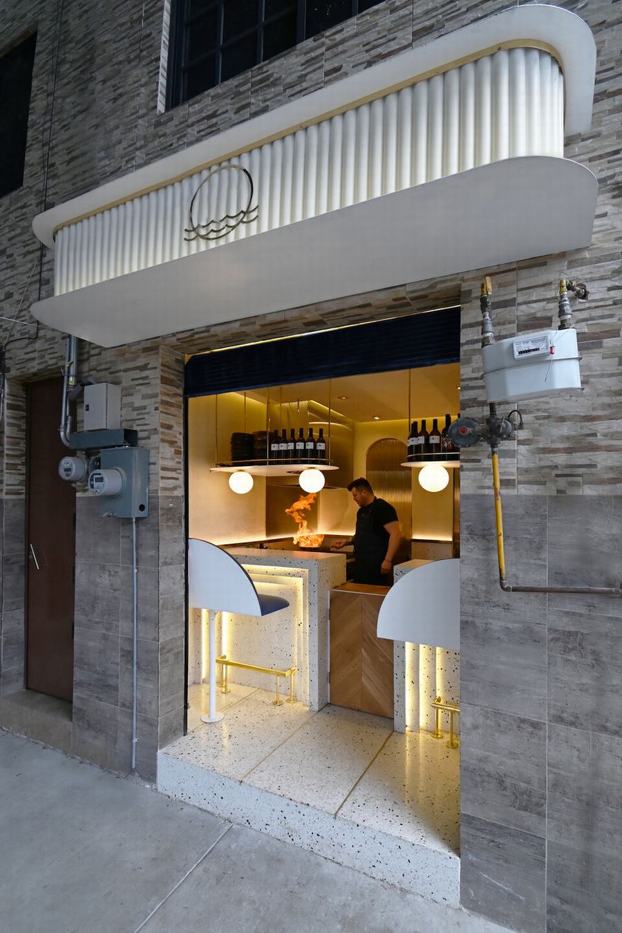 在吧台后面,有一个小的工业厨房,由两个拱门和两个滑动黄铜门组成的墙划分出冷热区,当打开时,气氛发生了变化,从金色过渡到深蓝色,激发一种感觉,让我们更接近大海。