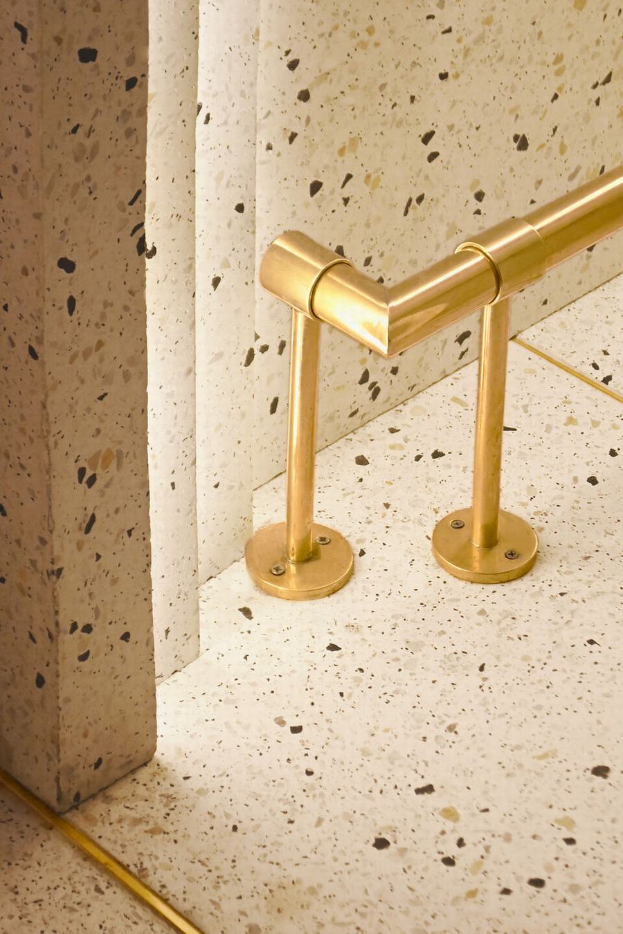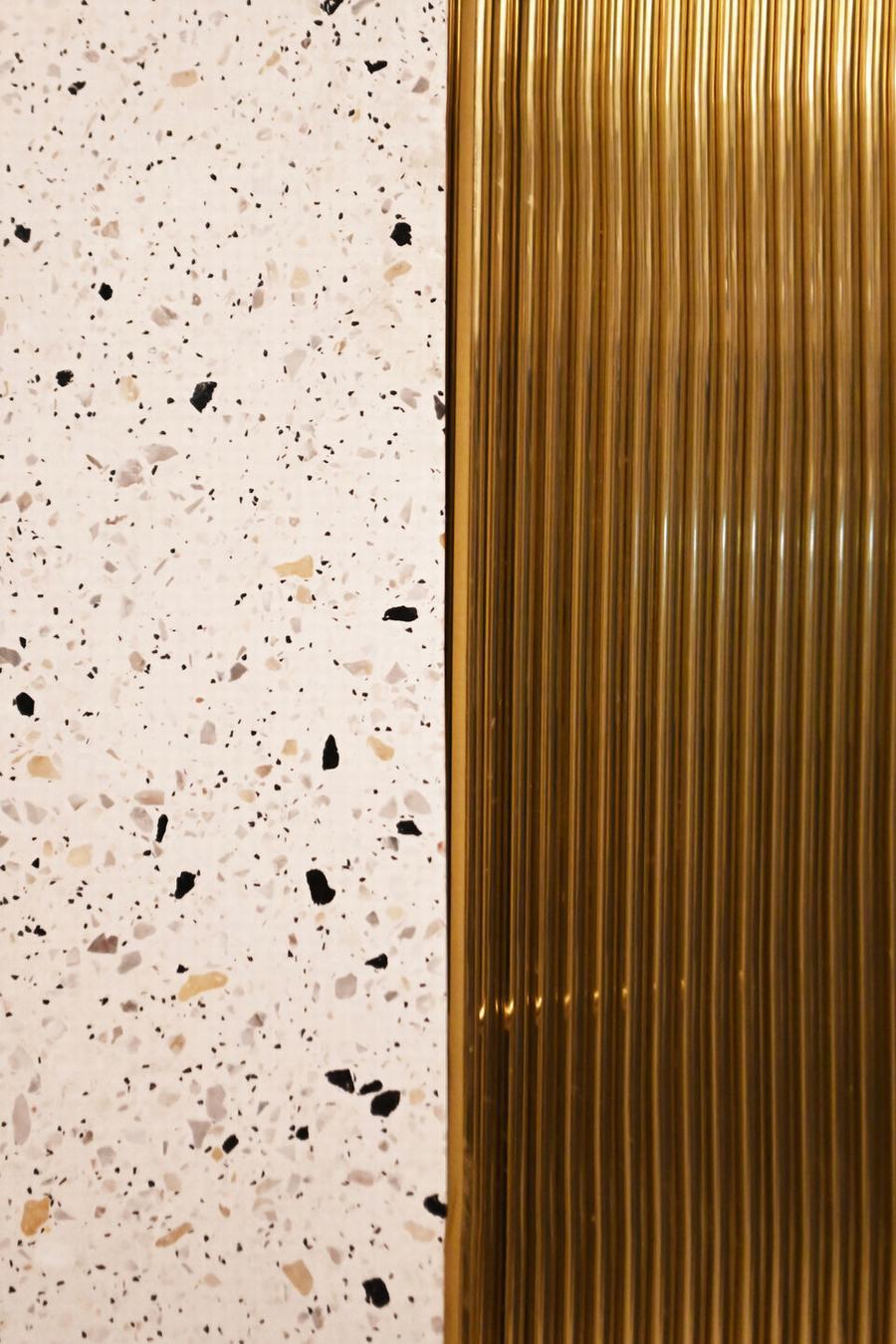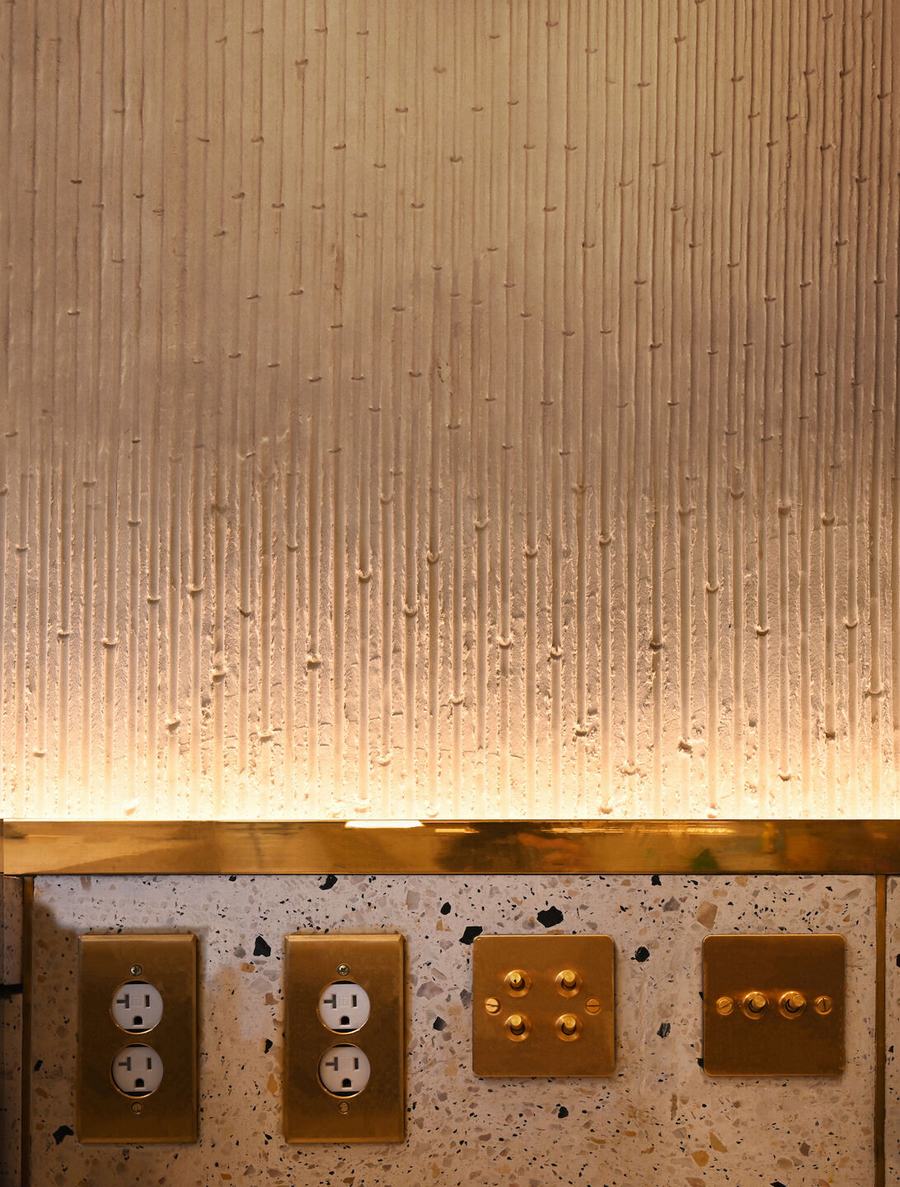 前面是由两只鹦鹉和高吧台组成的公共区域,可以容纳四名用餐者。地板、低栏杆和吧台由白色混凝土微水磨石与蓝色、黄色和灰色石头的混合物组成,这与我们在沙滩上发现的海滩和贝壳相呼应。墙壁的材料发生了戏剧性的变化,一个金色的黄铜圆包隐藏了一个光源,用竹子沐浴在有质感的墙壁上,投射出植物的纹理和从下面投下的阴影。