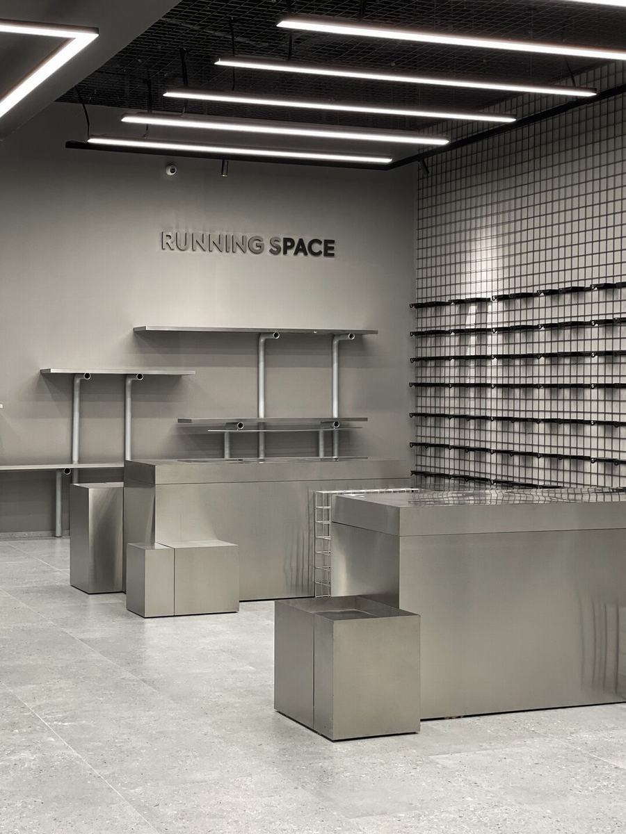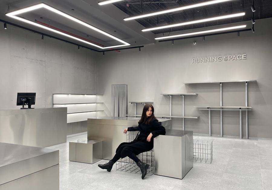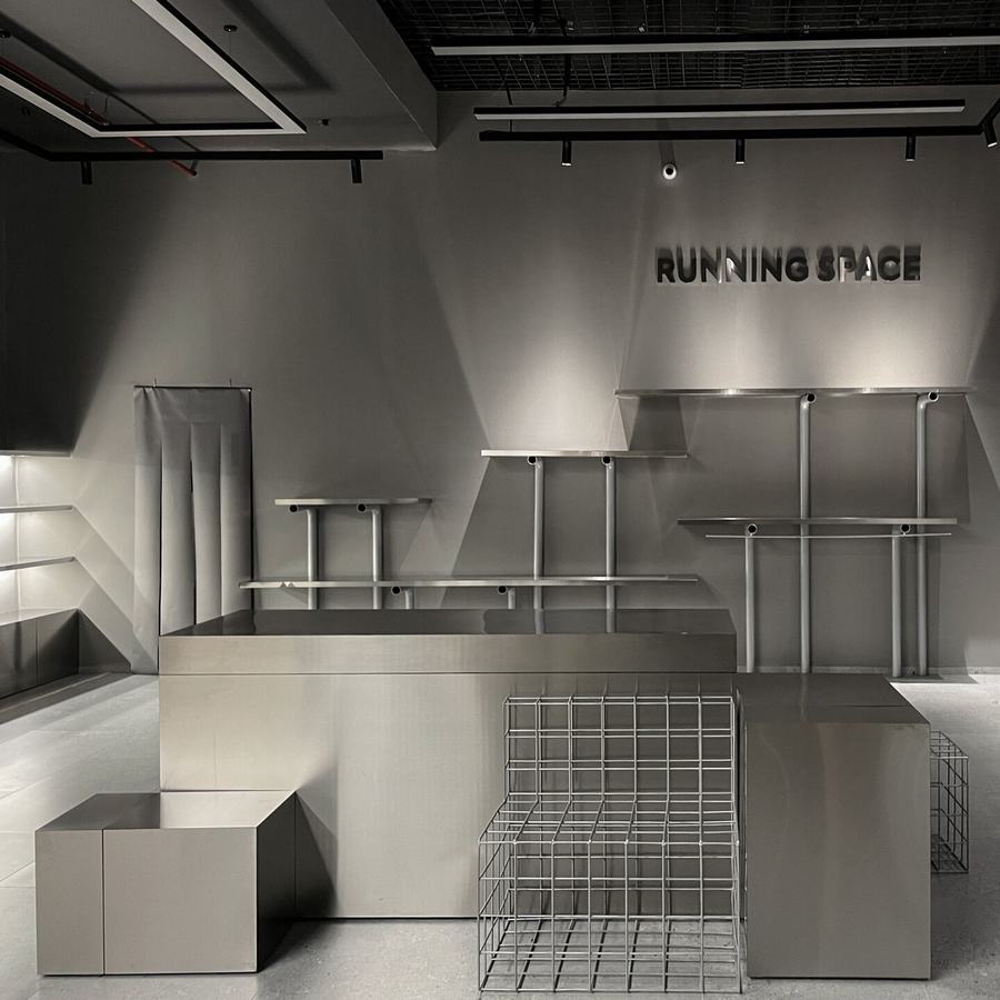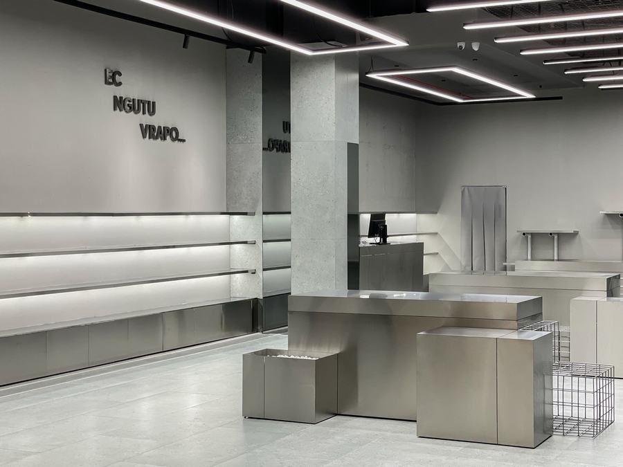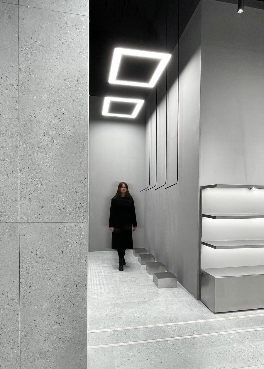 整个设计理念是通过使用灰色色调的“工业”材料来创造一个单色空间,优先考虑将展出的纺织产品。设计基于简单的理论原则,这体现在线性形式和材料的连接上,这些材料不是专门用于室内的,如:混凝土网格、金属水管、建筑钢筋、不锈钢板。
