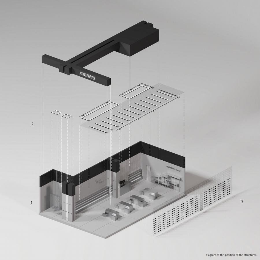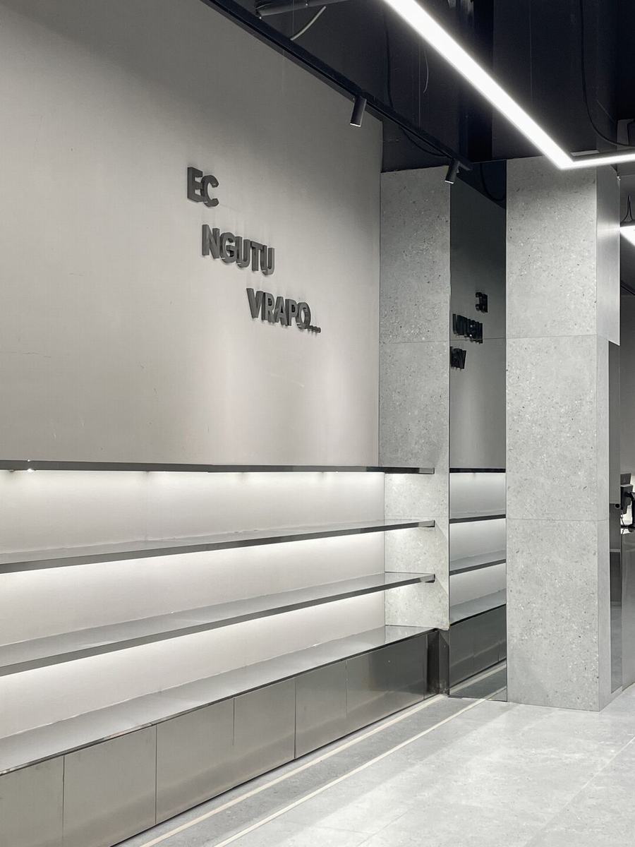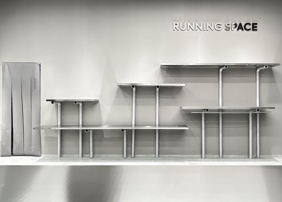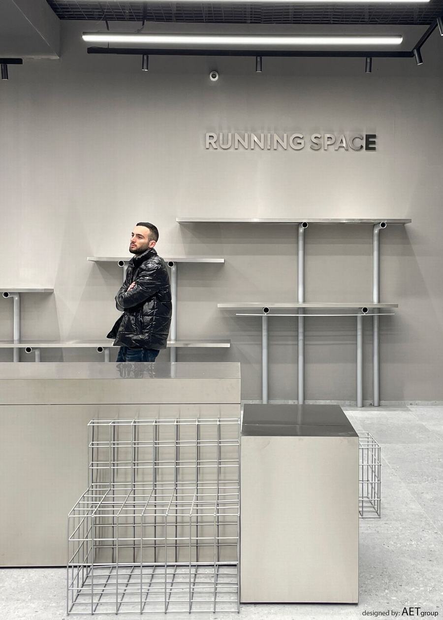 整个设计理念是通过使用灰色色调的“工业”材料来创造一个单色空间,优先考虑将展出的纺织产品。设计基于简单的理论原则,这体现在线性形式和材料的连接上,这些材料不是专门用于室内的,如:混凝土网格、金属水管、建筑钢筋、不锈钢板。