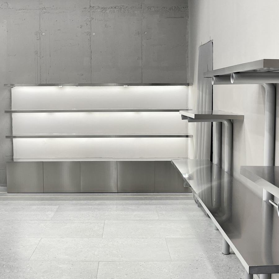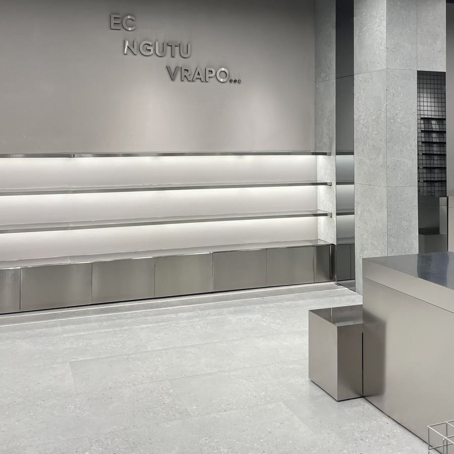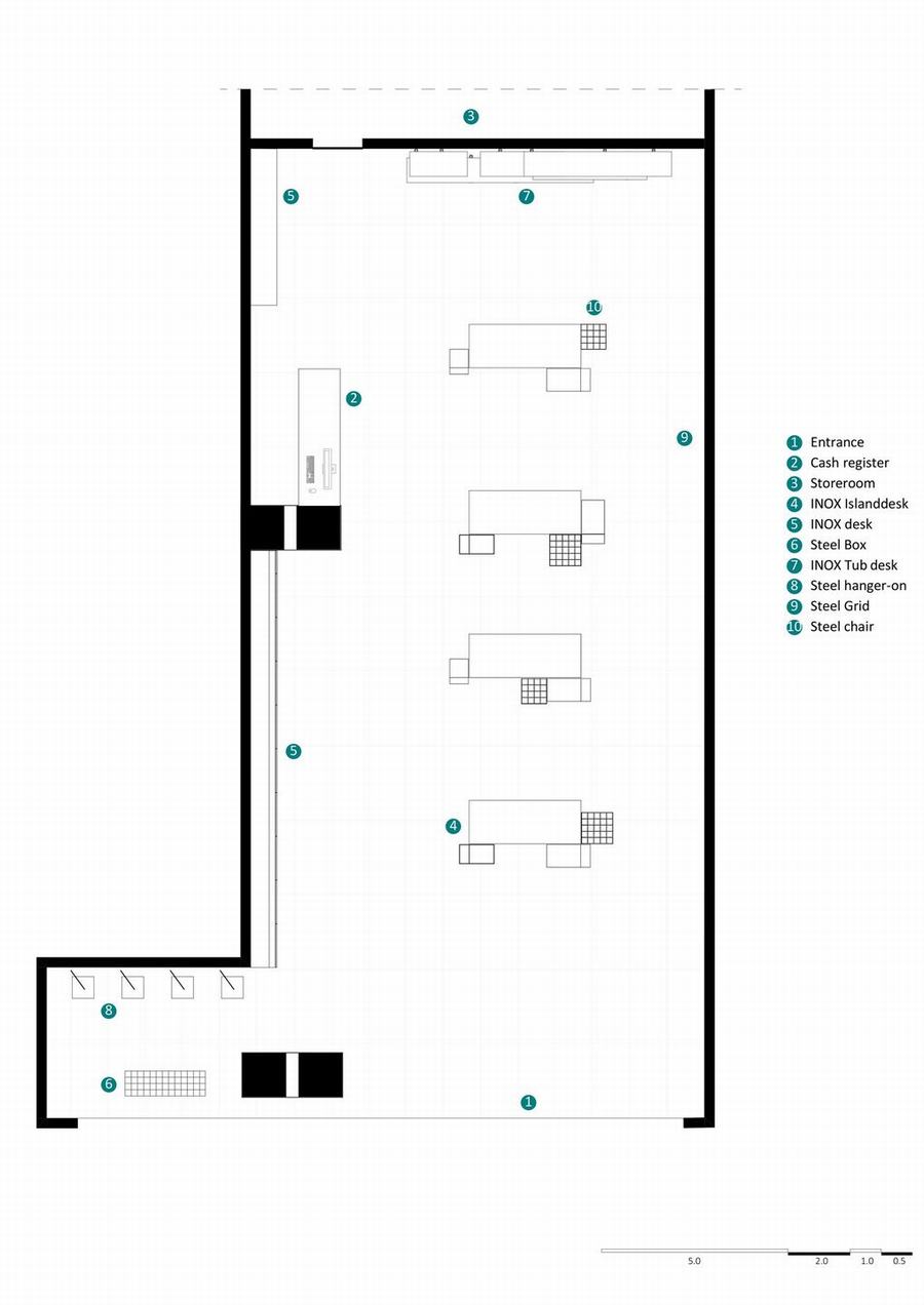 室内功能的设计是为了提供尽可能多的流通空间。149平方米的地面形状以1:2的比例延伸,有利于长度。为了平衡视觉体验,展示盒被放置在长度上。不锈钢货架在墙上以线性的方式,定位客户在空间。为了不给人留下无限空间的印象,天花板和对面墙壁的覆盖物由10x10cm的模块化钢筋混凝土钢材覆盖。