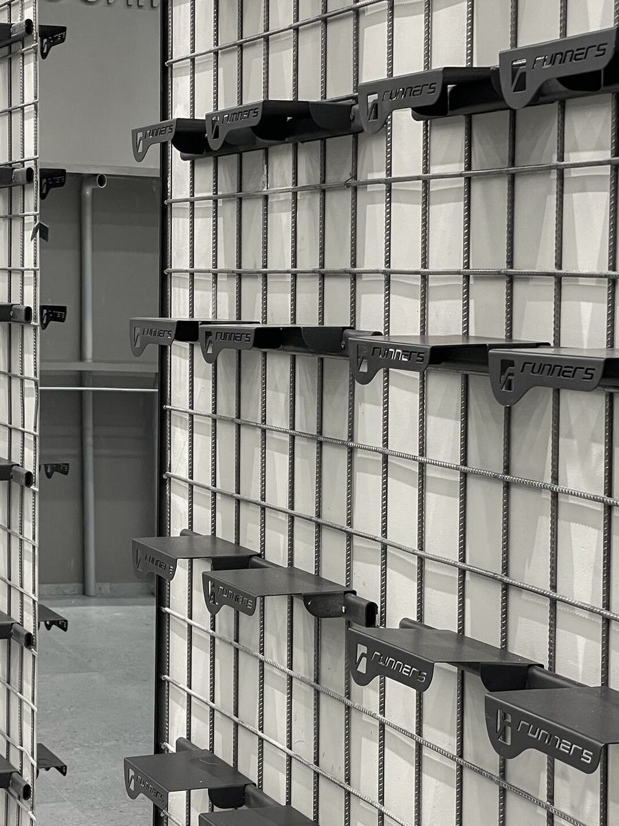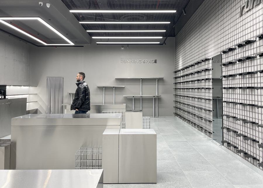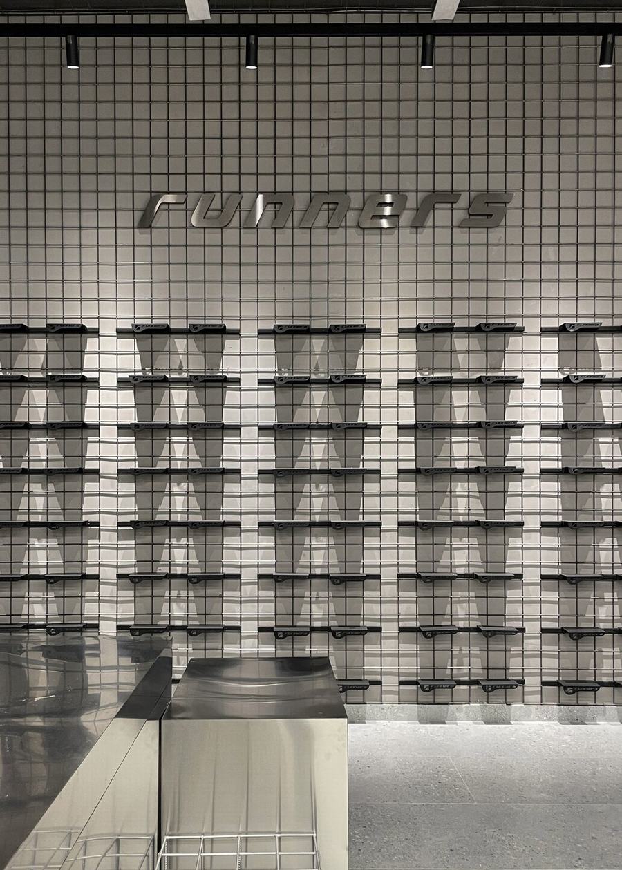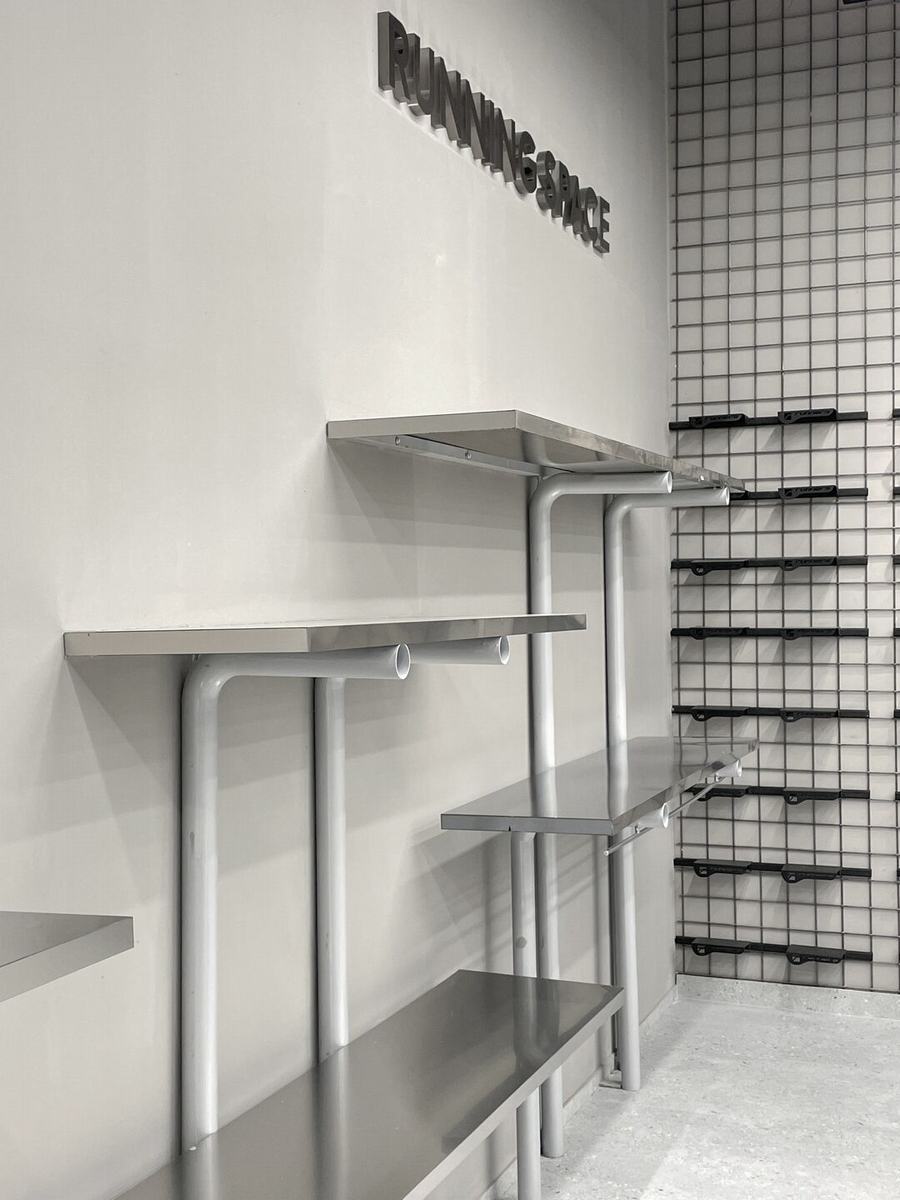 室内功能的设计是为了提供尽可能多的流通空间。149平方米的地面形状以1:2的比例延伸,有利于长度。为了平衡视觉体验,展示盒被放置在长度上。不锈钢货架在墙上以线性的方式,定位客户在空间。为了不给人留下无限空间的印象,天花板和对面墙壁的覆盖物由10x10cm的模块化钢筋混凝土钢材覆盖。