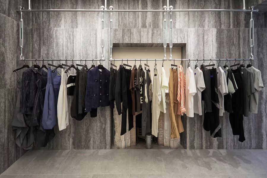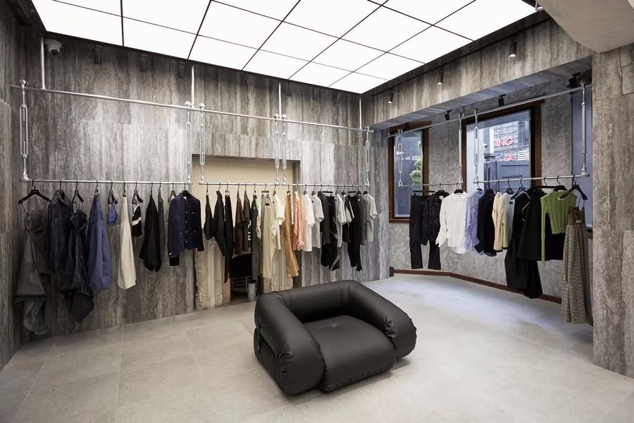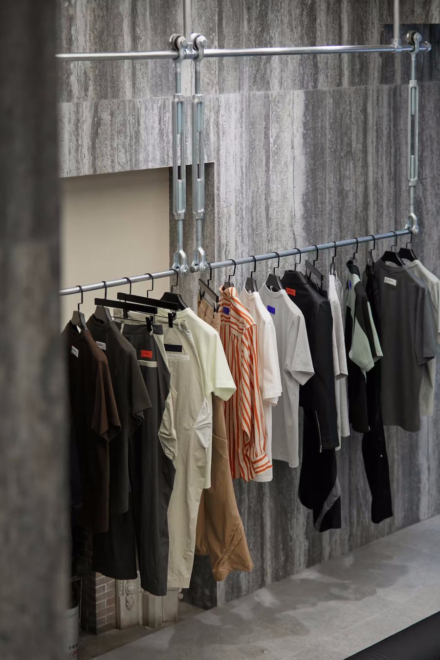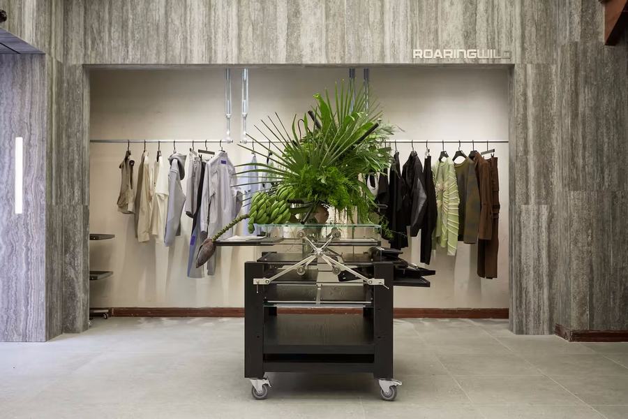 在品牌店铺的首层空间,ROARINGWILD的主线产品在这里展示。大面积的莫兰迪灰度颜色和新锐高饱亮色进行碰撞,产生了强烈的对比效果。