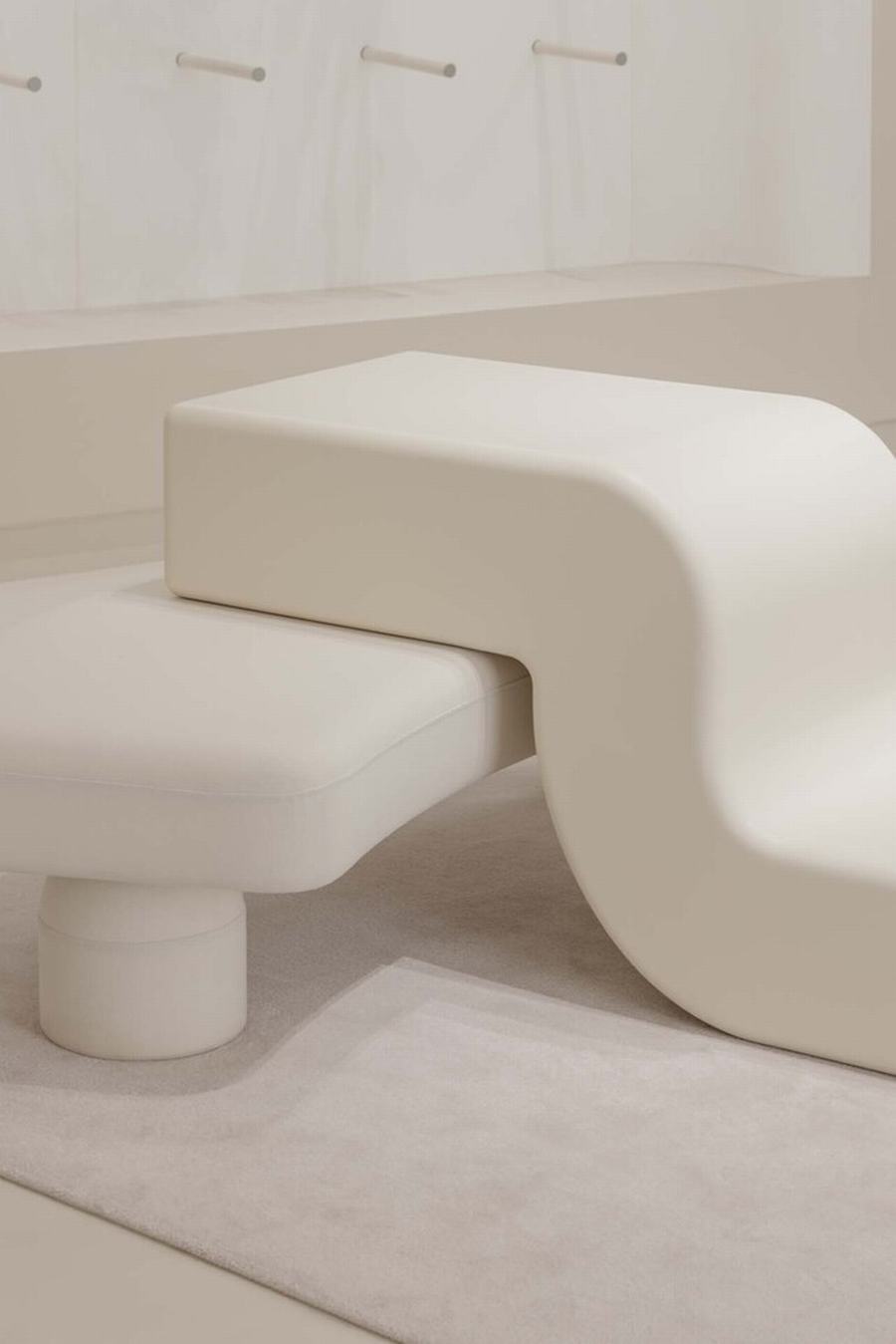 一进门,结构道具分布在每一个截面积,与柔和米色的统一形成对比的视觉效果。借助道具生成的不同区域,形成简洁、流线型的循环;在道具造型上,无论是“u形石雕道具”还是不规则的“枕头道具”,我们都尽可能的软化了表面凸出的部分,以弧形的形态对应整个空间。此外,现有的柱子采用了柔软的表面处理,与宁静的商店氛围相吻合。为了打造完整的门店体验,微水泥材料和橡胶质感的弹性涂料贯穿整个门店,强调“像你的皮肤一样,舒适,关怀与保护”的品牌理念。