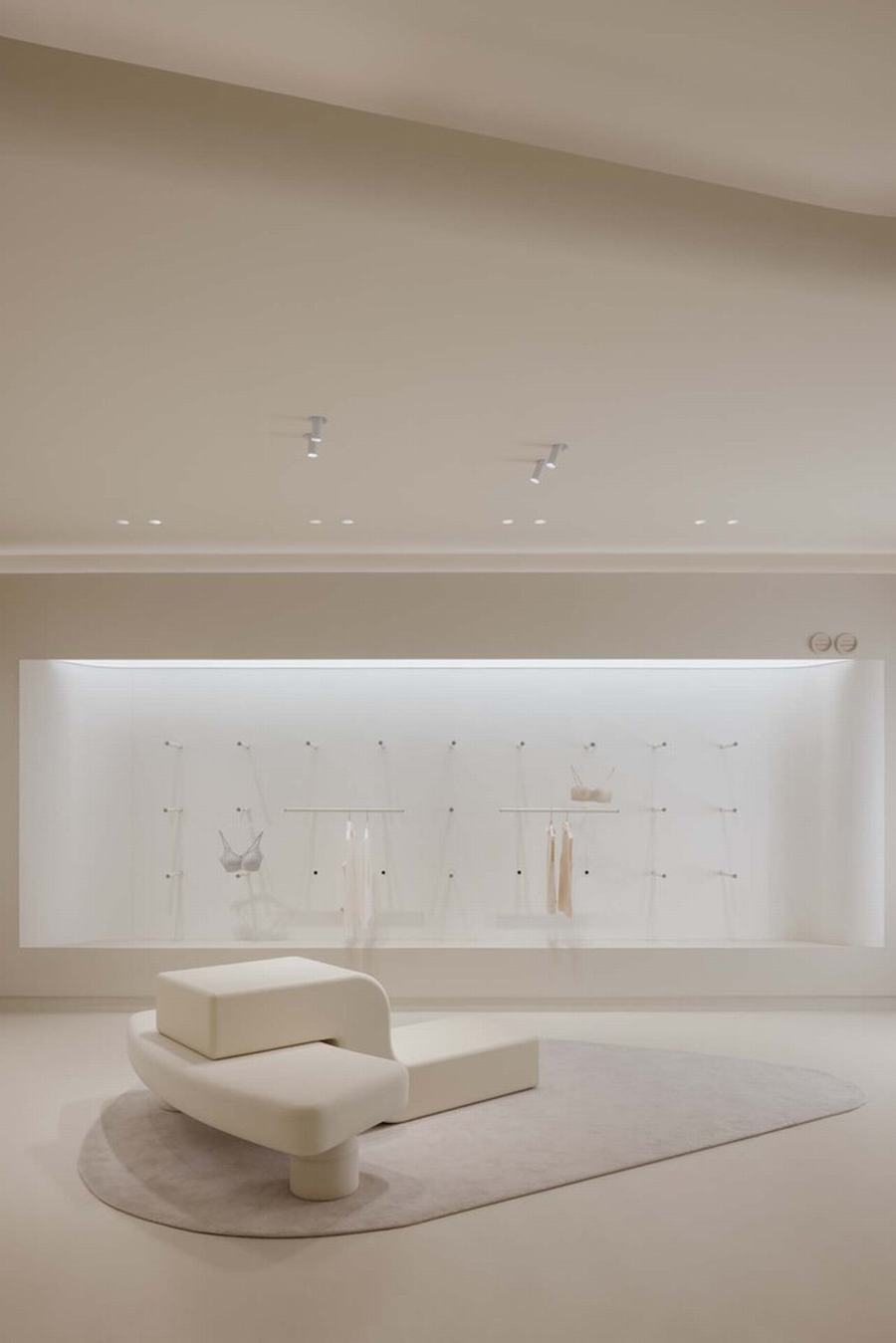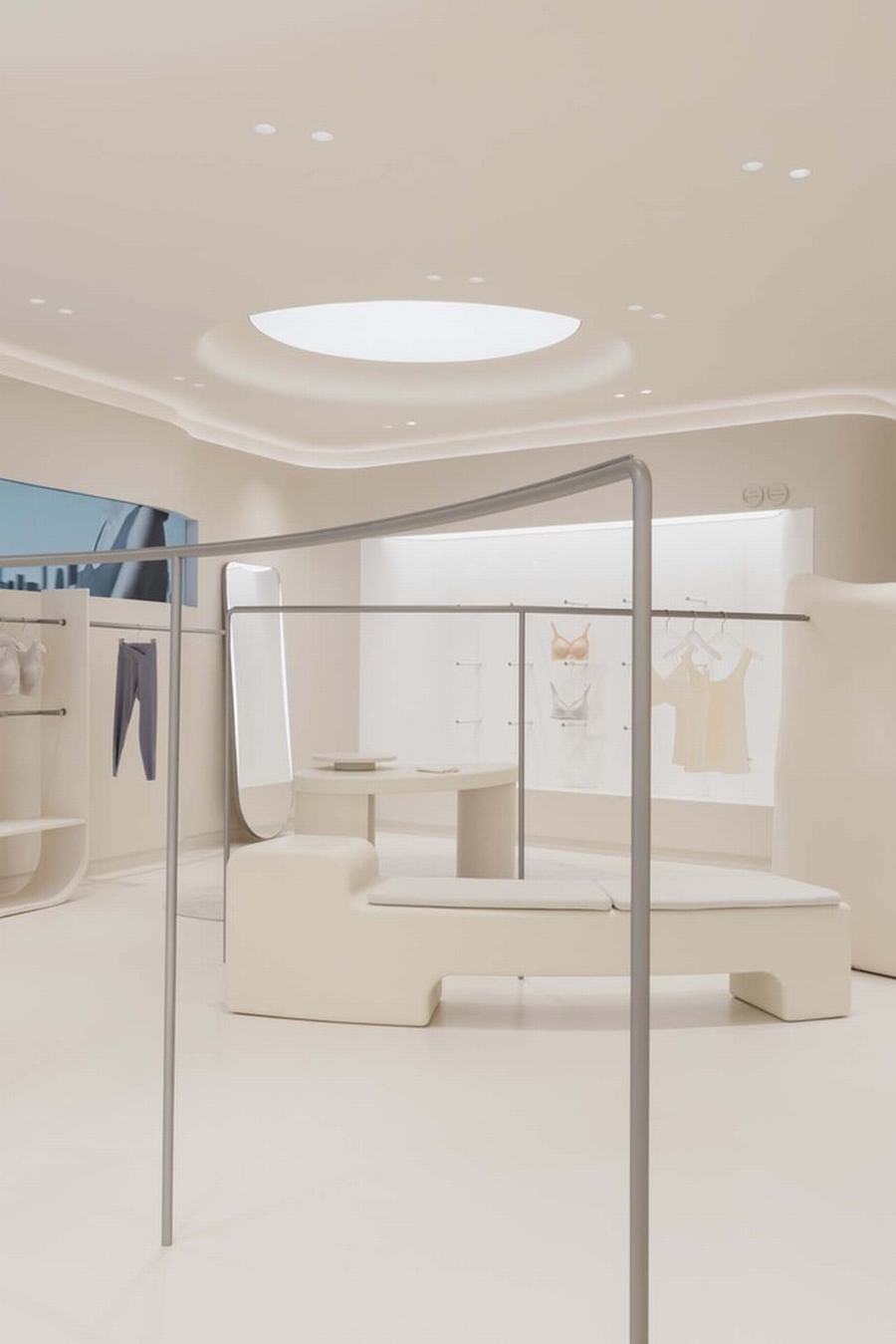 “感受细微”——所有的展示墙都采用柔软的材质,配合周围弧形的光带,提升了人在店内旅途中柔软细腻的感觉。照明系统在白天和夜晚采用多种模式,以模拟周围环境光源的亮度为原则,同时也提高了整个空间的视觉舒适度。与品牌标识相一致,“u”形通过门、门把手、镜子、展示道具、货架以及边缘和角落的柔软细节被强调,为顾客创造一个舒适的环境,就像贴身的衣服一样。同时,我们希望传递一种感觉,每个空间使用者都可以在日常生活中或通过微小的细节体验精致的美。