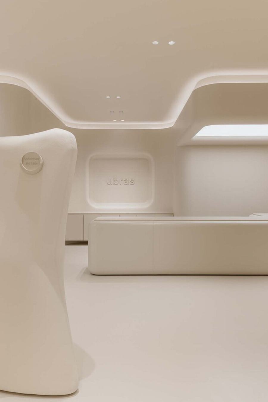 “包围与支撑”——繁华而充满活力的淮海中路由高度的商业集中度组成,每个店铺的立面都向道路延伸。Ubras概念店的外观经过了精心的退退,将街道还给了城市,同时也为人们创造了一个温馨的空间。设计师放置了一面简单、弯曲的夜光墙,弱化了商业氛围,为来访者引入了一个舒适、关怀的前厅空间。品牌符号也逐渐显现在入口,顶部的u形光膜和滑动门上的u形把手,唤起沉浸式商店体验的开始。