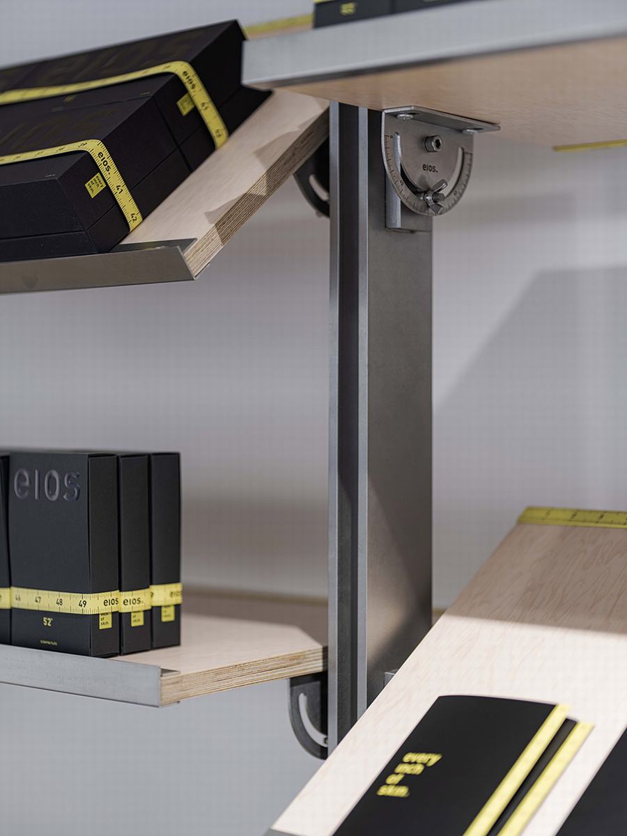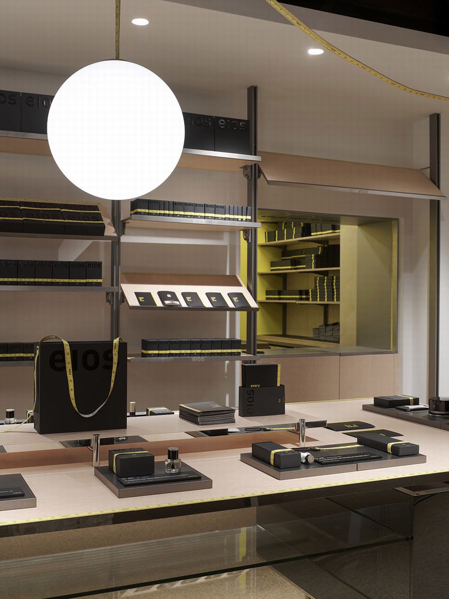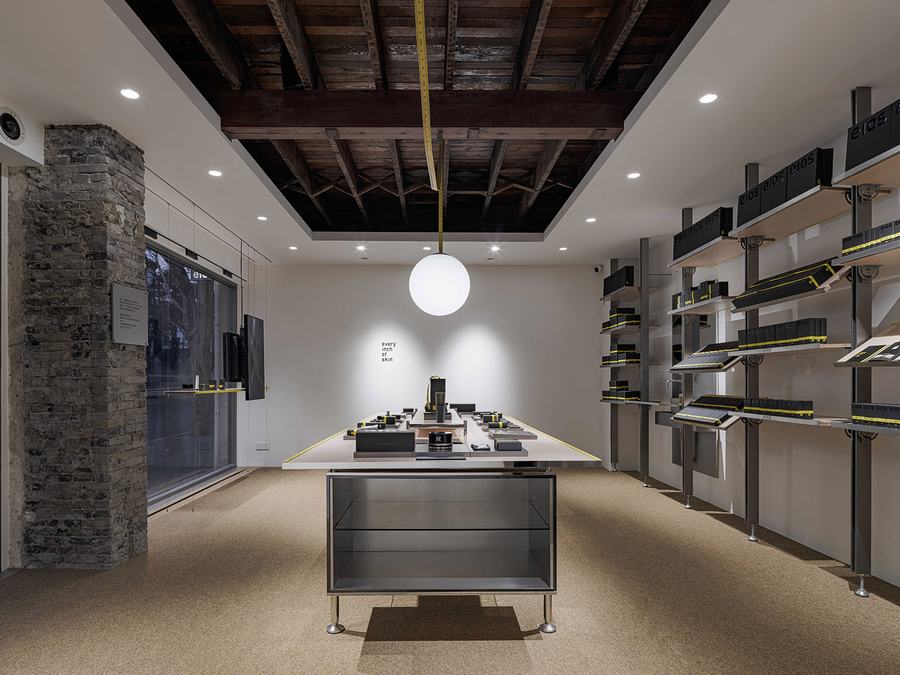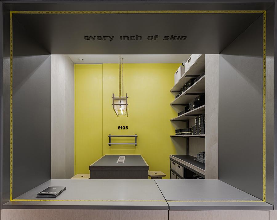 品牌标志性的黄色卷尺被巧妙地运用在整个设计中,从入口的吊坠线到收银台装饰的窗口开口,呼应了品牌的口号“每一寸肌肤”。定制的家具被设计成刚刚好大小,丰富而精确的设计细节允许灵活的可用性。这体现了品牌精益求精的理念。