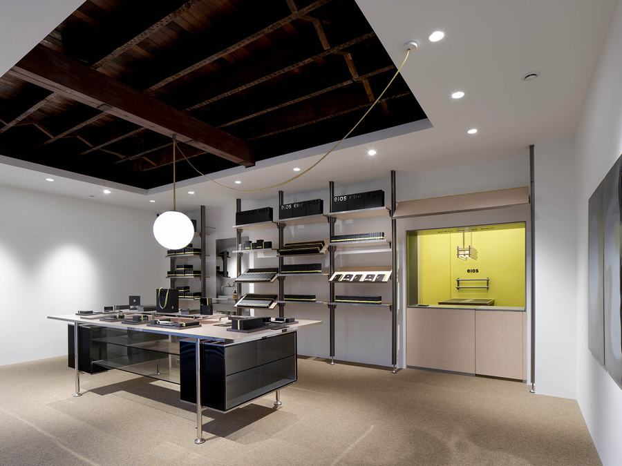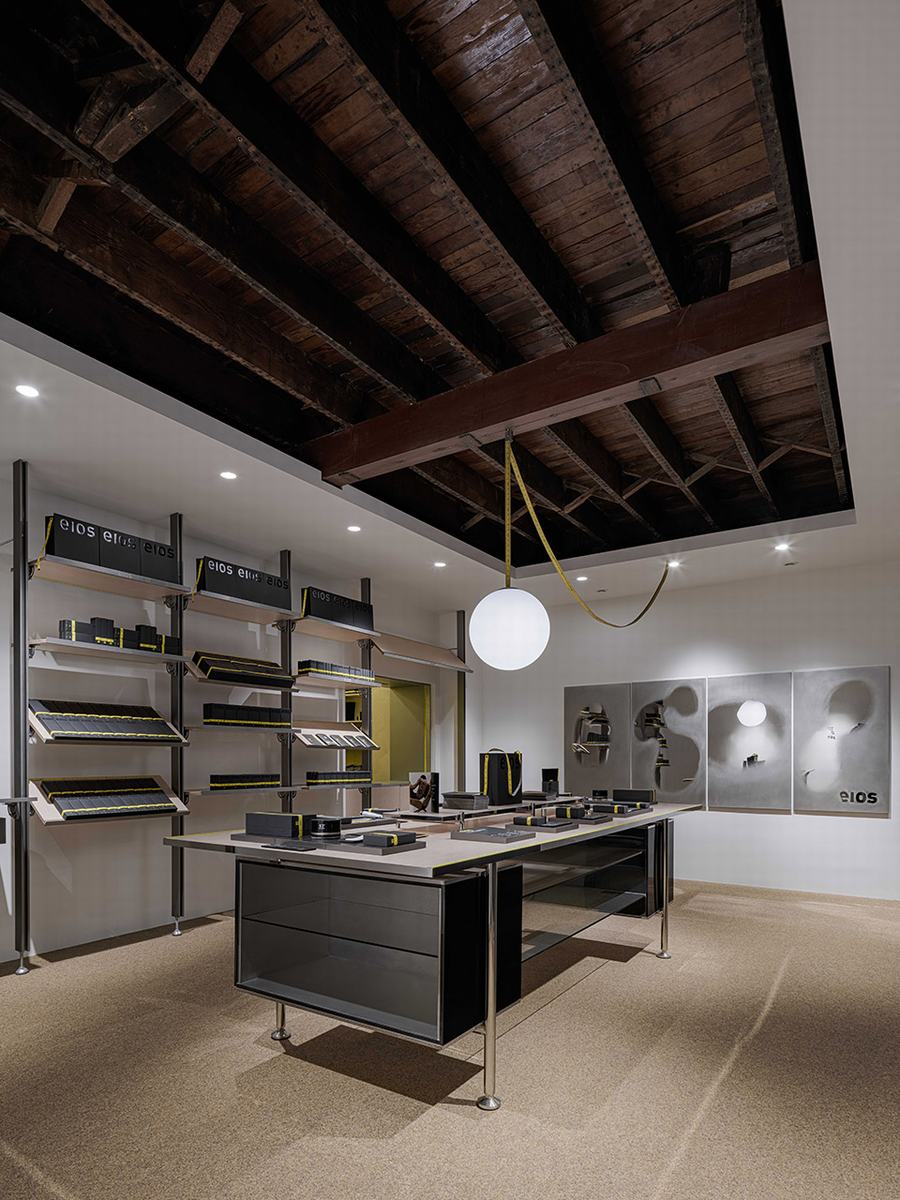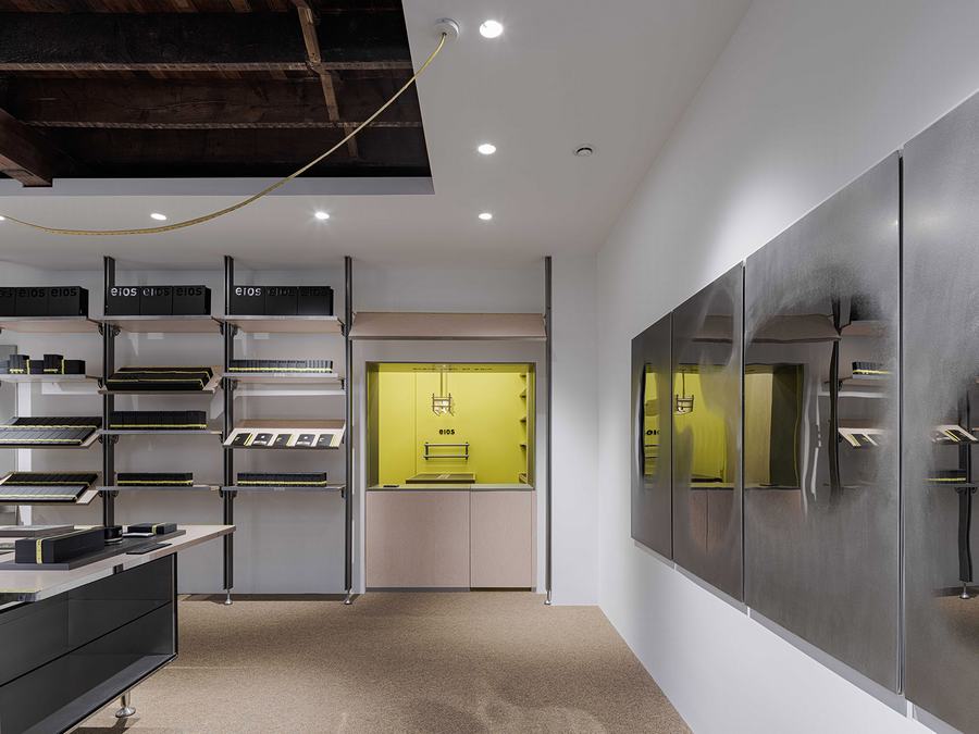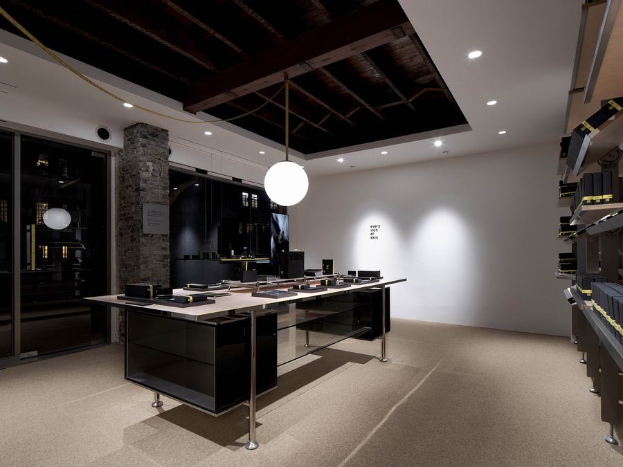 品牌标志性的黄色卷尺被巧妙地运用在整个设计中,从入口的吊坠线到收银台装饰的窗口开口,呼应了品牌的口号“每一寸肌肤”。定制的家具被设计成刚刚好大小,丰富而精确的设计细节允许灵活的可用性。这体现了品牌精益求精的理念。