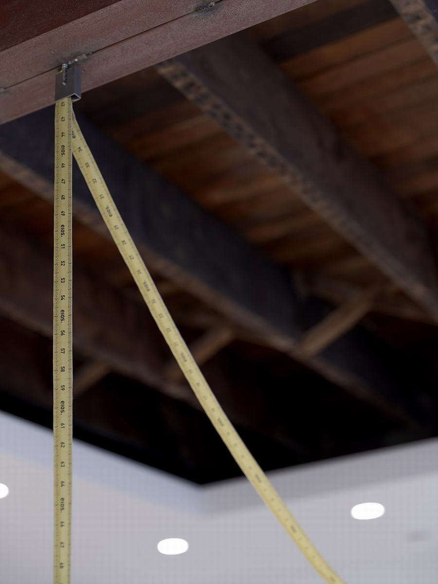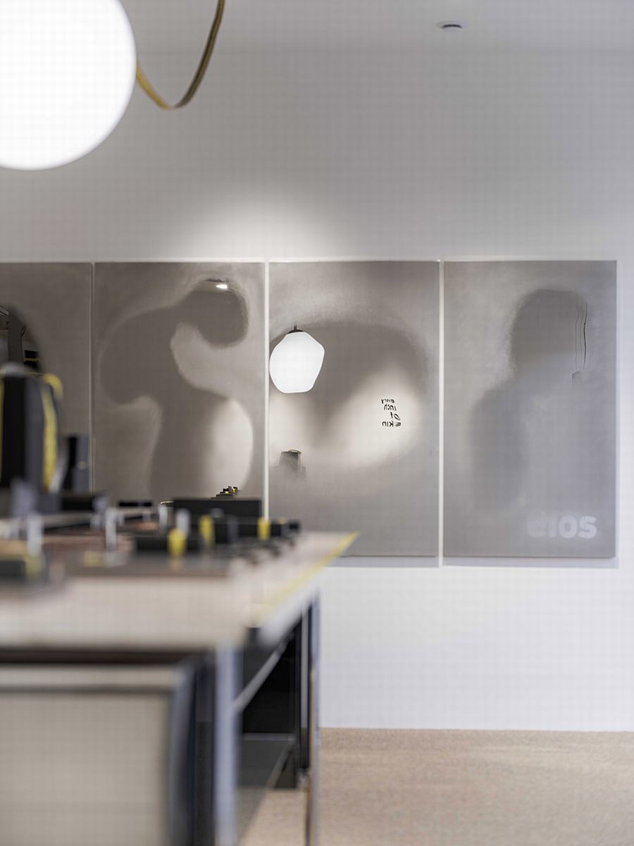 悬在岛上的吸顶灯以柔和的圆形消解了空间的硬朗线条,将空间装饰得如同一件饰品。吊坠灯的常规电线被改造成品牌的标志性卷尺,在突出品牌符号的同时保证了功能性。