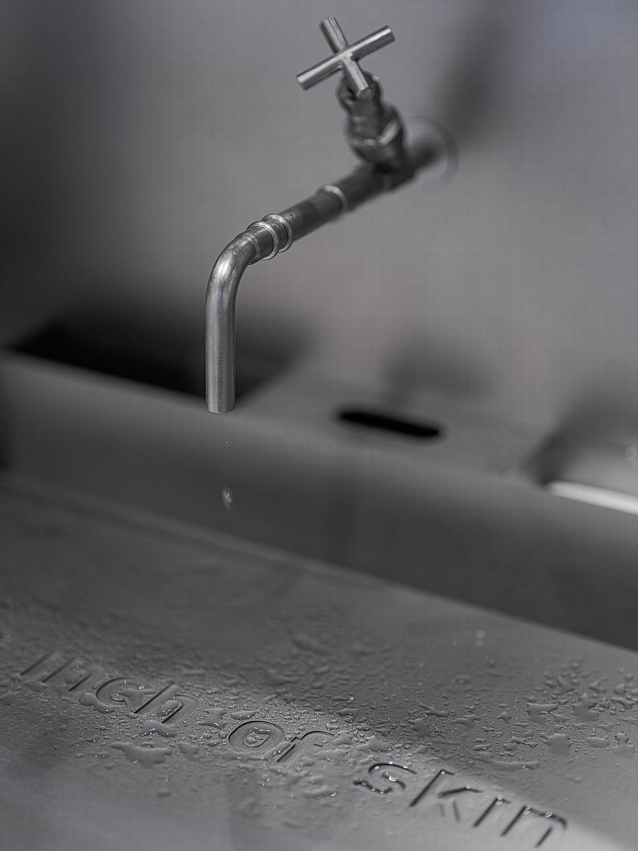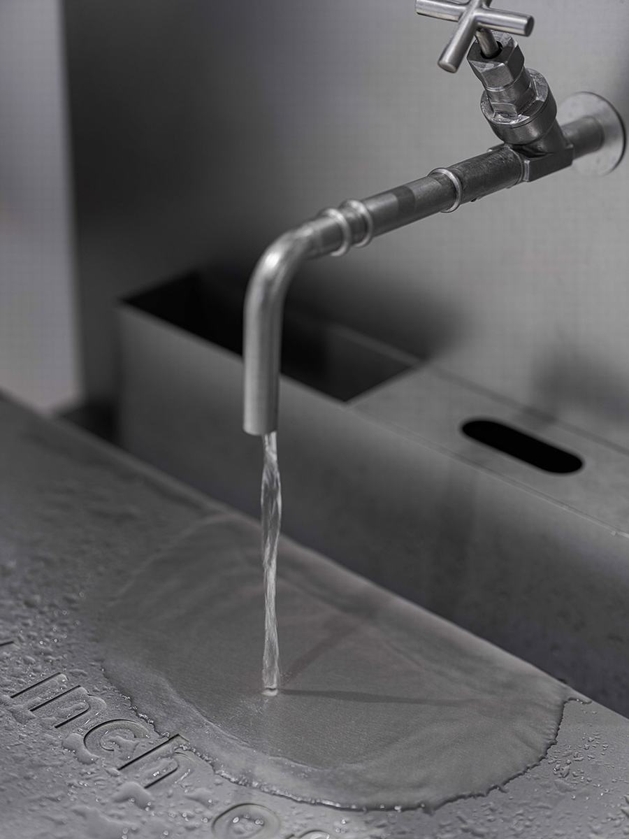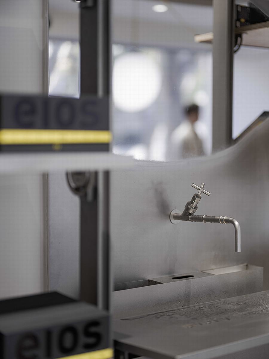 中岛对面的墙壁展示架系统既是陈列柜,也是洗手盆。金属材料在视觉上的延续回到了本质功能。为了适应不同的需求,金属件设计为通过转动表盘来调节机架角度。