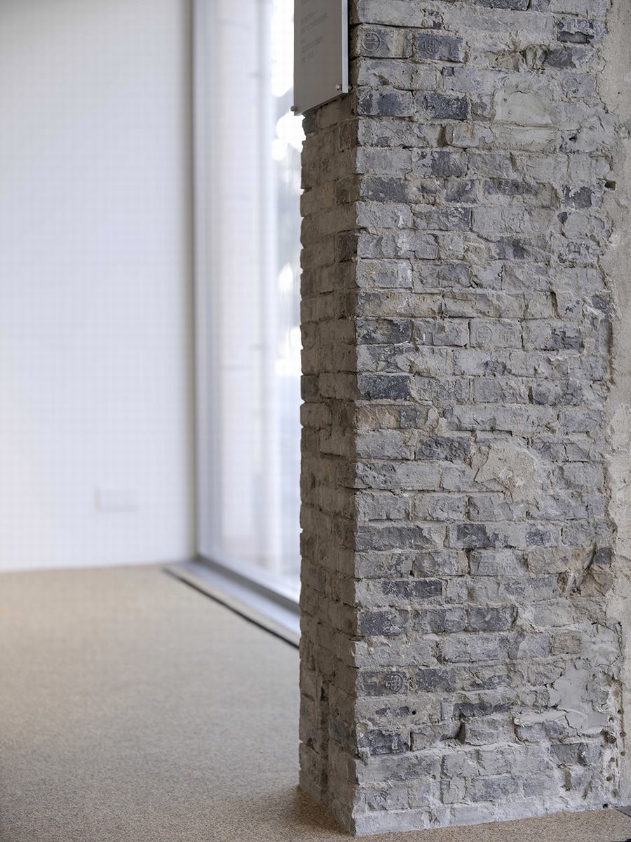 全透明的立面处理模糊了内外的界限,给人平等、开放和舒适的印象。室内视野开阔明亮,路过的行人形成了流动的景观。空间中古色古香的木质天花板和砖石立柱自然流露,为理性的设计增添了一丝感性的存在感。设计在当下更新历史,新与旧在空间中交织,等待故事的展开。