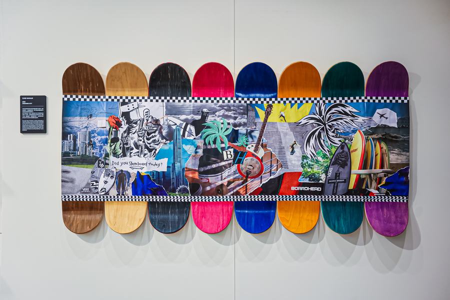 店铺的设计灵感源自深圳的围屋和围堡建筑,天花板上的开口设计则是一种完美致敬,它仿佛将客家人在建筑群生活中的俯仰视角再现。此外,在商品区的艺术墙上展示了8块滑板,按顺序排列成一个有趣且形象的深圳地理结构地图,从而将当地滑板文化和深圳城市文化相结合。值得一提的是,在艺术墙的设计过程中,店铺还邀请了本地著名滑板品牌负责人王汇丰和涂鸦艺术家Rock Lee参与设计,为这个创意空间注入了更多灵性和生命力。