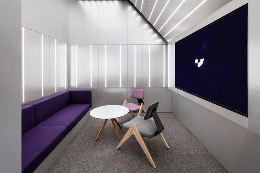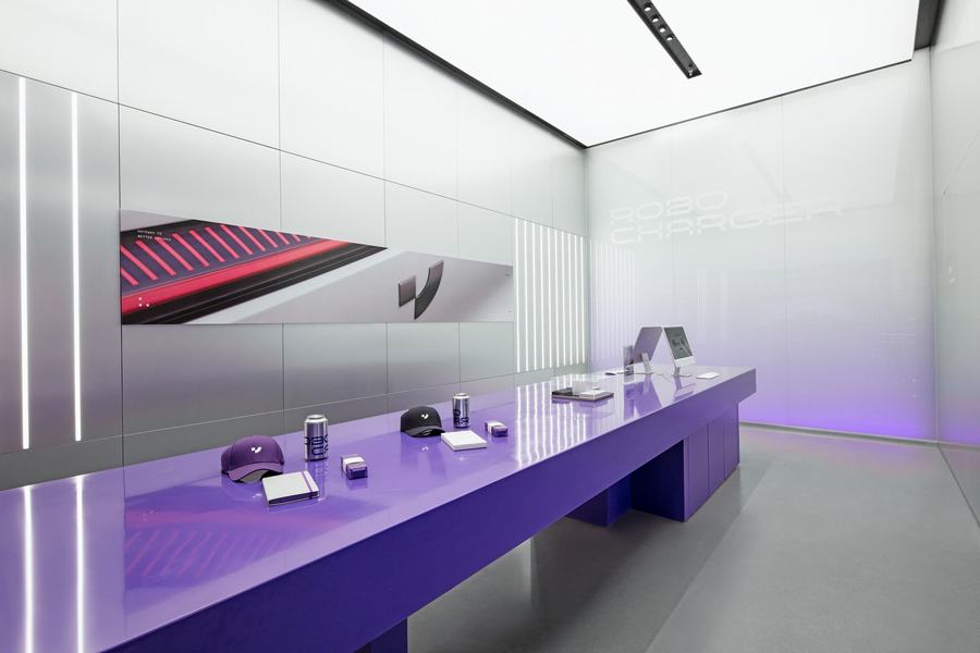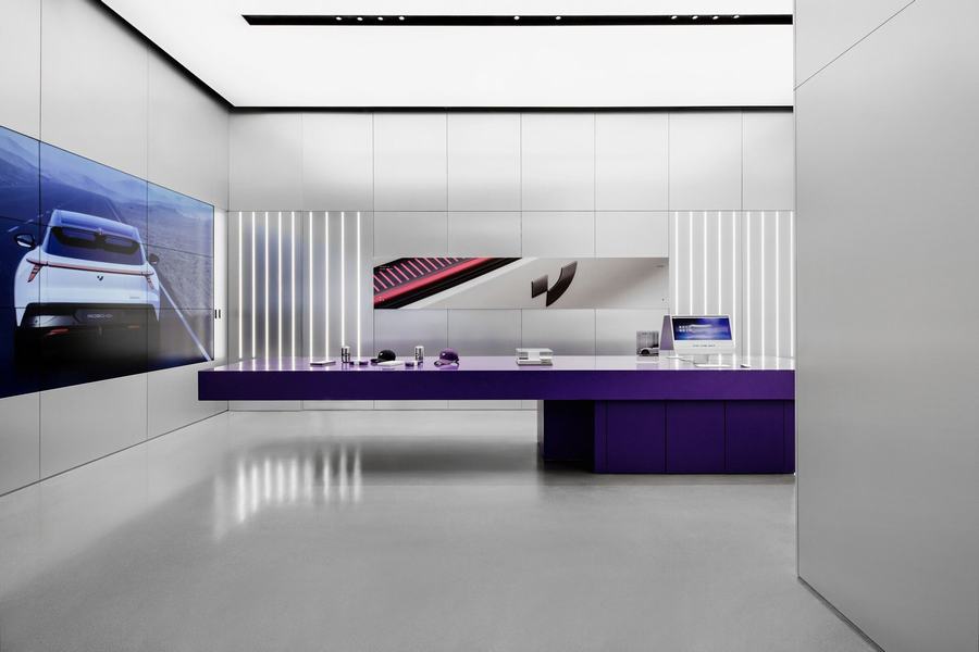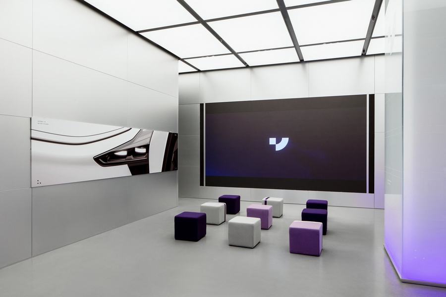 活动区域为活动、电影展示和交流提供了一个论坛。墙壁和天花板上的方形网格和立方体座位点缀着,我们以像素为主题,唤起人们对电脑游戏、技术和人工智能的联想。在工作室区,潜在的买家可以更深入地了解柔道的世界。汽车零件、颜色样品和材料变化在一个超大的桌子上以典型的JIDU紫色呈现。未来的ROBOCAR车主可以在这里个性化他们的汽车,这将在他们眼前的大屏幕上实时投影。