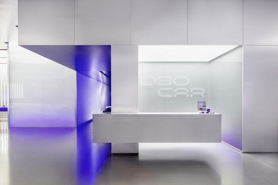 通往未来的旅程从咖啡厅开始,这是一个立方体的门厅,有两个开口,可以第一次看到不同的ROBOCAR模型。在这里,顾客在第一次接触汽车之前,会受到吉度品牌大使的欢迎,并喝上一杯清爽的饮料。受到ROBOCARs的金属表面的启发,展示区域也具有金属外观。在这种背景下,车辆模型被呈现为可接近的欲望对象。参观者第一次体验到真正的前沿技术的兴奋感——就像来到了未来。