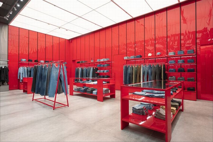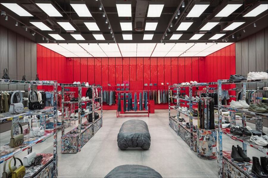 这家红色商店呈现出一种独特的视觉效果,吸引着顾客的目光。在内部设计上,迪塞尔不仅展示了最新概念,还以红色为主题,营造出活力和激情的氛围。充满创意和艺术感的陈列方式使得商品更加突出,给人留下深刻的印象。