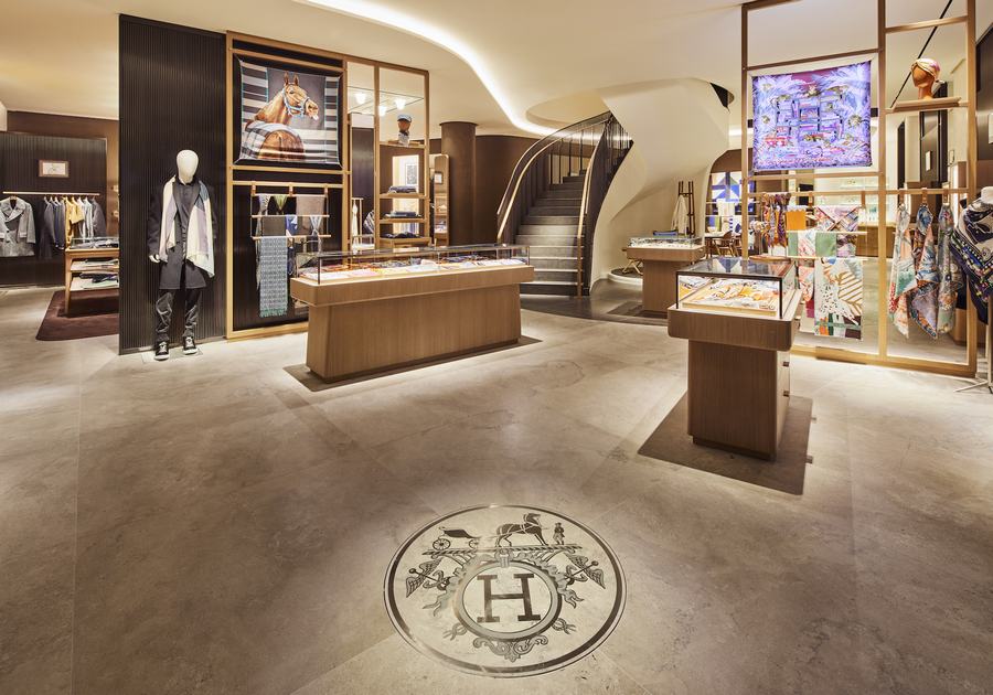 这家Hermès商店的设计充满了创意和奢华感。一进入商店,顾客们会被男士和女士的丝绸产品所迎接。柔和的希腊灯光营造出宜人的氛围,将顾客引导至左侧的男士成衣区。这里展示着Hermès精心打造的男士时尚系列。而右侧则是时尚珠宝区和香水区,顾客可以在这里领略到Hermès的珠宝艺术和香水魅力。灰泥涂层上的浮雕Faubourg图案更增添了独特的视觉效果。
