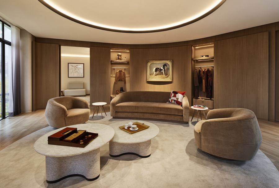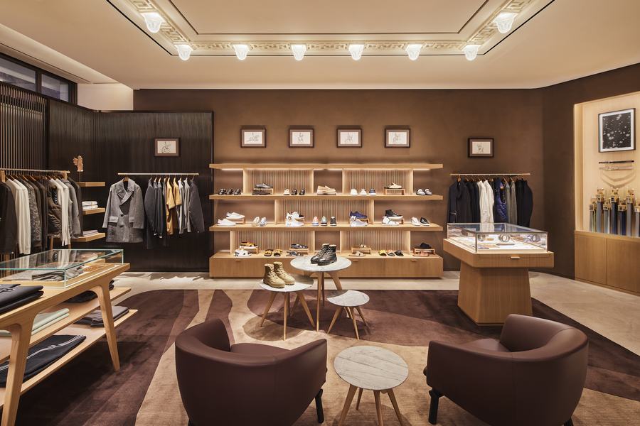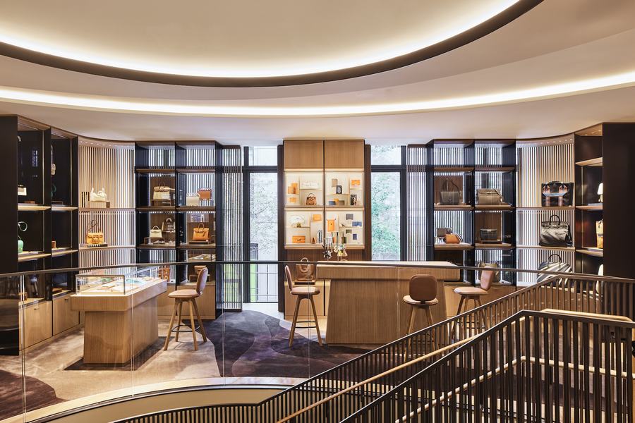 除了服饰和饰品,这家商店还展示了Hermès的家庭用品系列。通过巧妙地利用原有的弯曲楼梯平台,设计师们创造了一个极具创意的展示空间。家庭用品系列的展示区位于中央,其结构被保留,包层经过改造,呈现出波动的形态,仿佛将湖上的风浪传达到内部分区和天花板之间。顾客可以在自然光的照耀下,欣赏到皮革制品、手表和珠宝的展示区。而舒适的黑巧克力毡层和棕色地毯则与女鞋、成衣和马术配饰区域的较轻地毯形成鲜明对比。